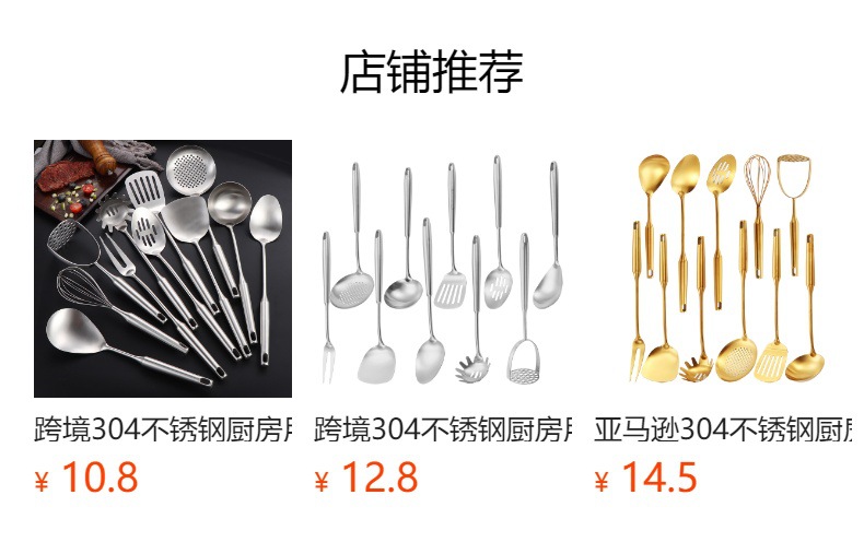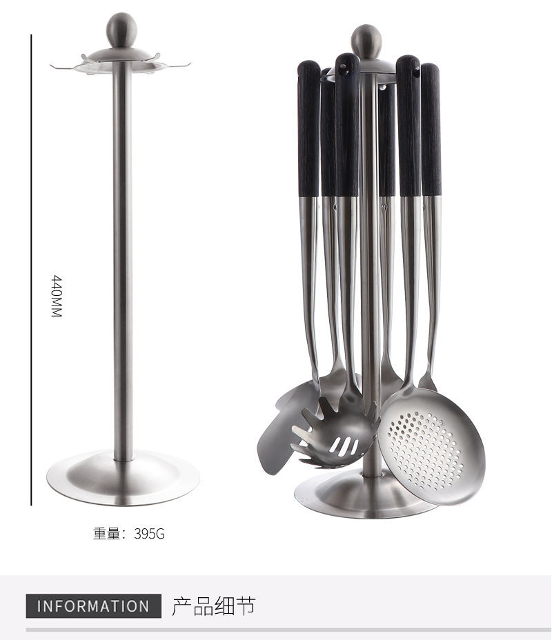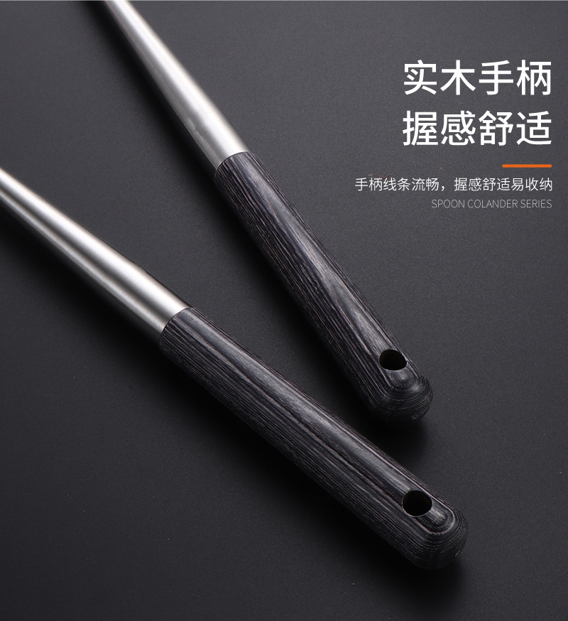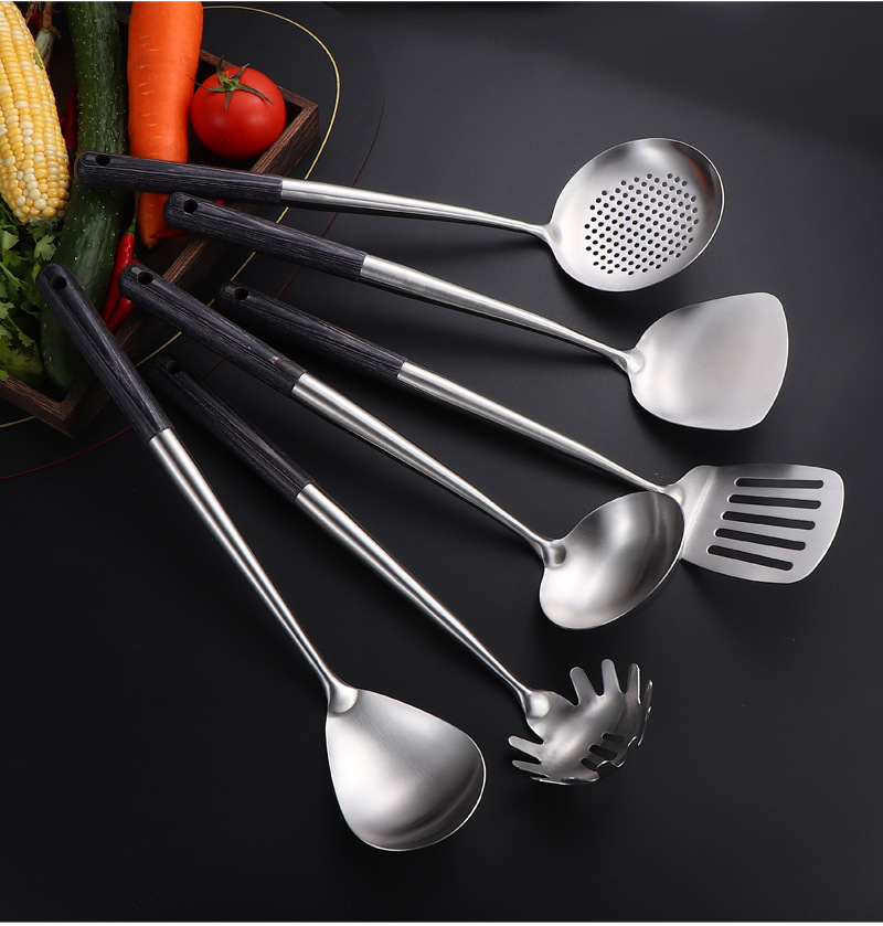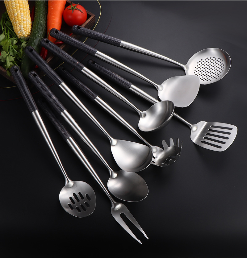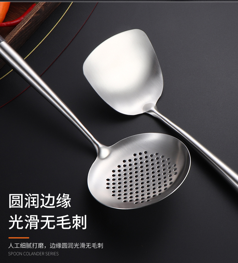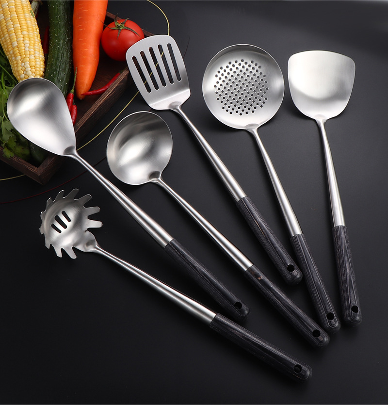 국경 304 스테인레스 스틸 나무 손잡이 주방 용품 세트 요리 도구 주걱 수프 숟가락 고기 포크 국수 숟가락 큰 누출