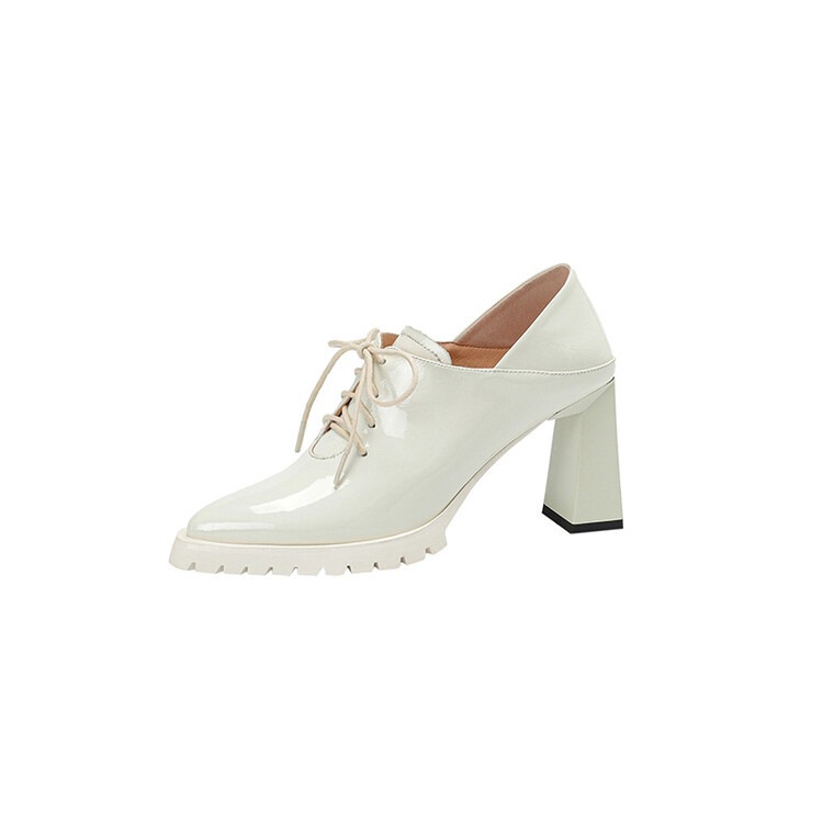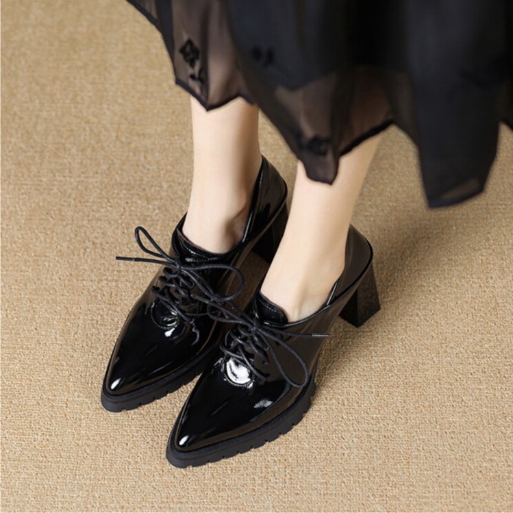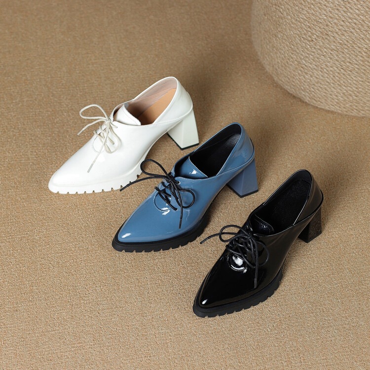 2025 봄 새로운 포인팅 두꺼운 힐 하이힐 레이스 업 신발 블랙 블루 화이트 카우보이 패션 여성 신발스토어 가기