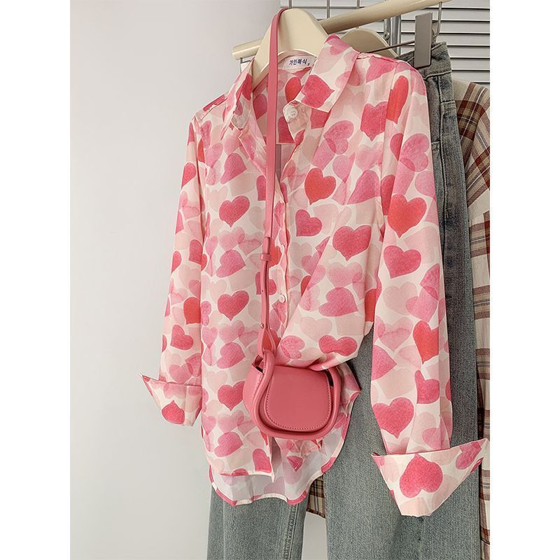우아한 달콤한 핑크 프린트 셔츠 여성용 하이 엔드 센스 패션 웨스턴 쉬폰 긴 소매 탑 봄과 가을 2024 새로운스토어 가기