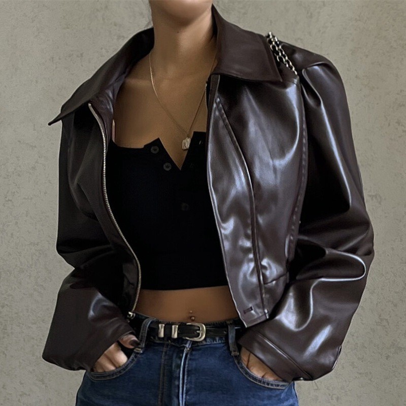 JFL4622 대외 무역 유럽과 미국 여성의 새로운 빈티지 기질 옷깃 지퍼 PU 가죽 미국 캐주얼 재킷 코트