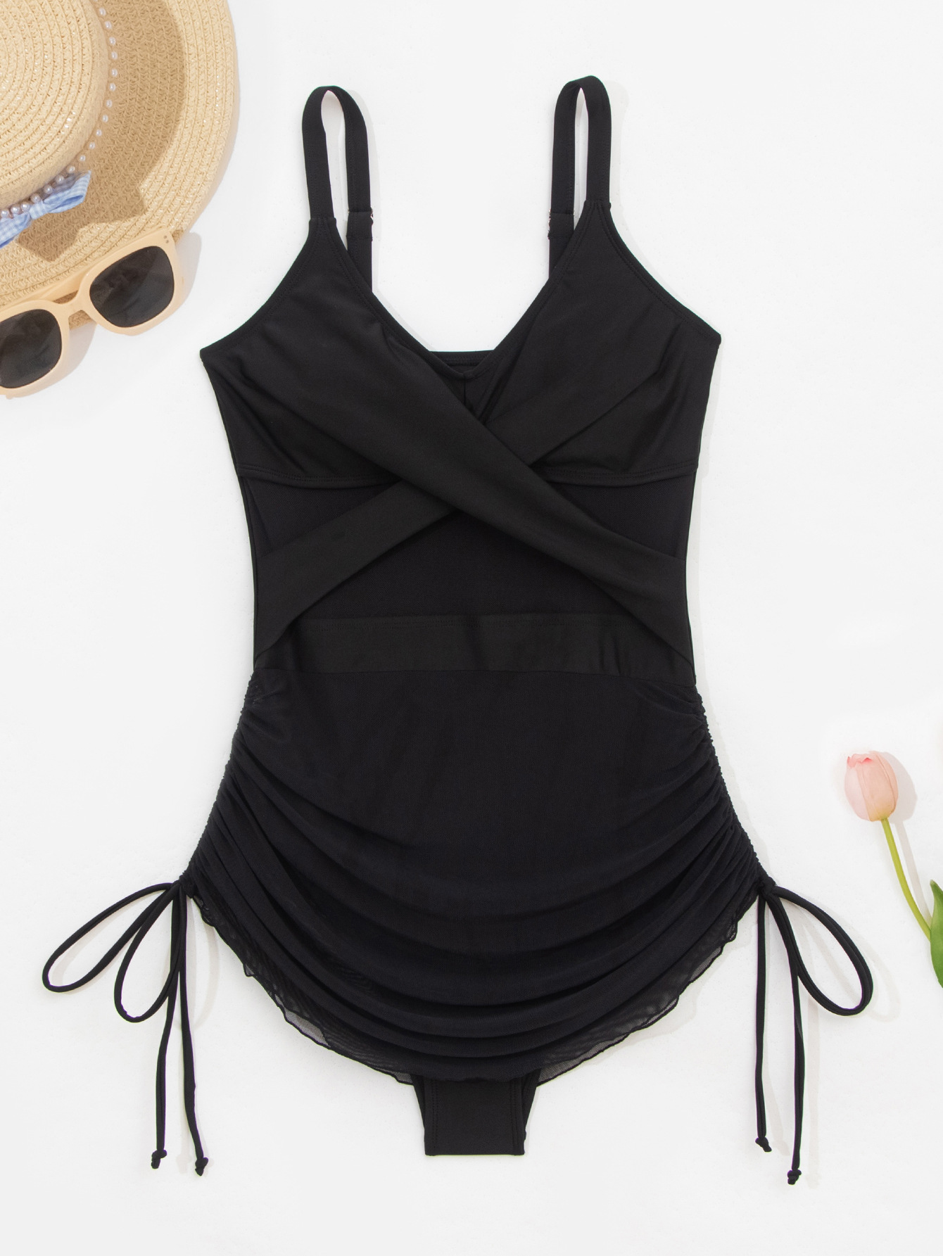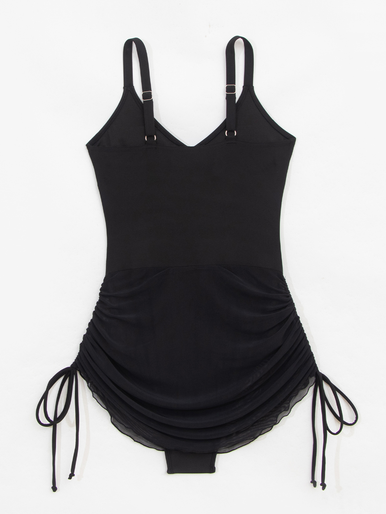 아마존 허리 메쉬 스티칭 원피스 수영복 거즈 스커트 크로스 딥 V 드로스트링 여성 원피스 수영복 세트