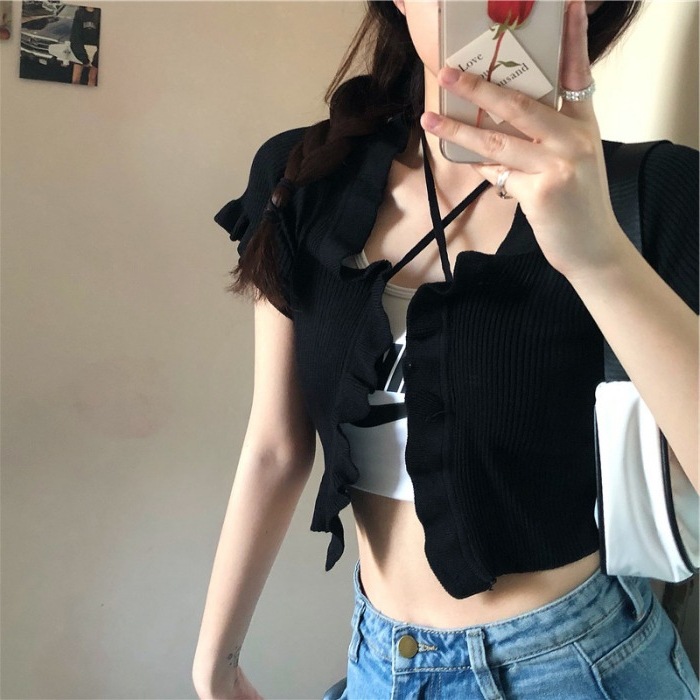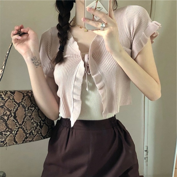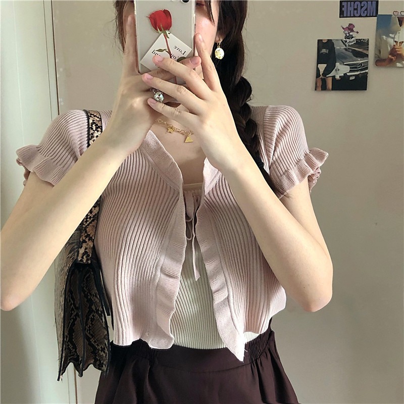 2025 새로운 봄과 여름 한국 스타일 디자인 센스 연꽃 잎 레이스 레이스 짧은 짧은 소매 얇은 카디건 탑