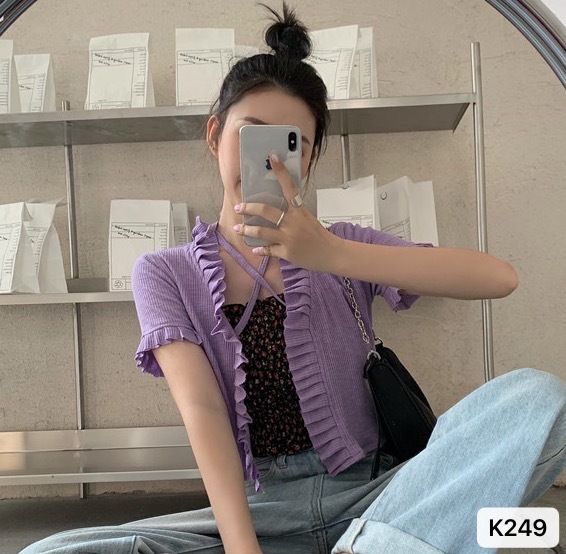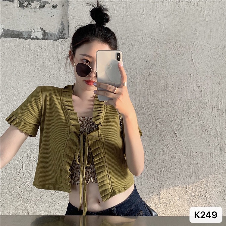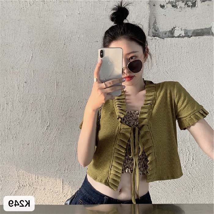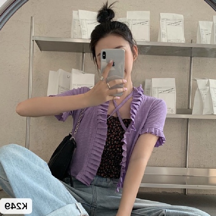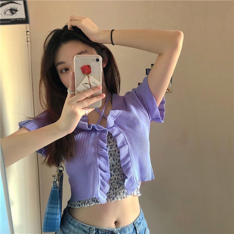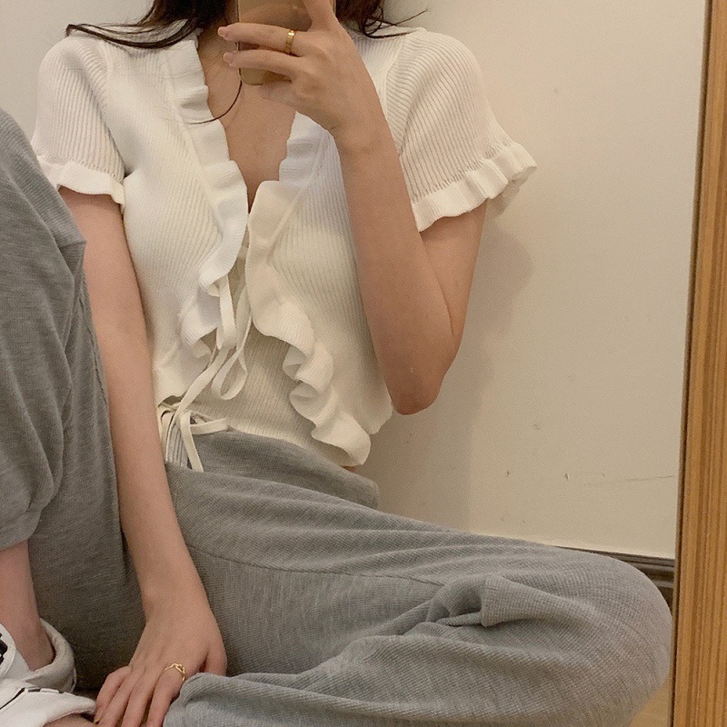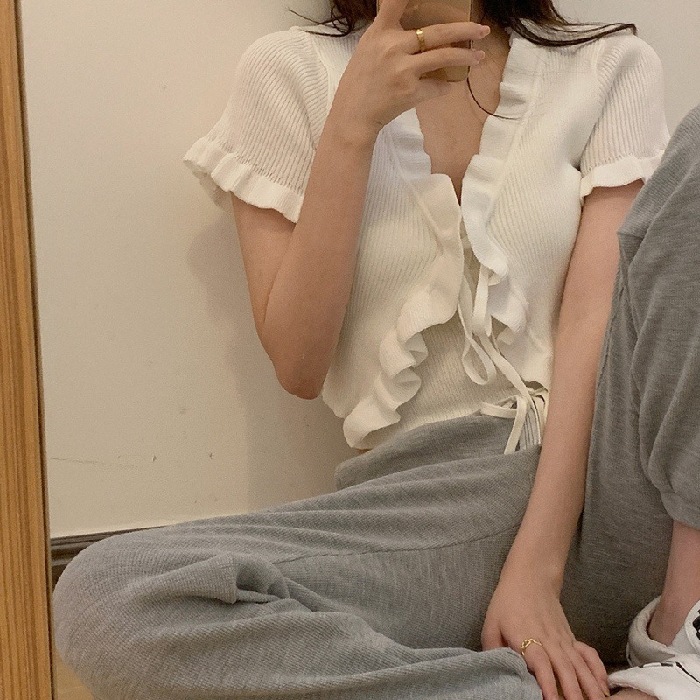 2025 새로운 봄과 여름 한국 스타일 디자인 센스 연꽃 잎 레이스 레이스 짧은 짧은 소매 얇은 카디건 탑스토어 가기