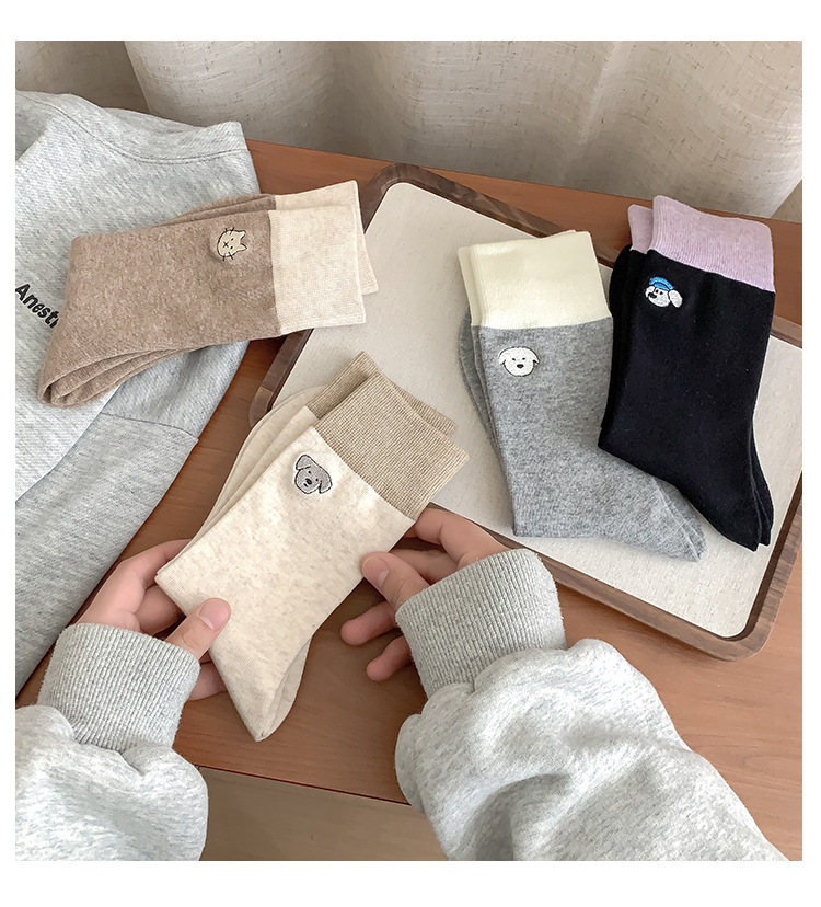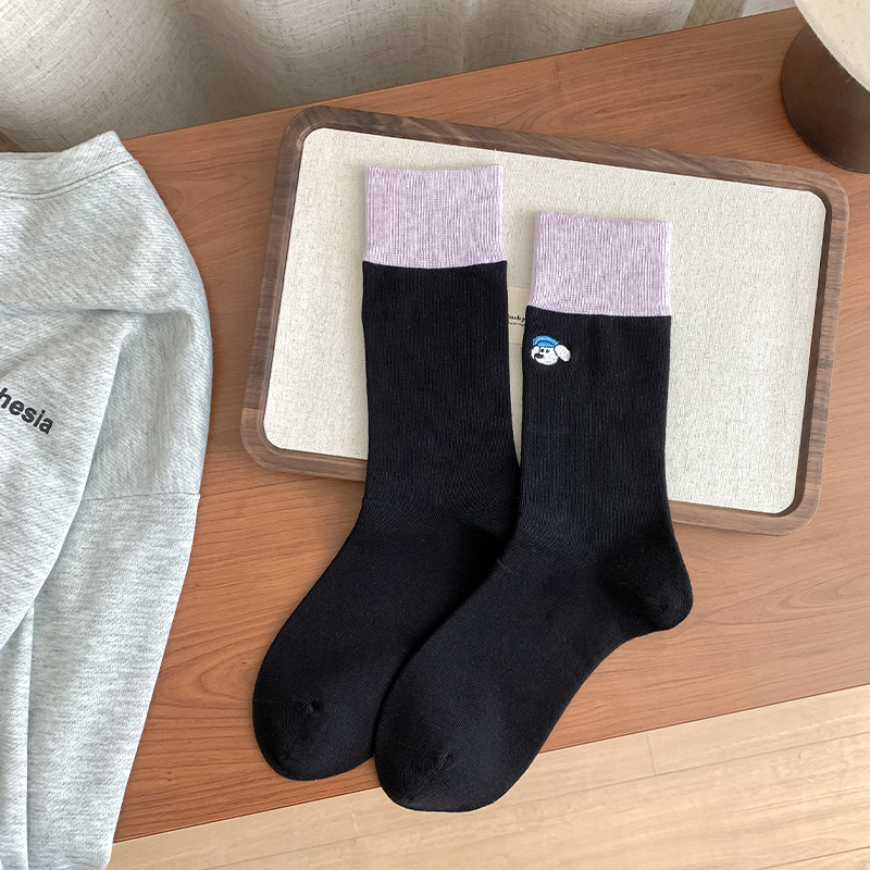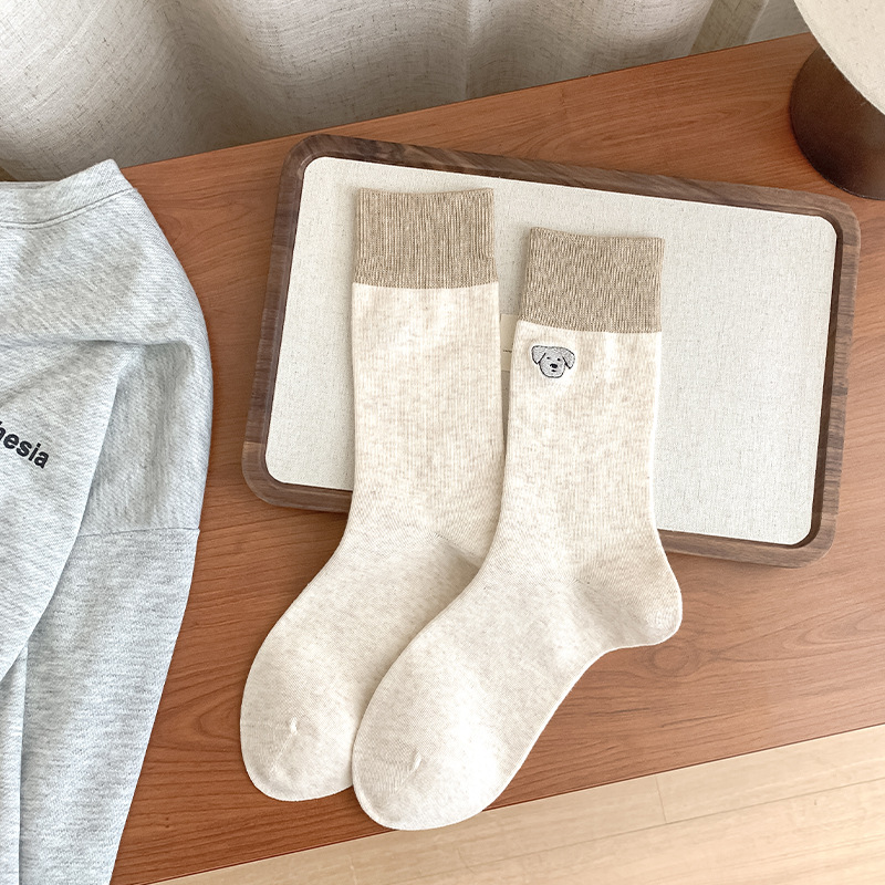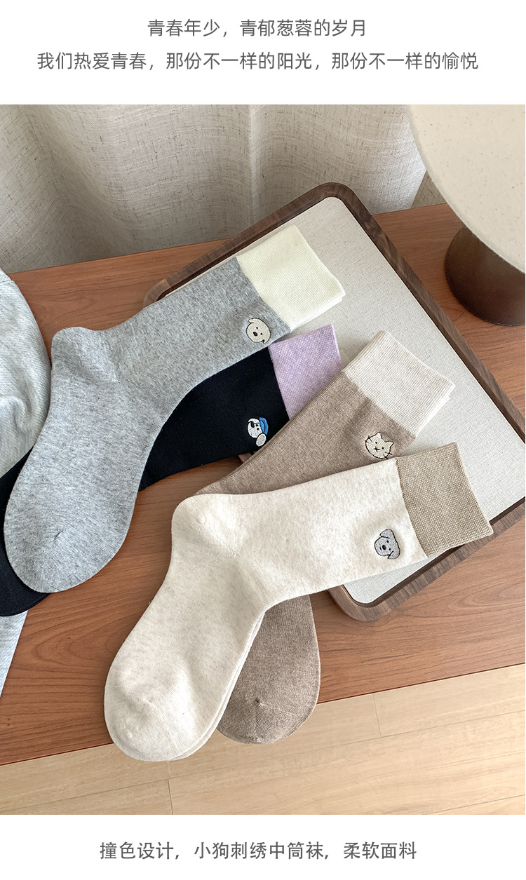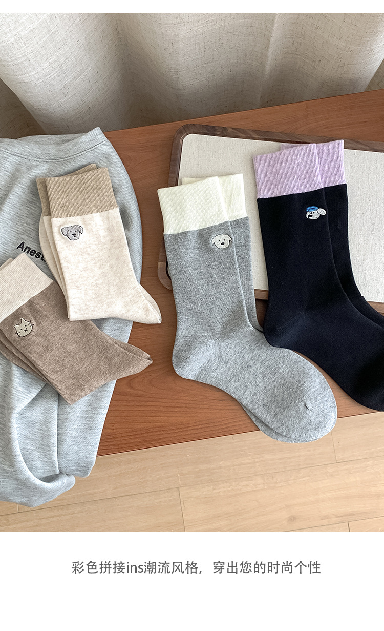 뼈없는 중간 길이 스타킹 어린이 봄과 가을 순수 코튼 Ins 트렌디 한 일본 스타일 대학 스타일 스타킹 강아지 자수 대비 컬러 스태킹 스타킹스토어 가기