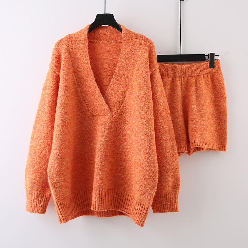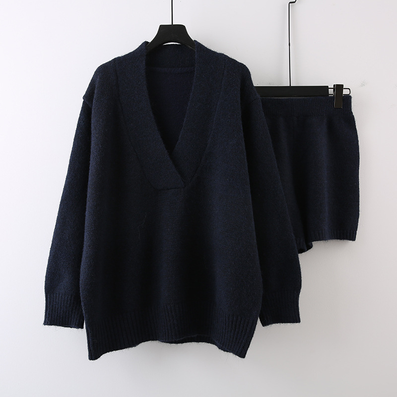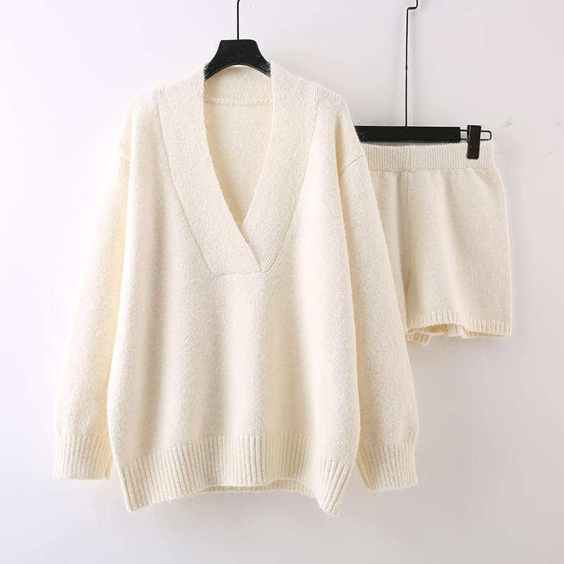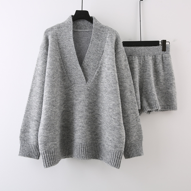느슨한 게으른 휴식 감각 두꺼운 캐주얼 세트 여성의 봄과 가을 V-Neck 느슨한 스웨터 높은 허리 반바지 투피스 세트