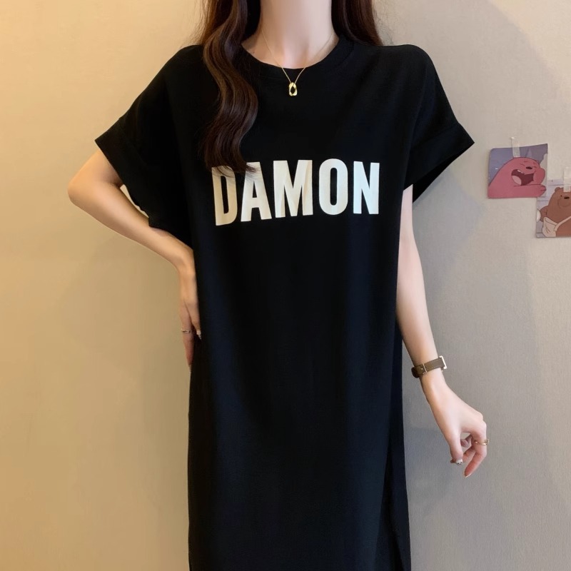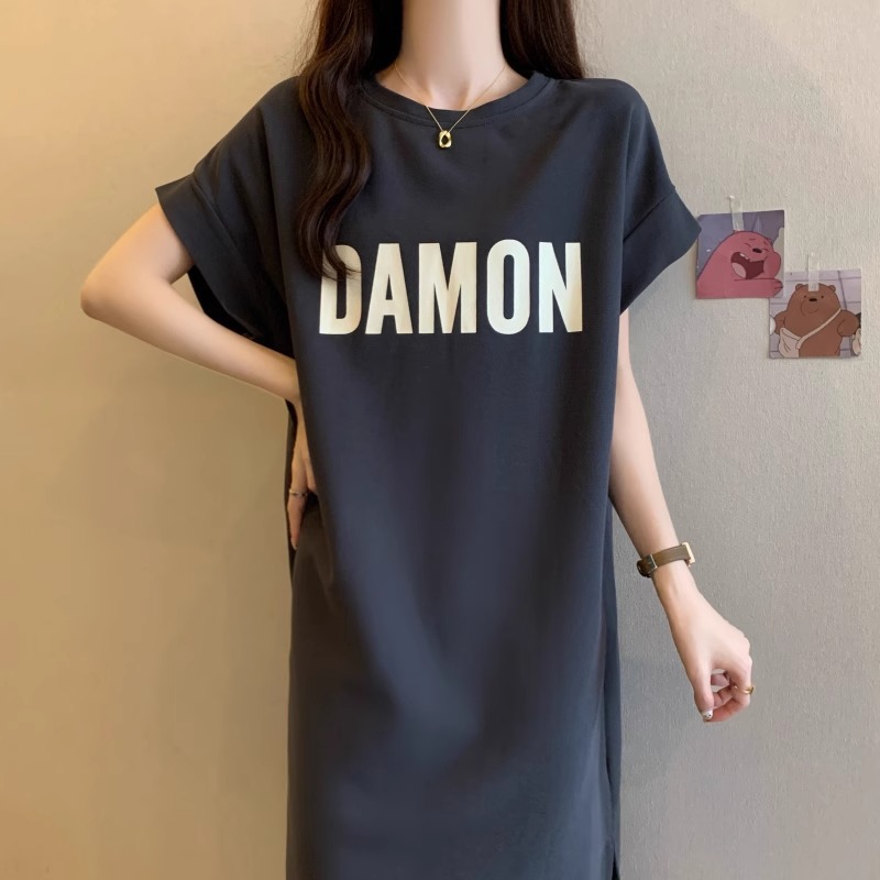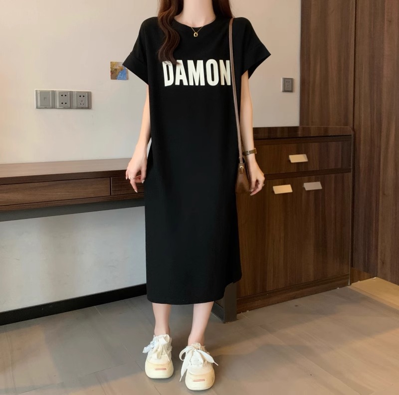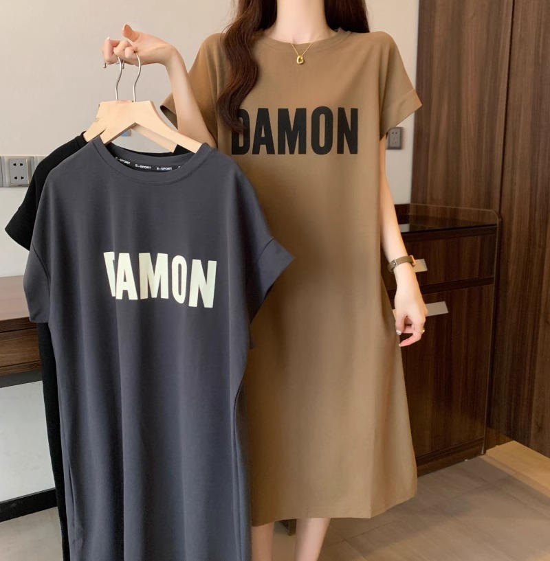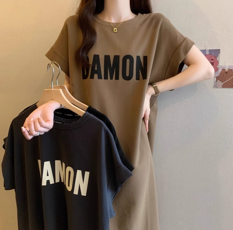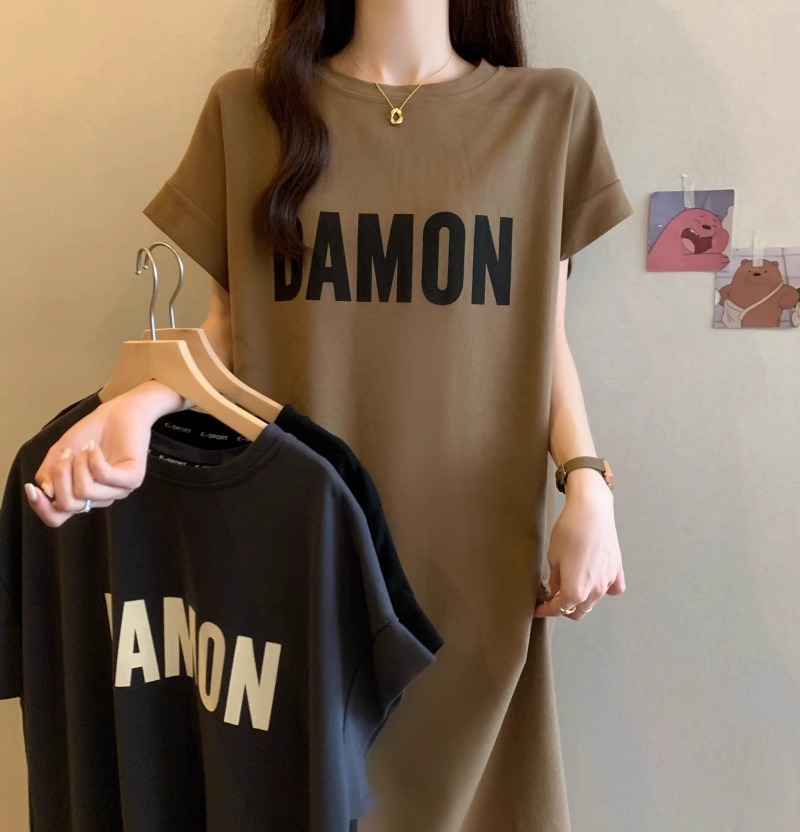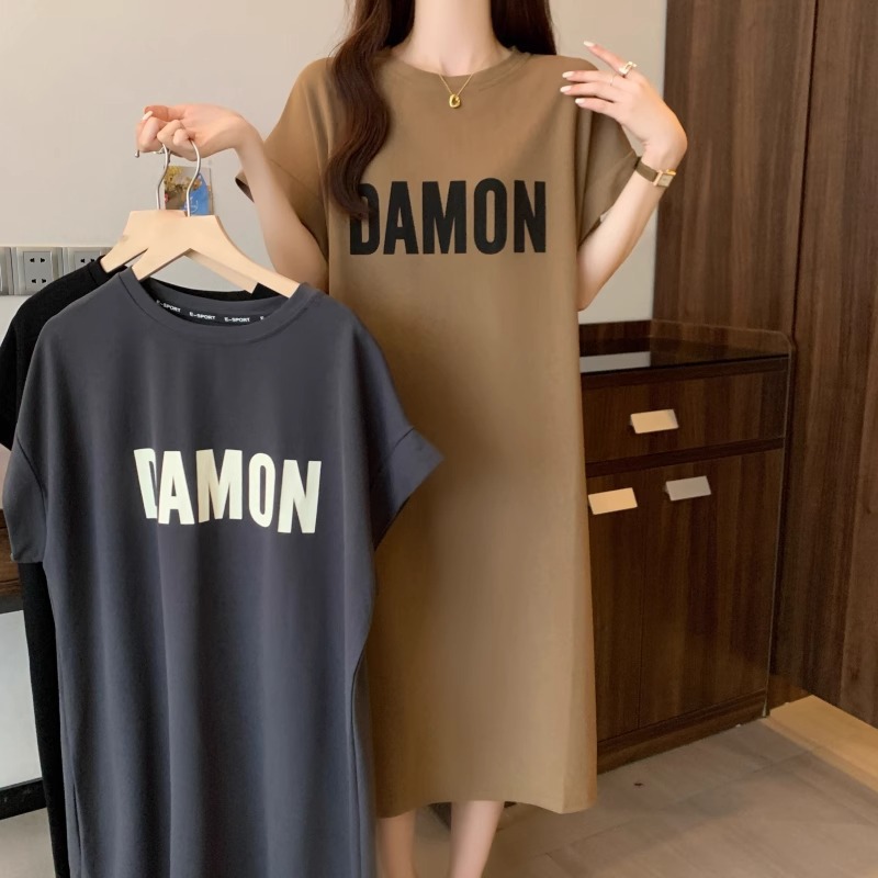플러스 사이즈 여성용 반팔 티셔츠 원피스 여름 통통녀 느슨한 슬리밍 배꼽 스트레이트 캐주얼 오버-더-무릎 스커트스토어 가기