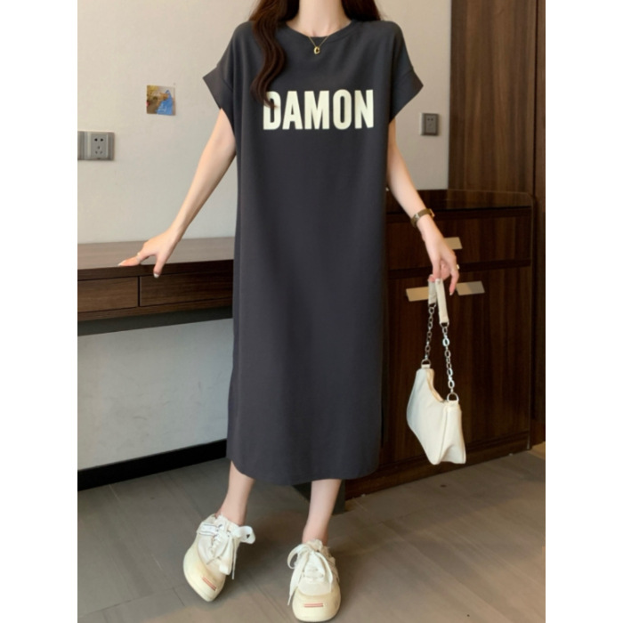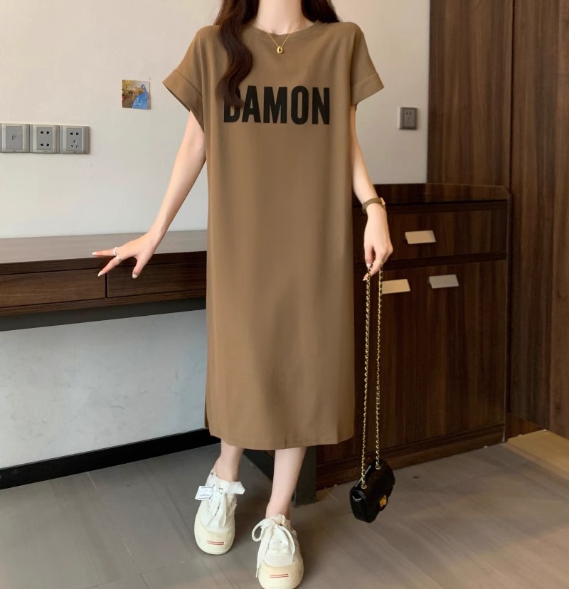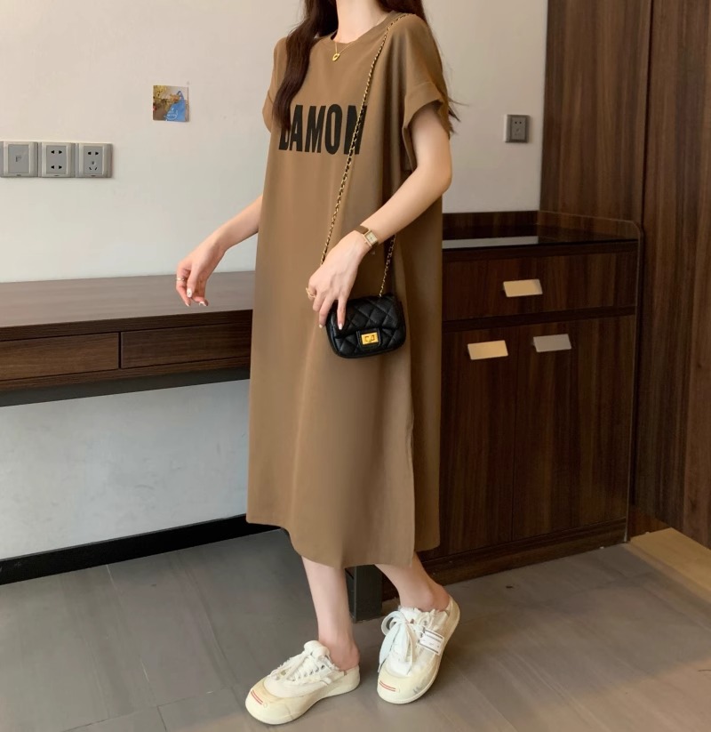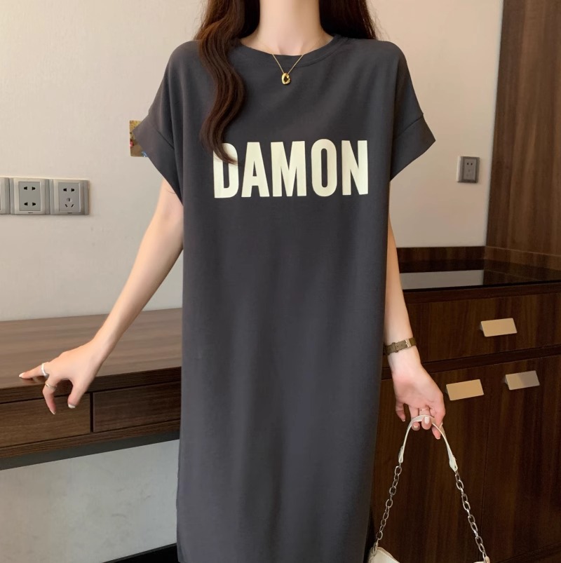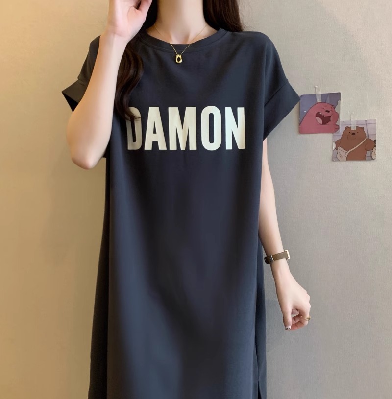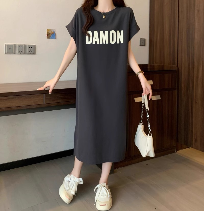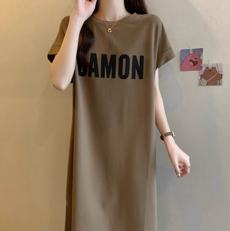 플러스 사이즈 여성용 반팔 티셔츠 원피스 여름 통통녀 느슨한 슬리밍 배꼽 스트레이트 캐주얼 오버-더-무릎 스커트스토어 가기