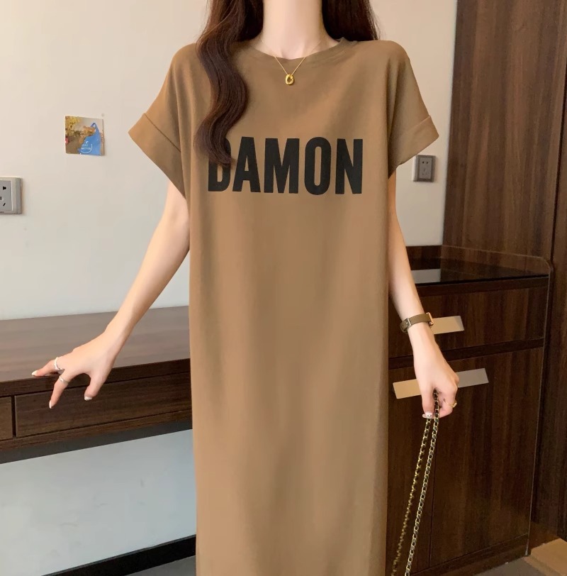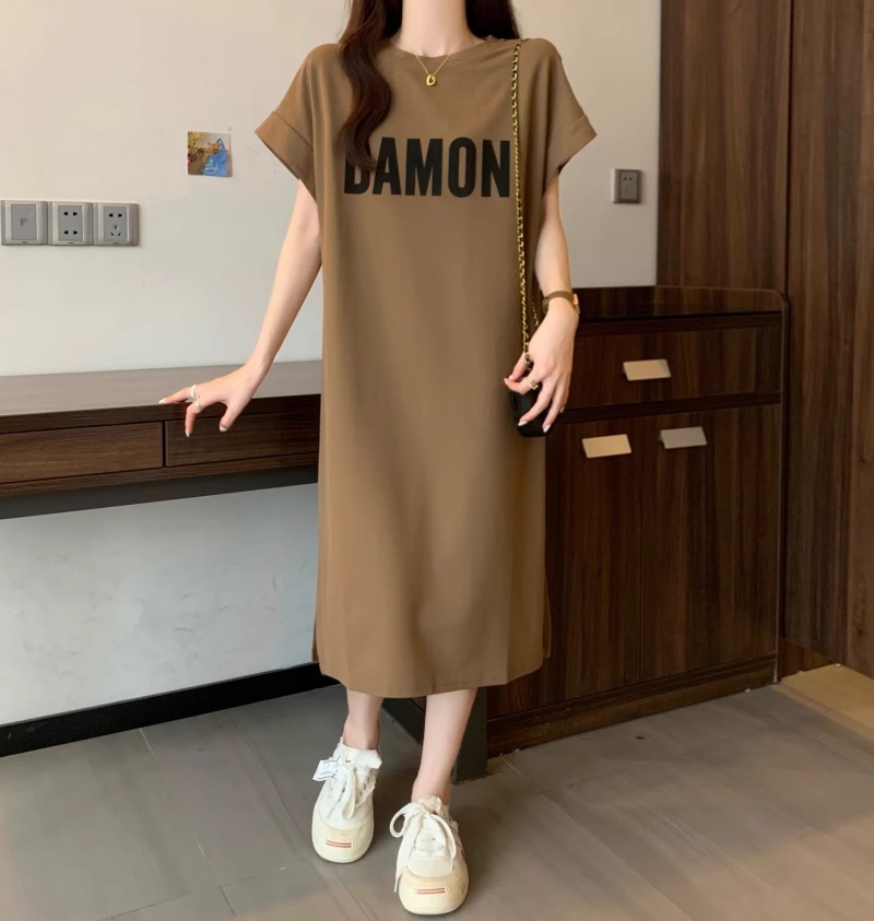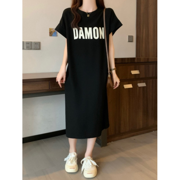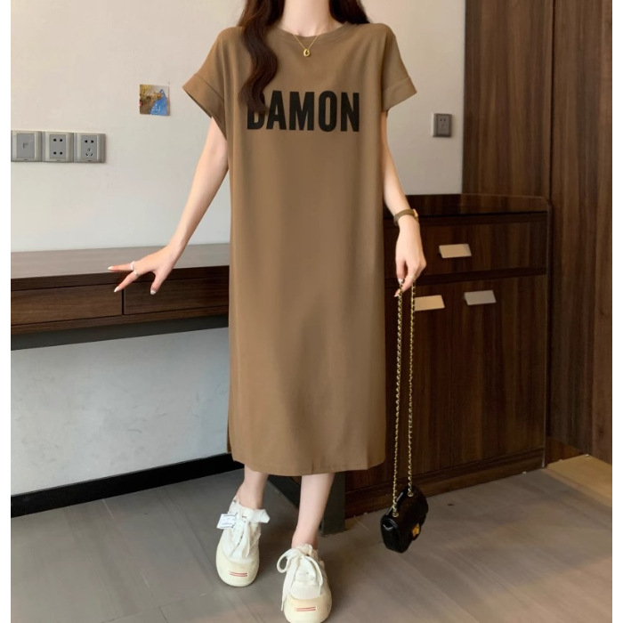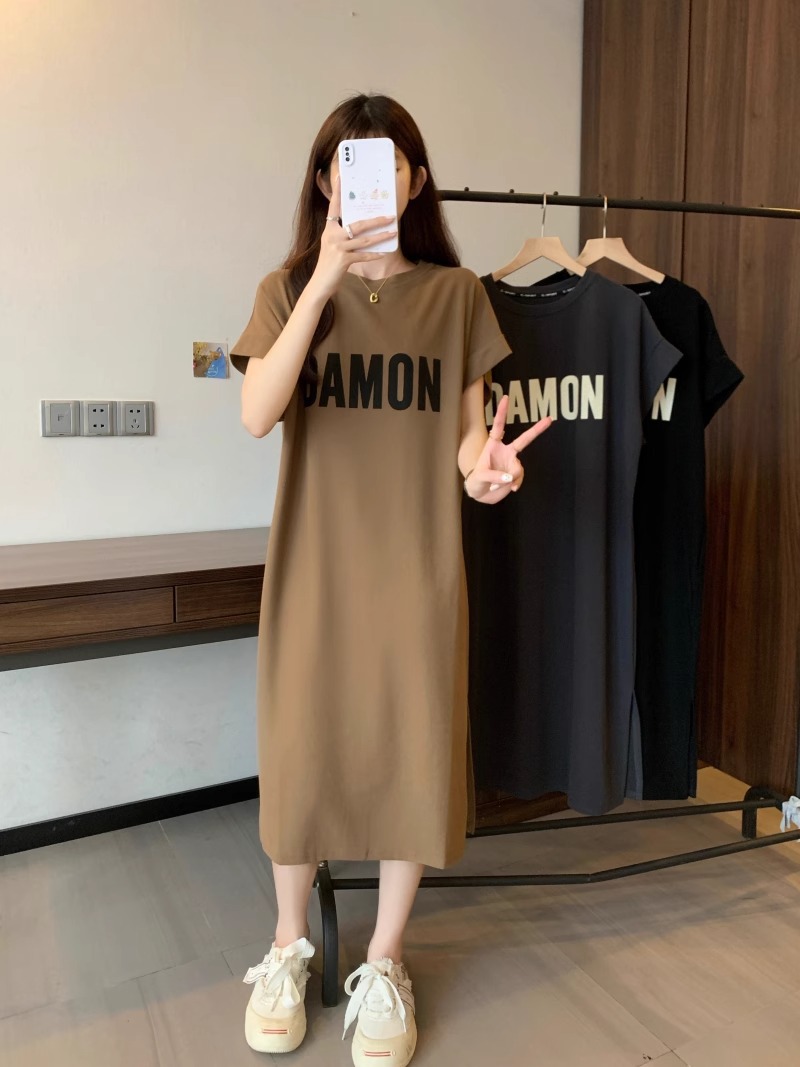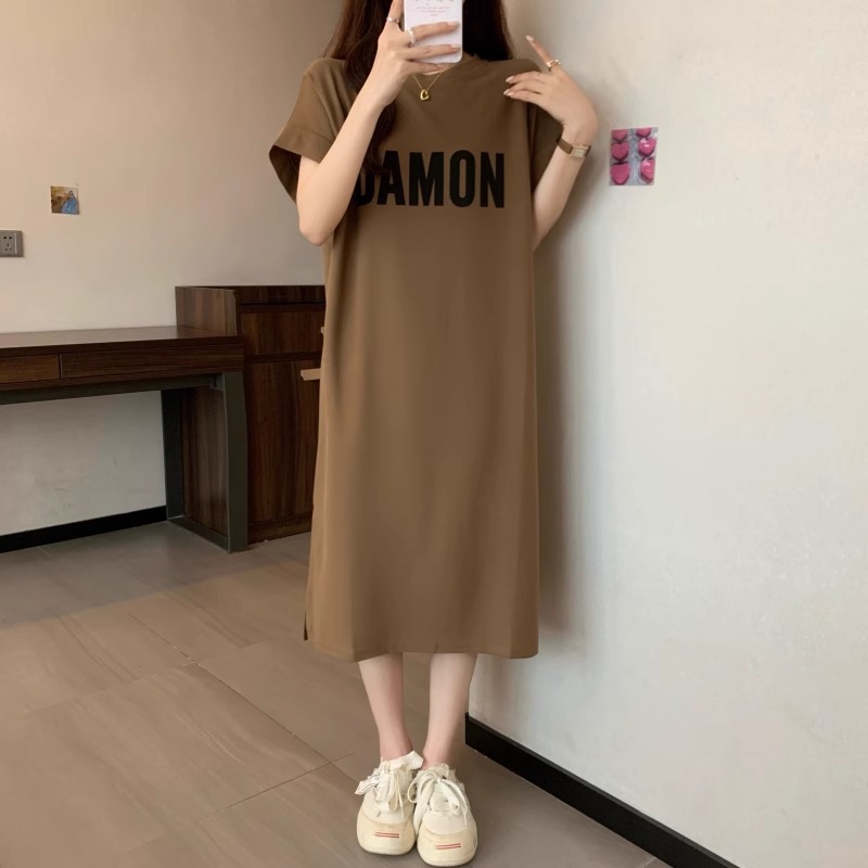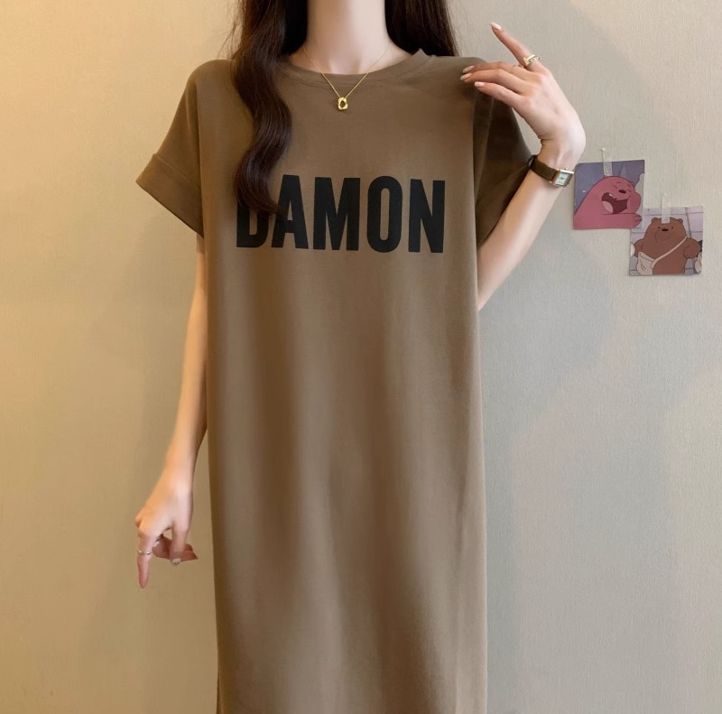 플러스 사이즈 여성용 반팔 티셔츠 원피스 여름 통통녀 느슨한 슬리밍 배꼽 스트레이트 캐주얼 오버-더-무릎 스커트스토어 가기
