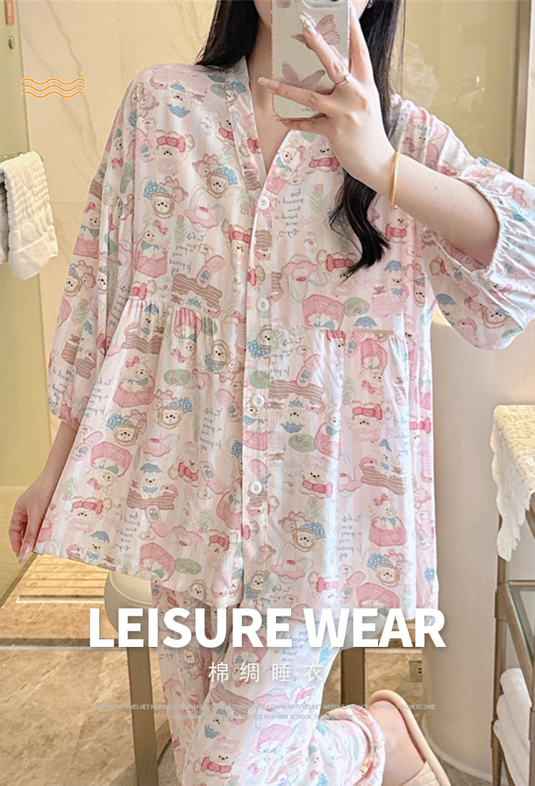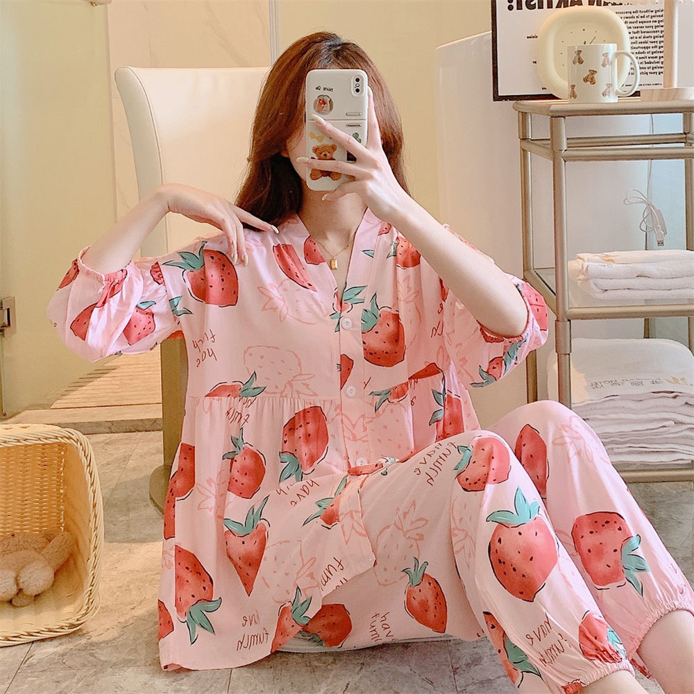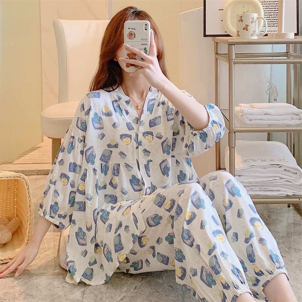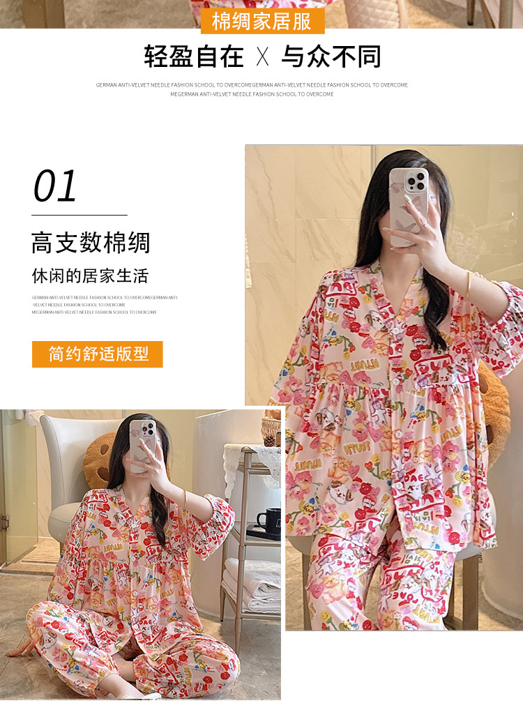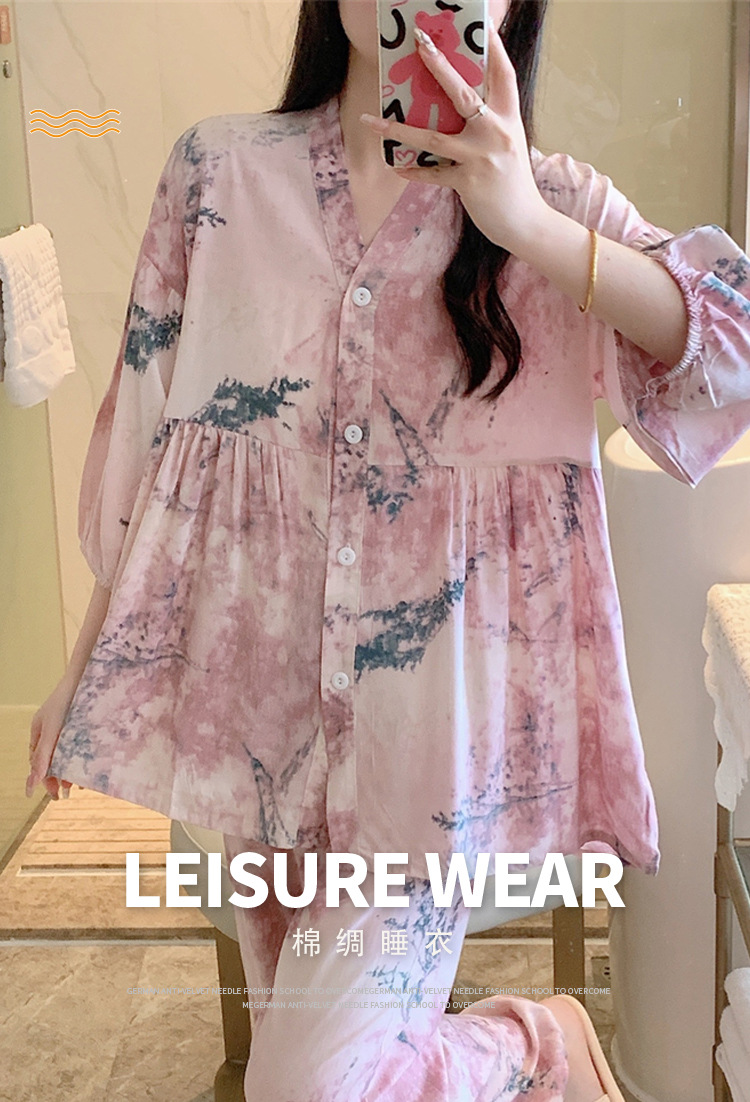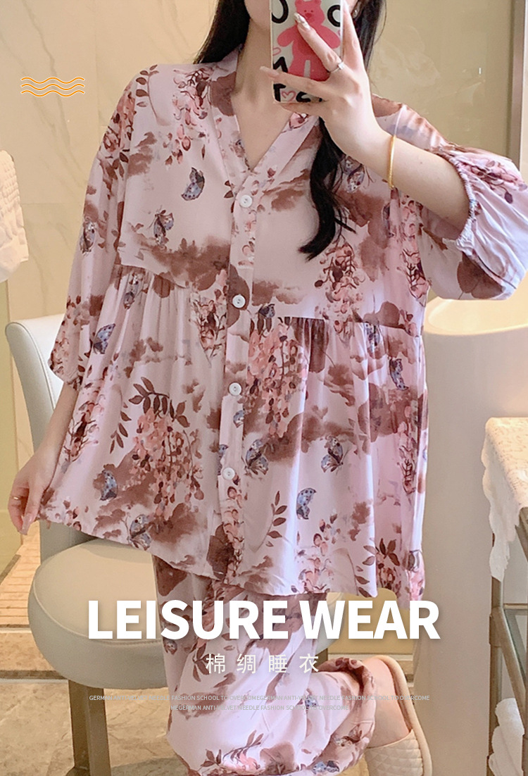 뉴 코튼 실크 파자마 여성 달콤한 봄과 여름 아우터 입고 플러스 사이즈 한국 스타일 달콤한 자른 슬리브 바지 하이 엔드 홈스토어 가기