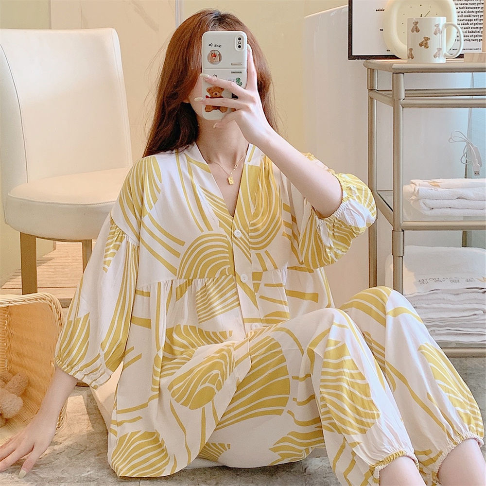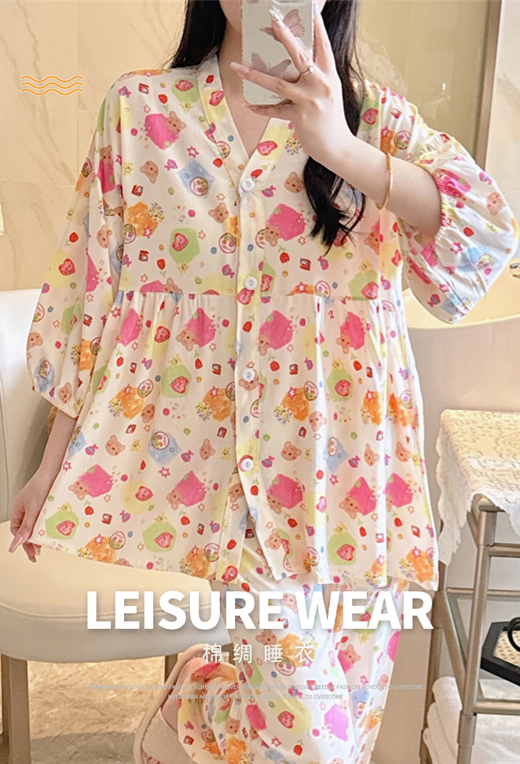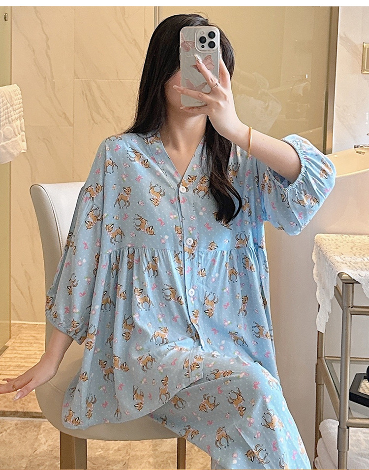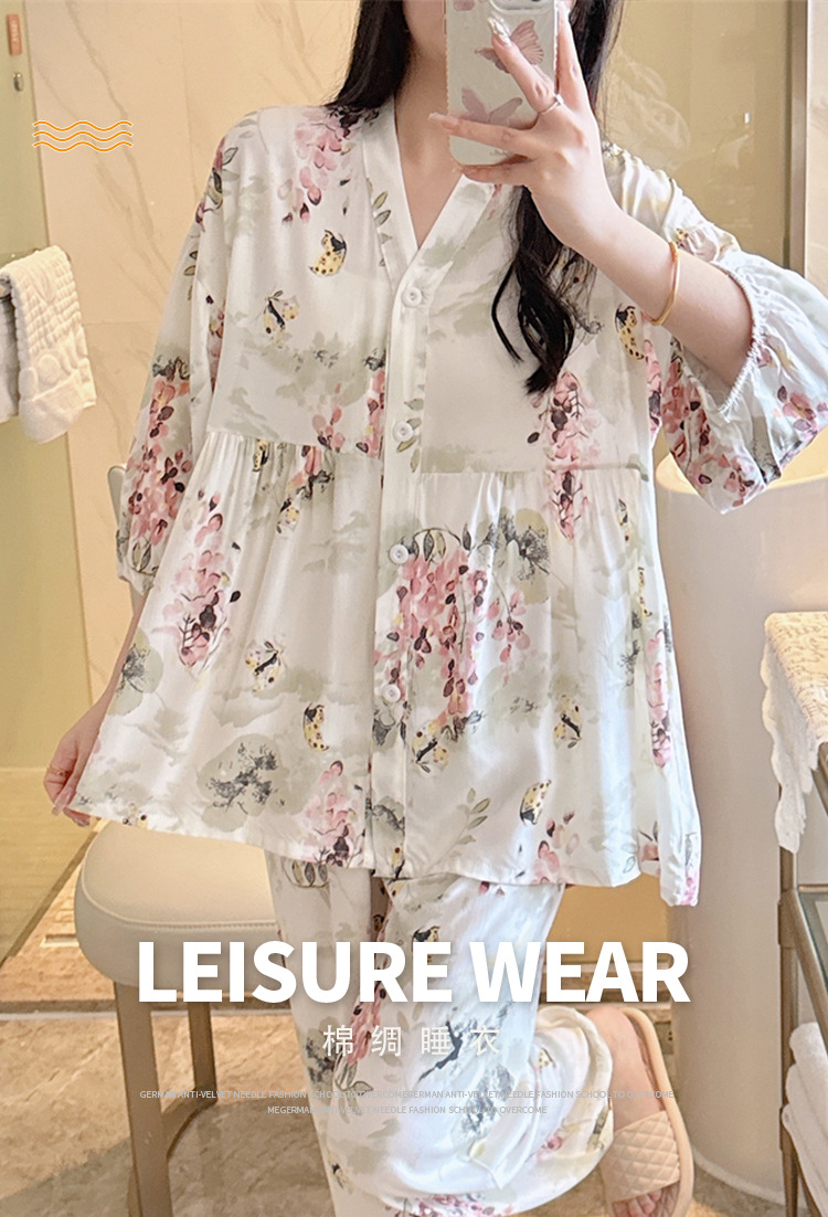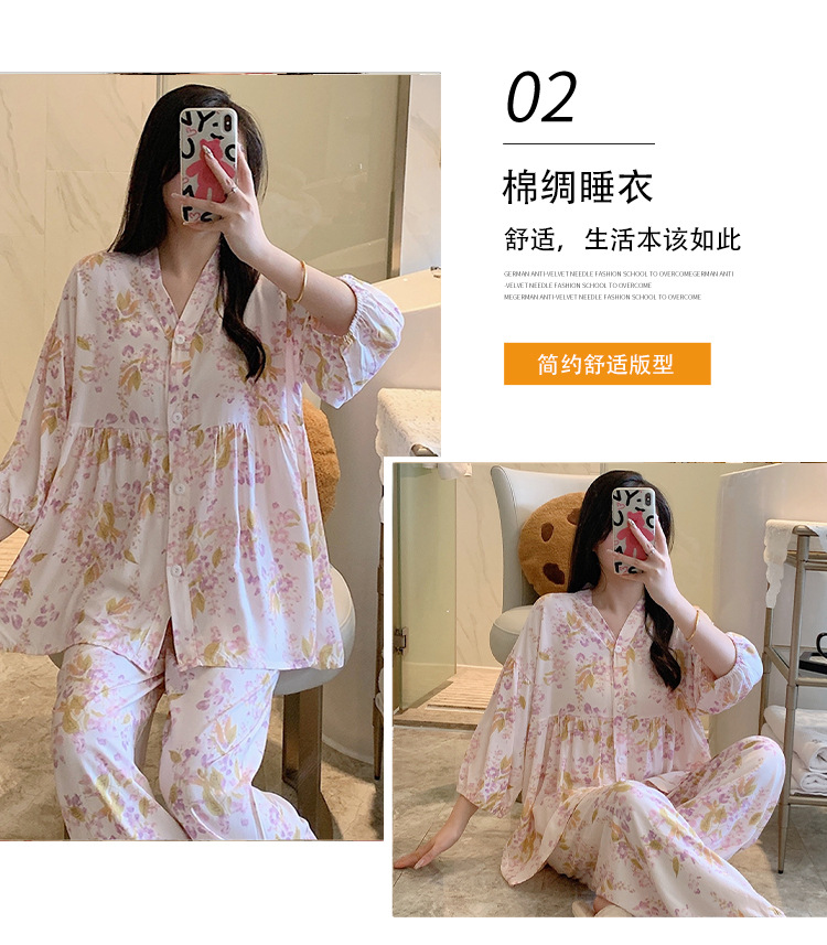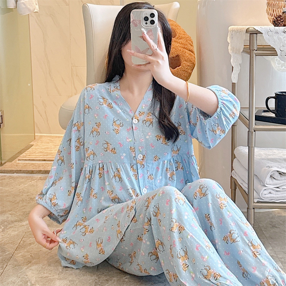 뉴 코튼 실크 파자마 여성 달콤한 봄과 여름 아우터 입고 플러스 사이즈 한국 스타일 달콤한 자른 슬리브 바지 하이 엔드 홈스토어 가기