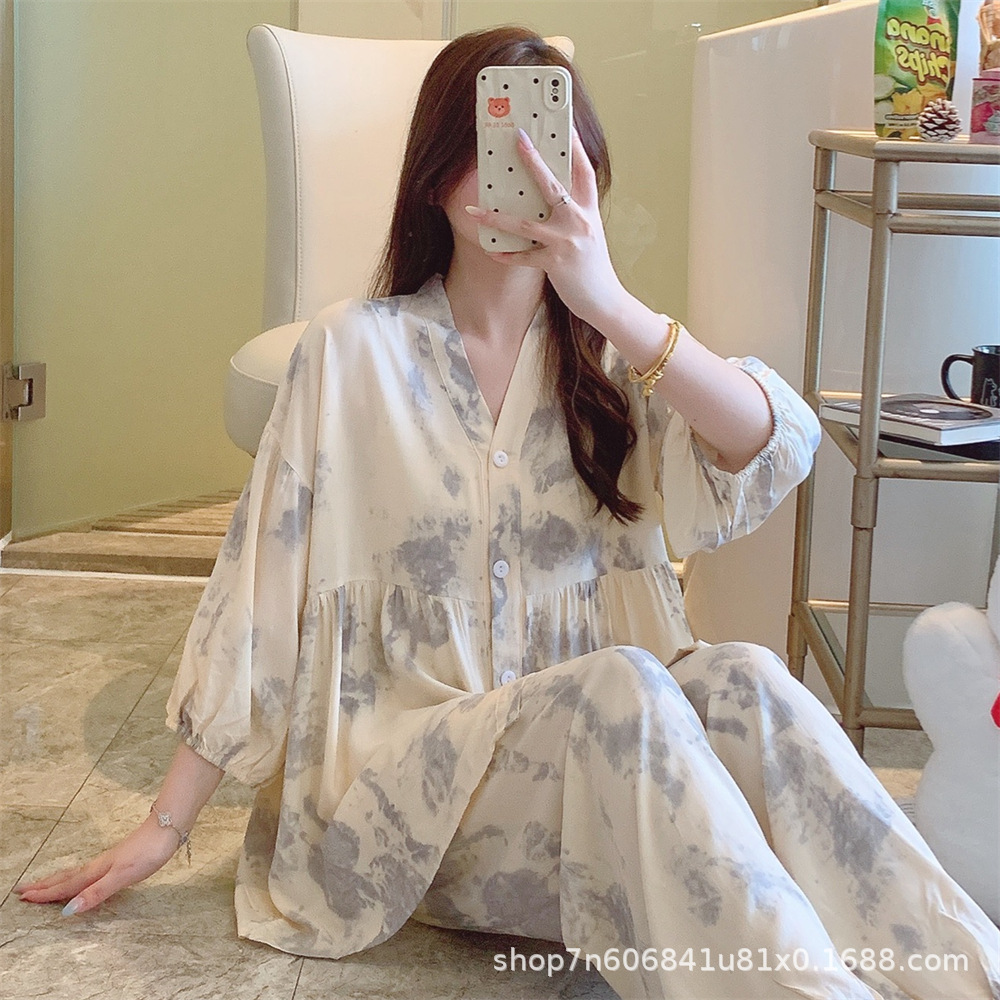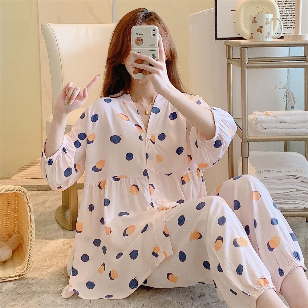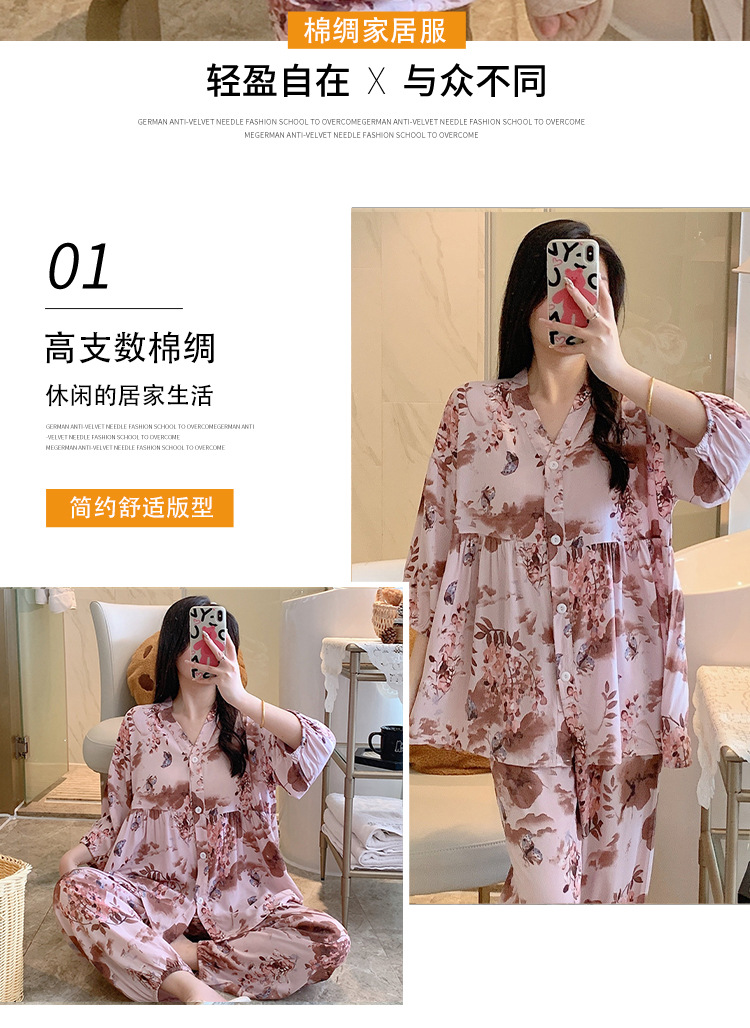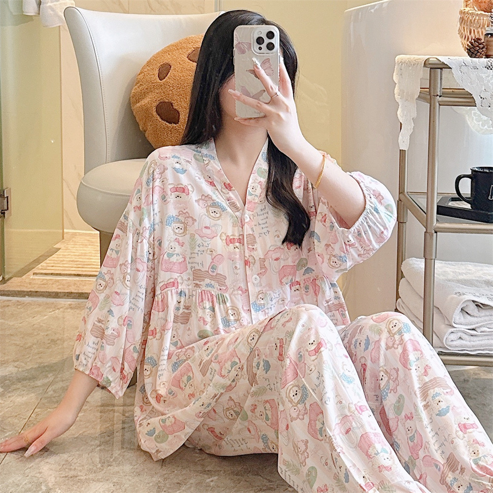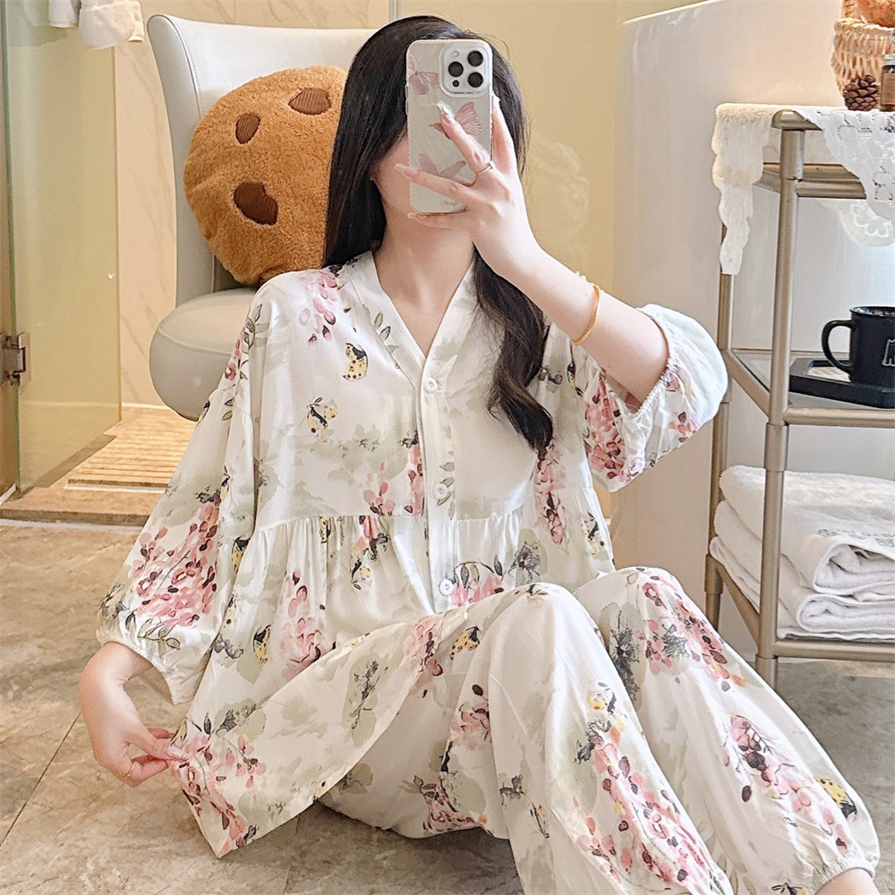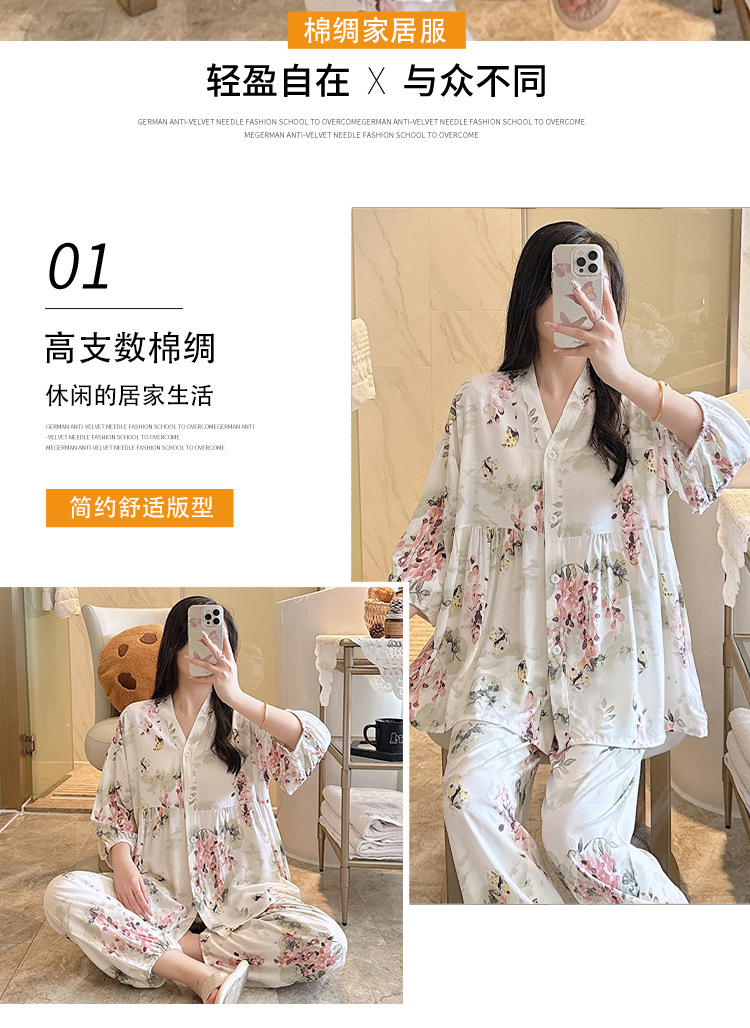뉴 코튼 실크 파자마 여성 달콤한 봄과 여름 아우터 입고 플러스 사이즈 한국 스타일 달콤한 자른 슬리브 바지 하이 엔드 홈스토어 가기