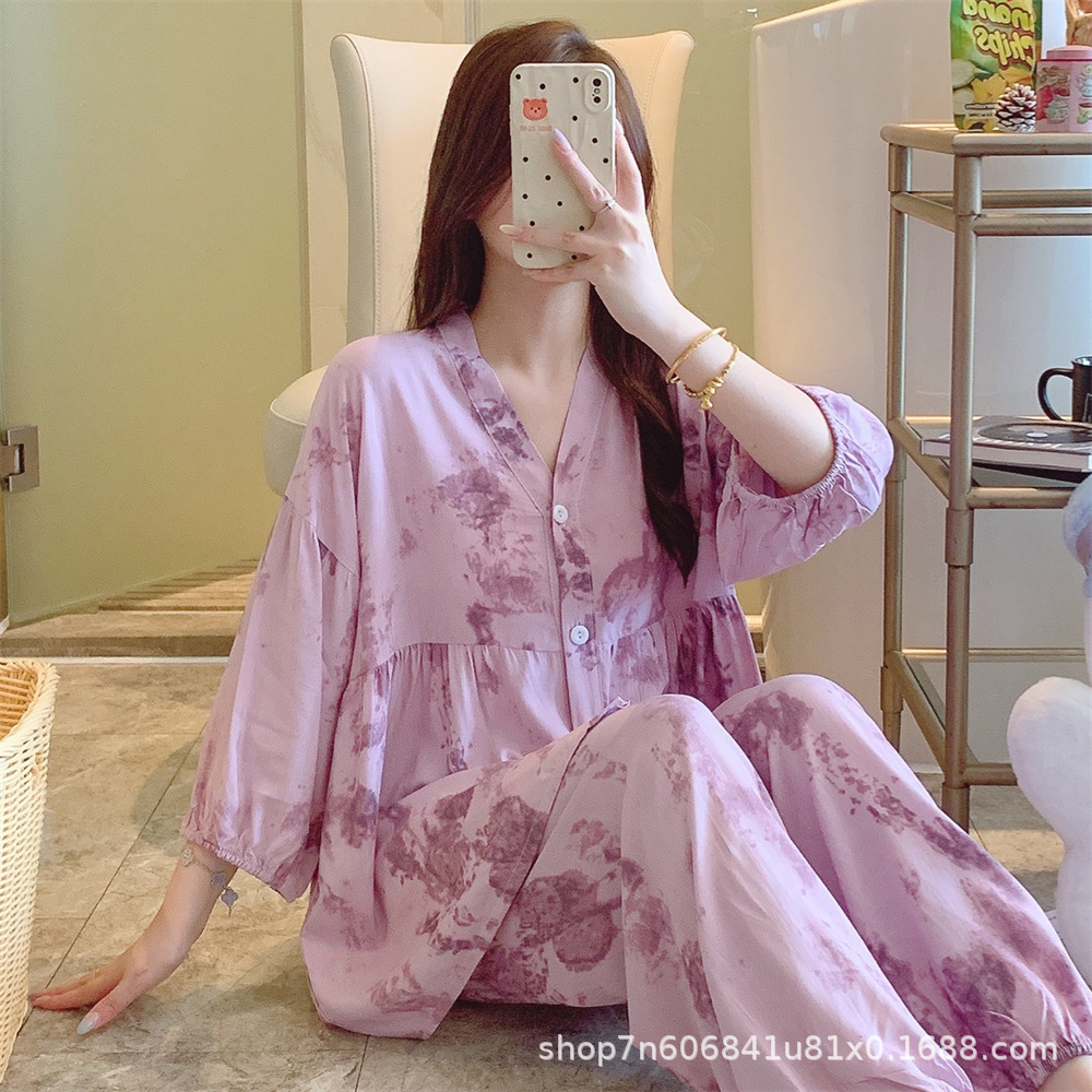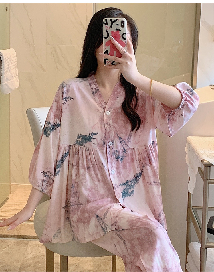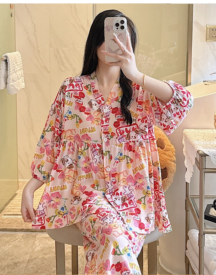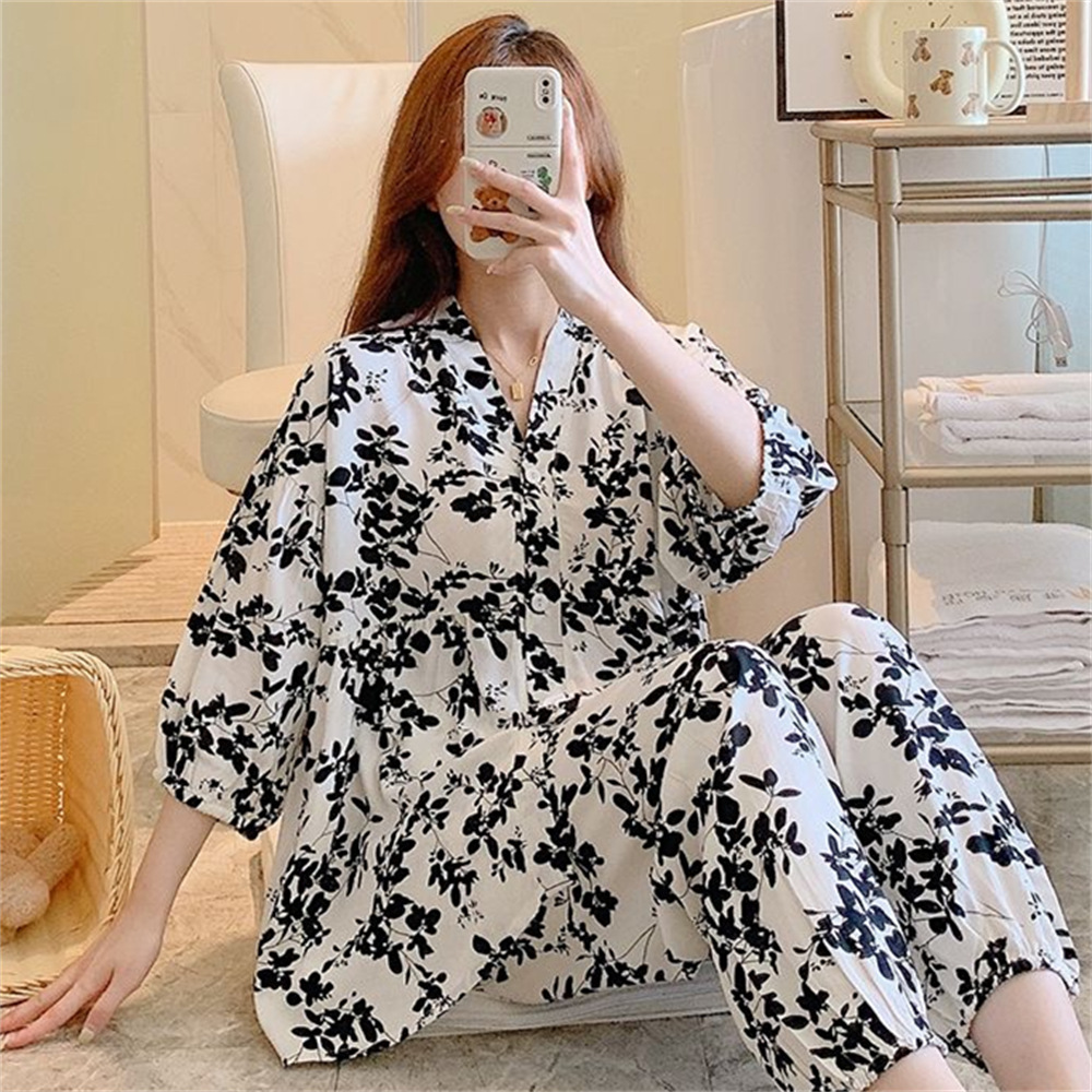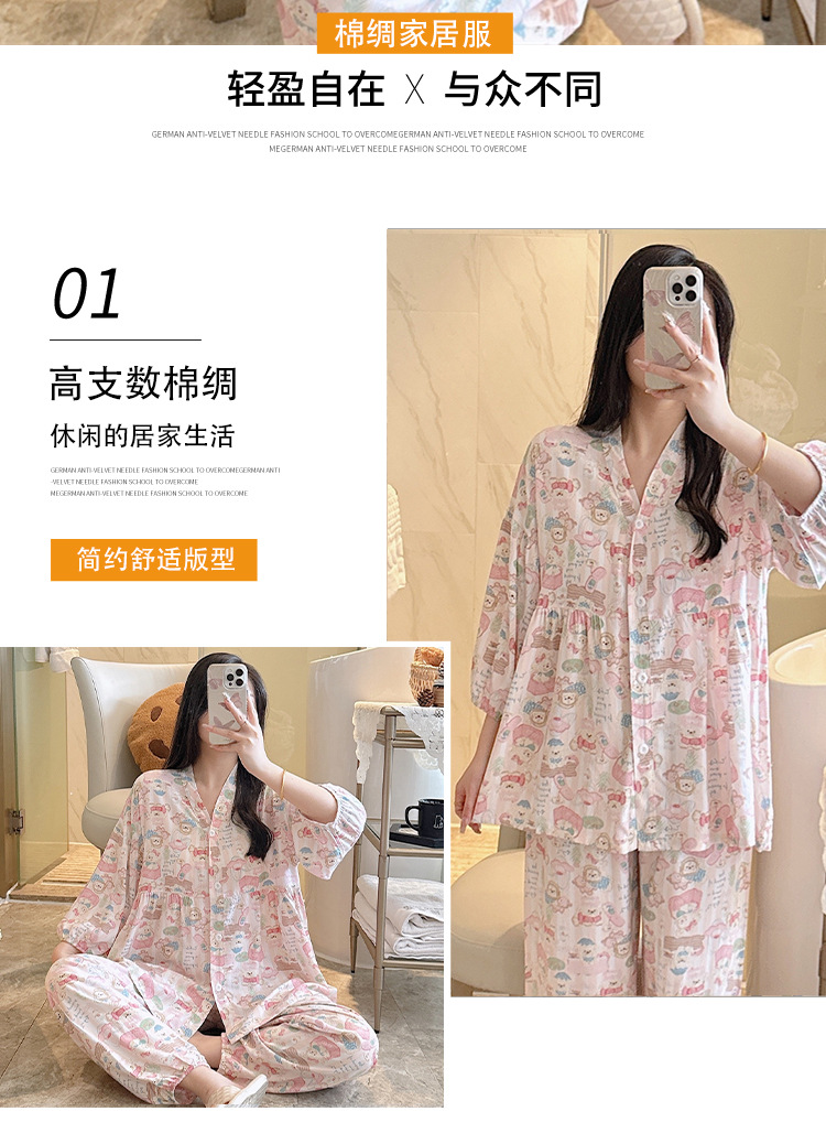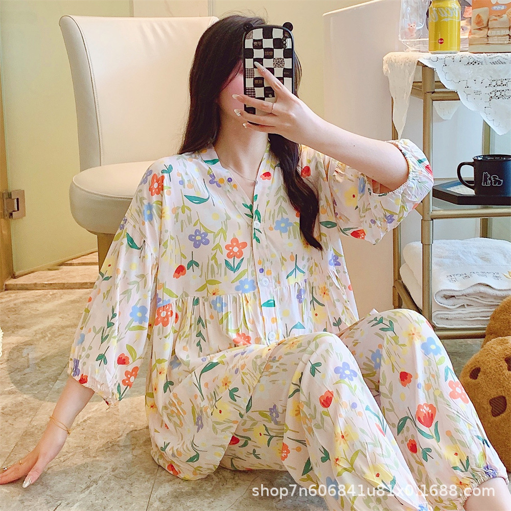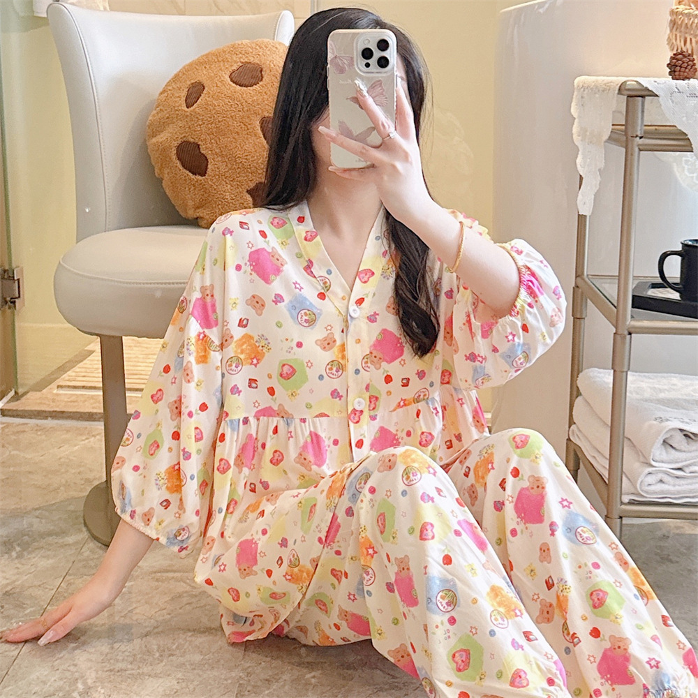 뉴 코튼 실크 파자마 여성 달콤한 봄과 여름 아우터 입고 플러스 사이즈 한국 스타일 달콤한 자른 슬리브 바지 하이 엔드 홈스토어 가기