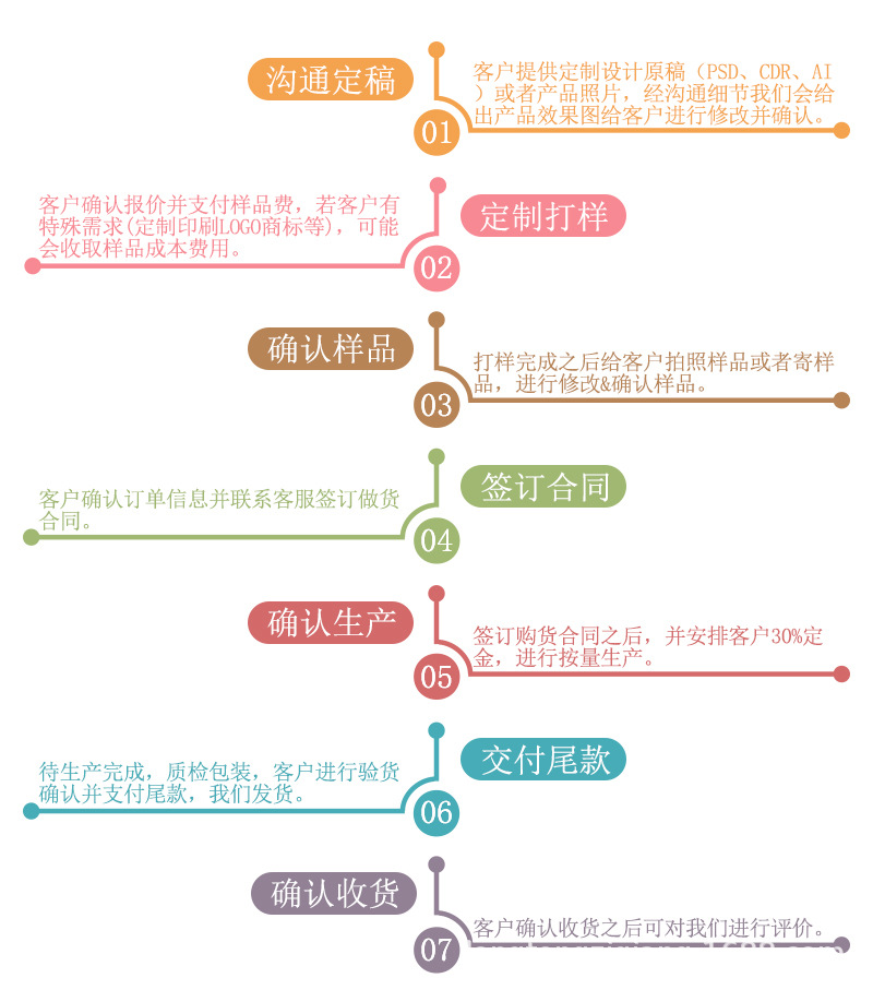3、正式订单:确认好订单产品款式、数量、材质、单价、LOGO要求及交货时间