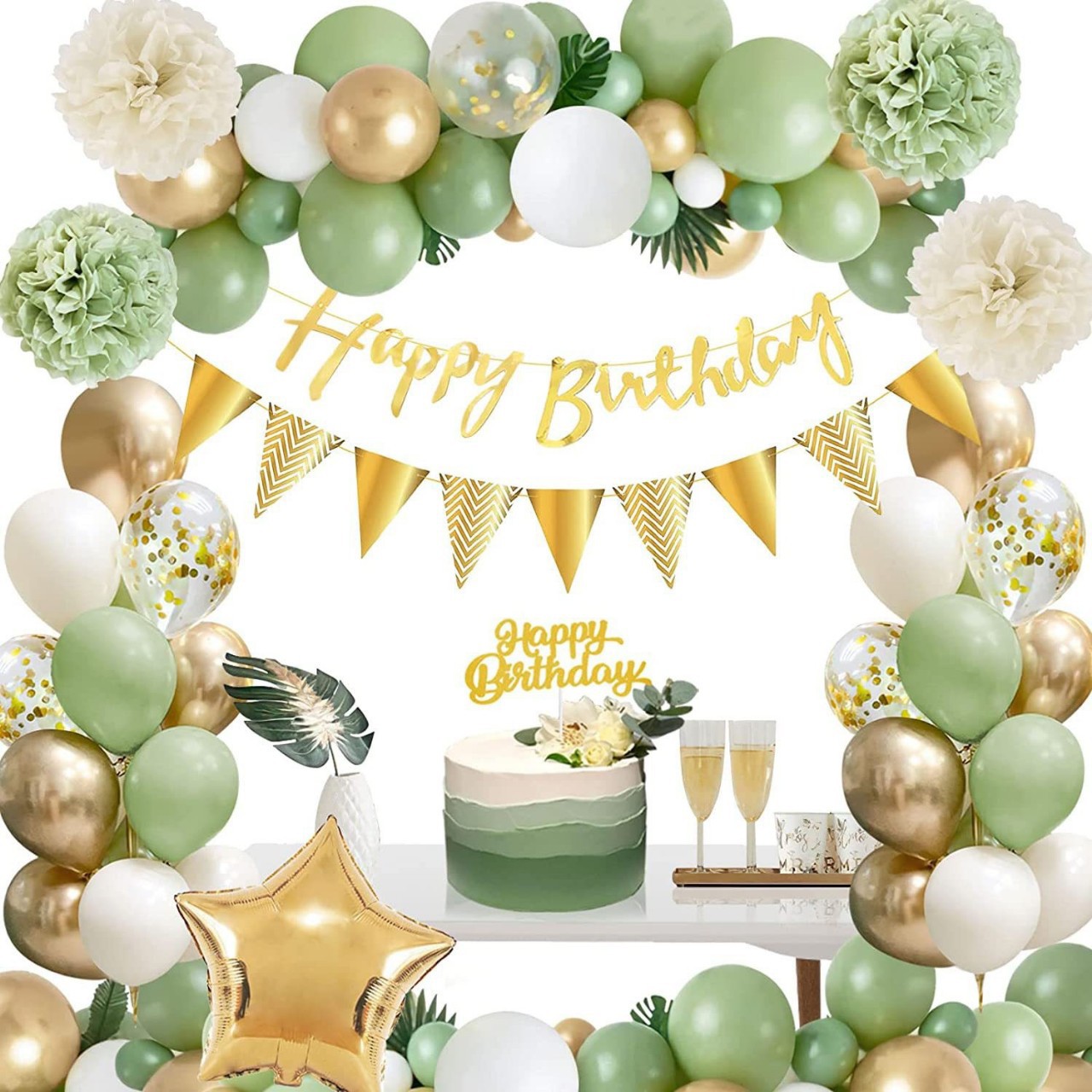 세이지 그린 생일 깃발 풍선 세트 꽃 공 비 실크 장식 생일 파티 장면 레이아웃 풍선
