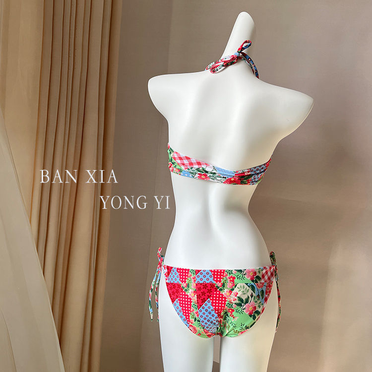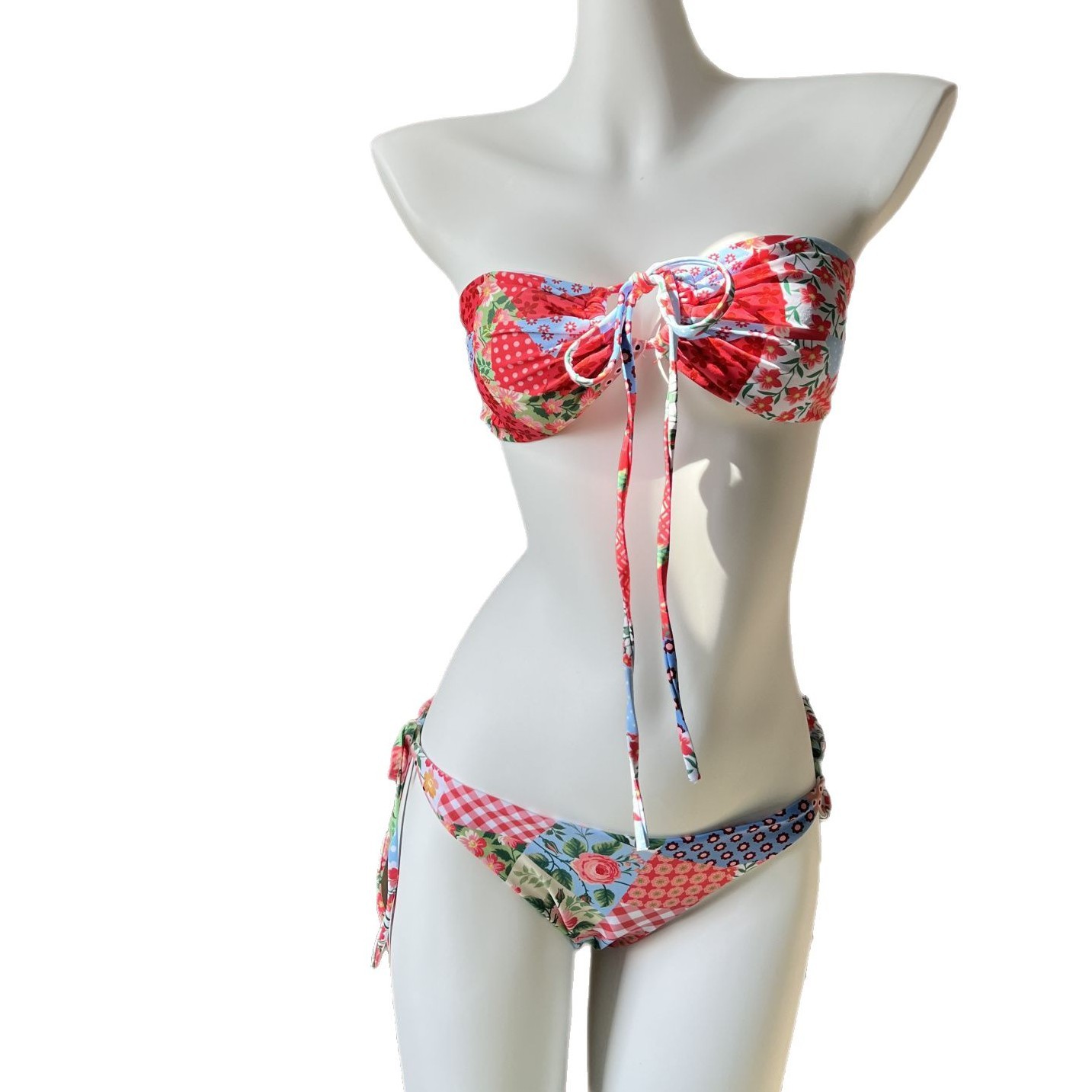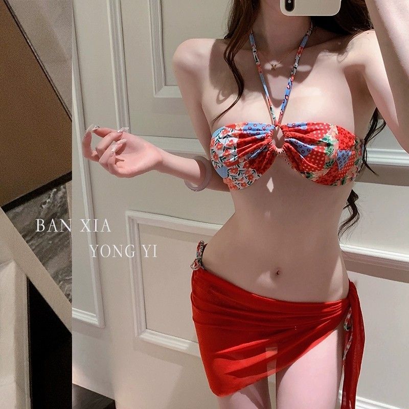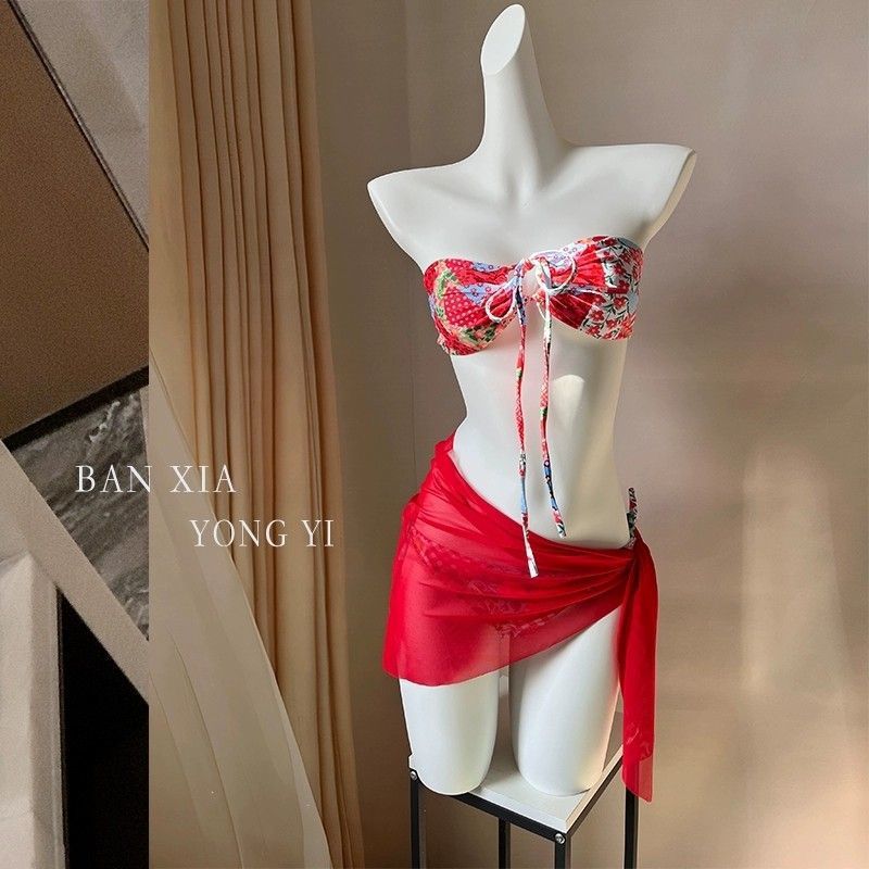 Mosricci 순수한 욕망 레드 화이트 민족 인쇄 비키니 분할 수영복 여성용 작은 가슴 튜브 상단 치마