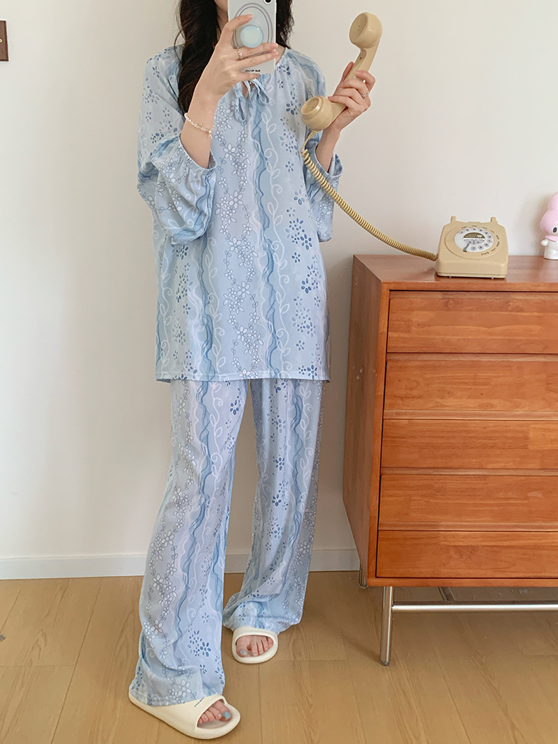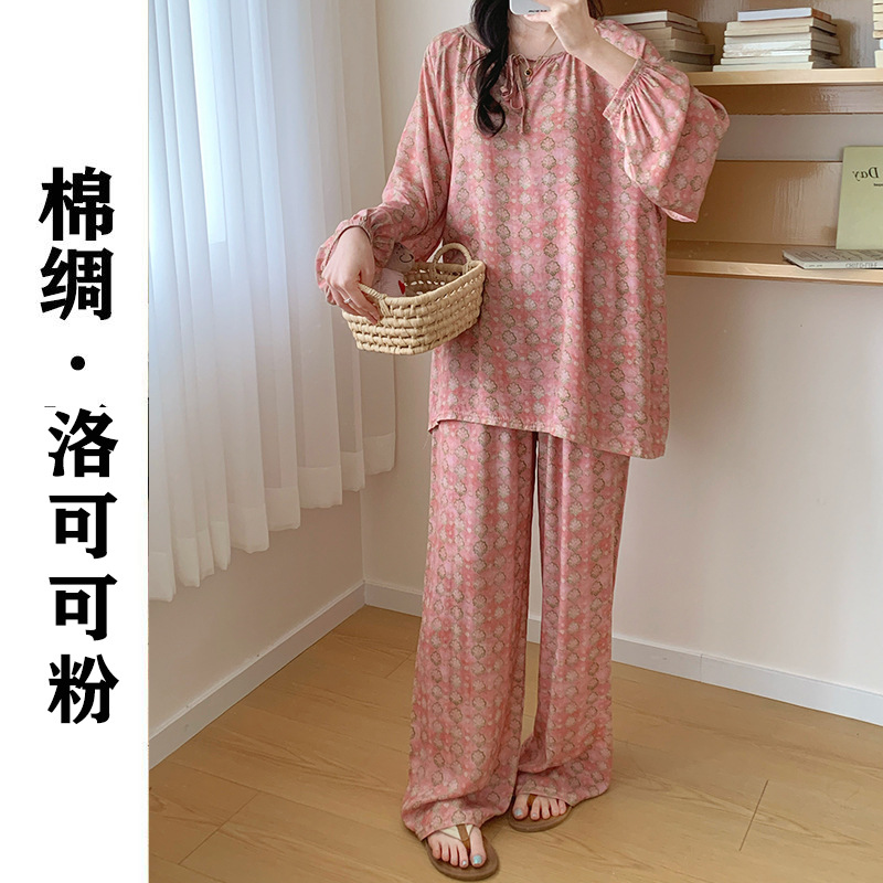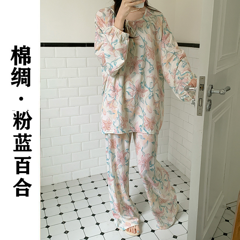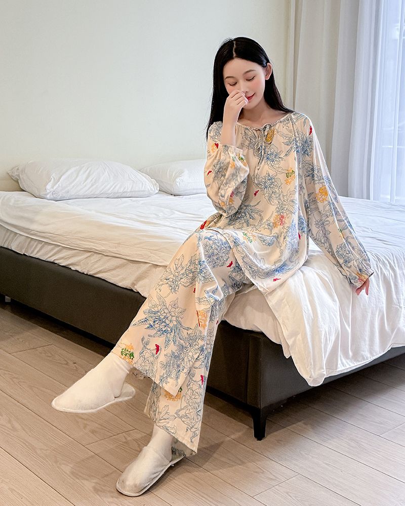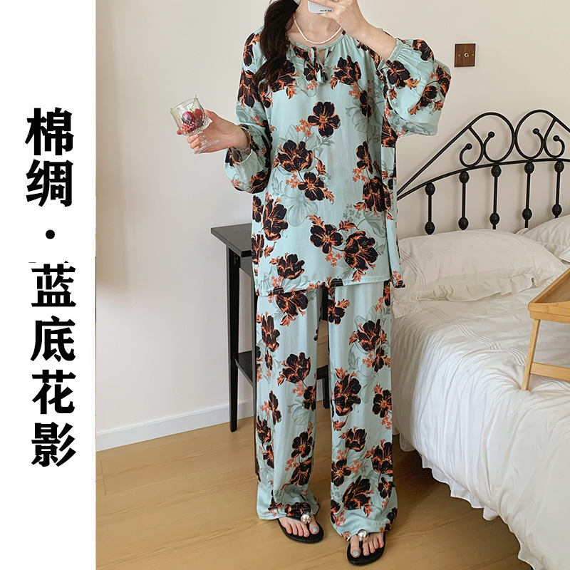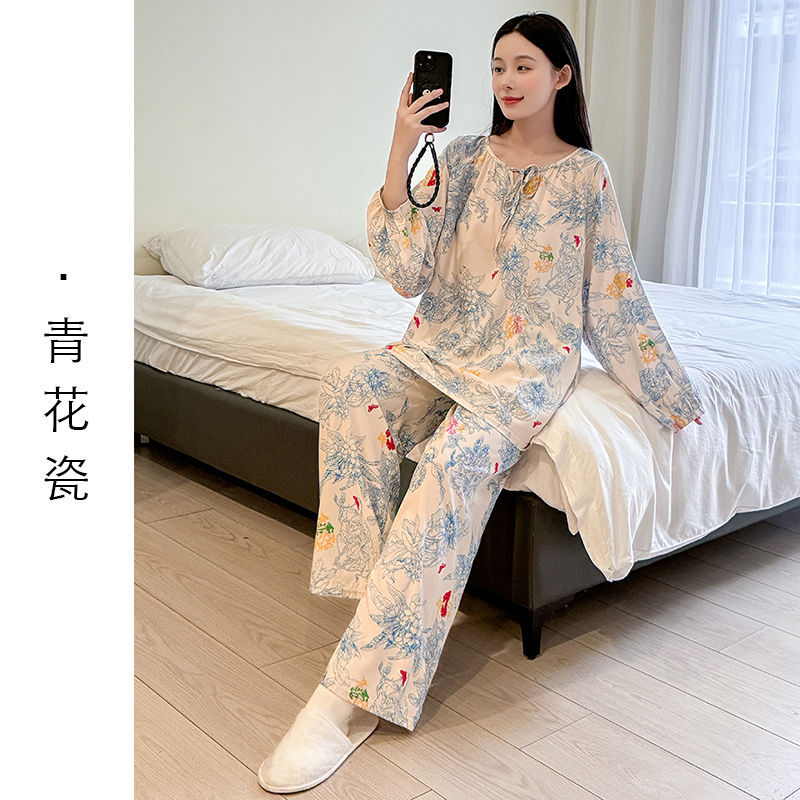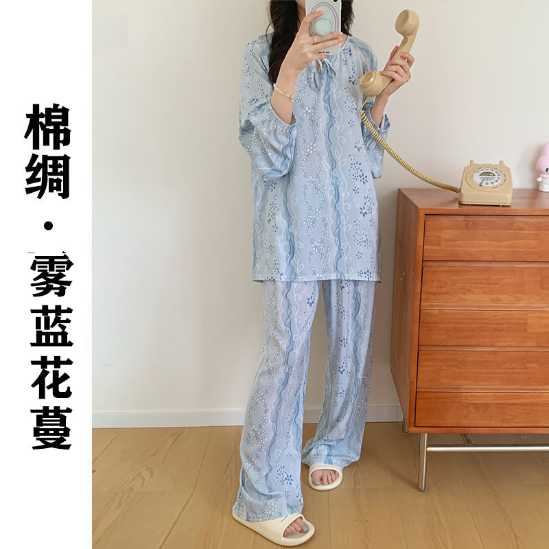 2026 청화자기 면 실크 잠옷 여성용 긴팔 긴바지 세트, 롱 스타일 얇은 중국풍 홈웨어 봄, 가을, 여름용스토어 가기
