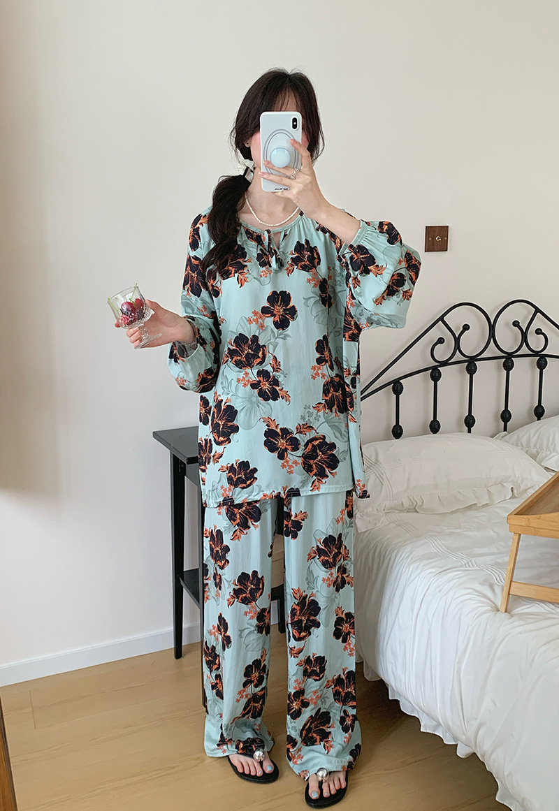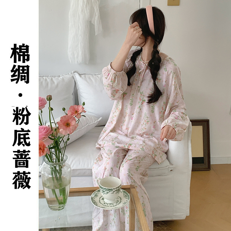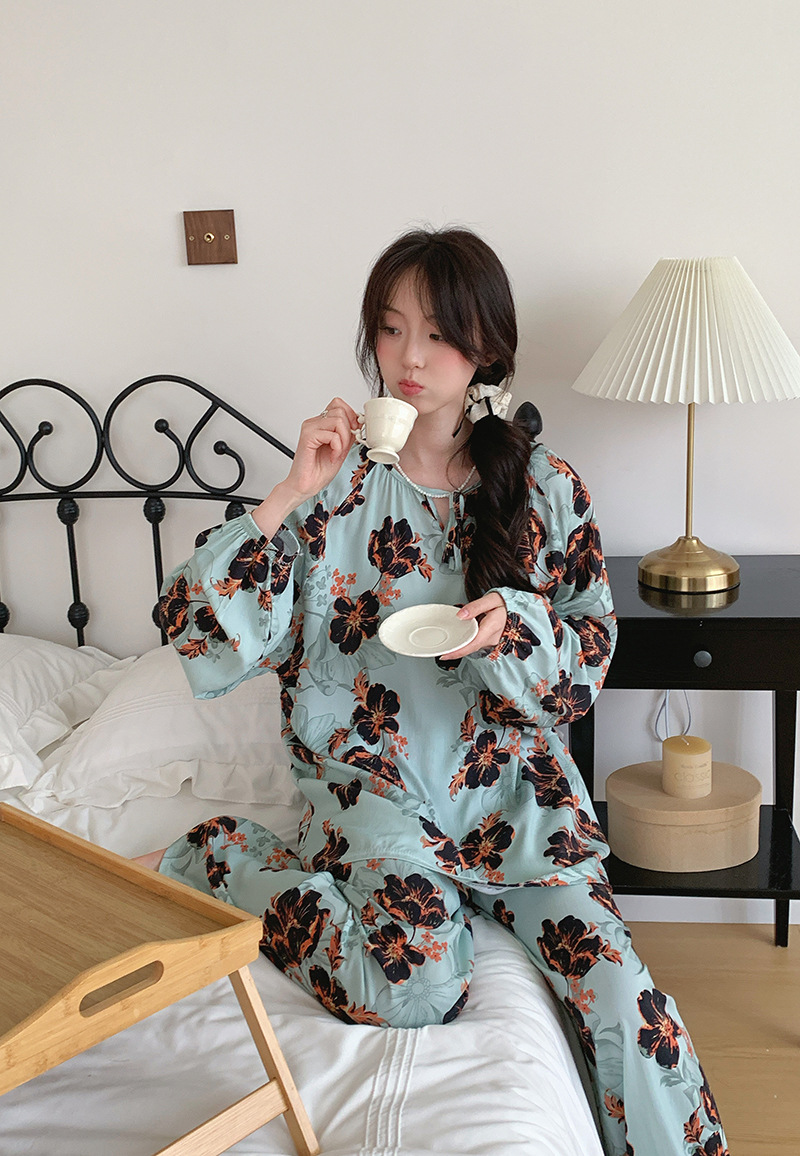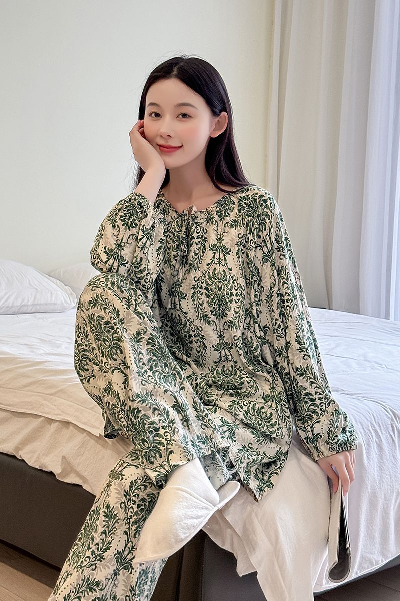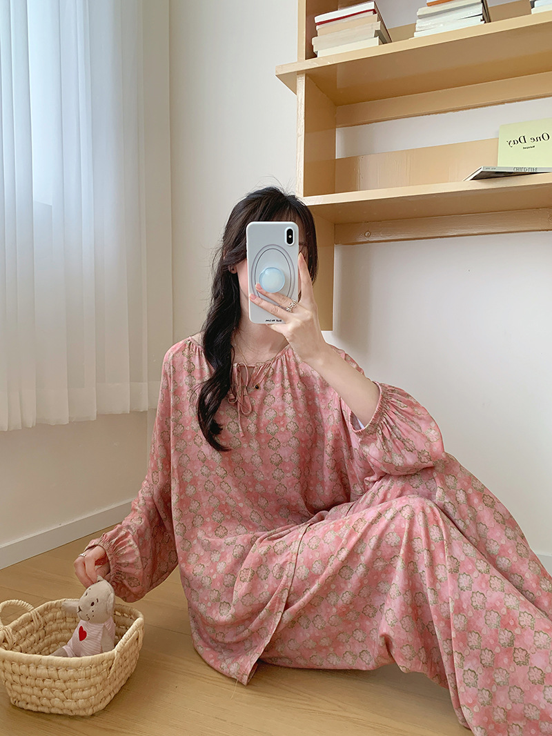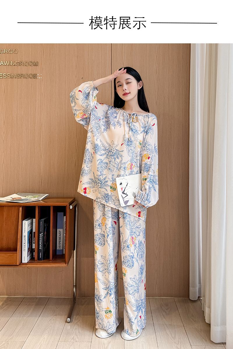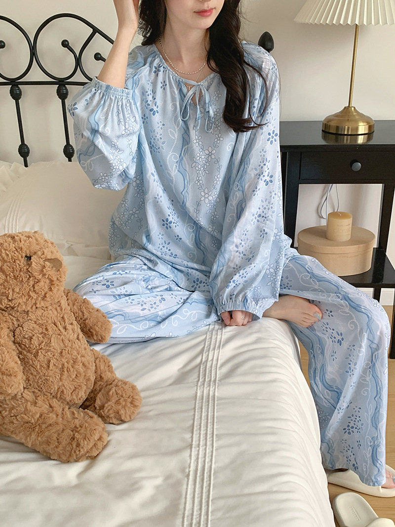 2026 청화자기 면 실크 잠옷 여성용 긴팔 긴바지 세트, 롱 스타일 얇은 중국풍 홈웨어 봄, 가을, 여름용스토어 가기