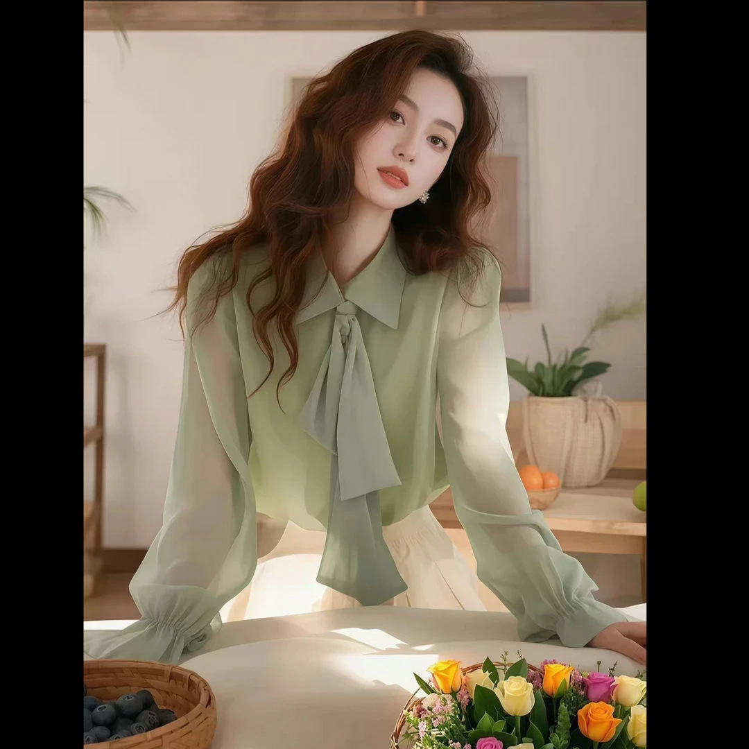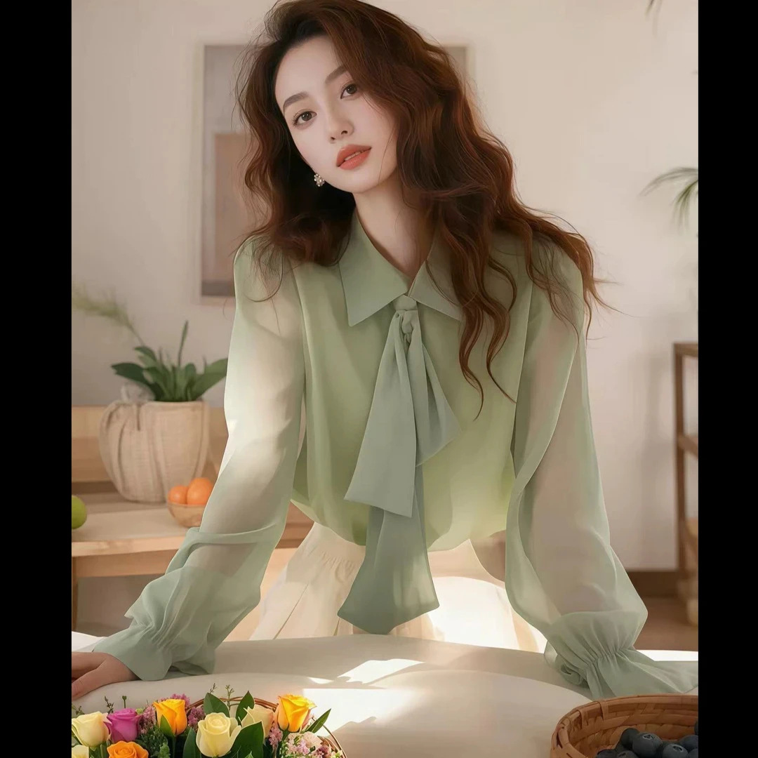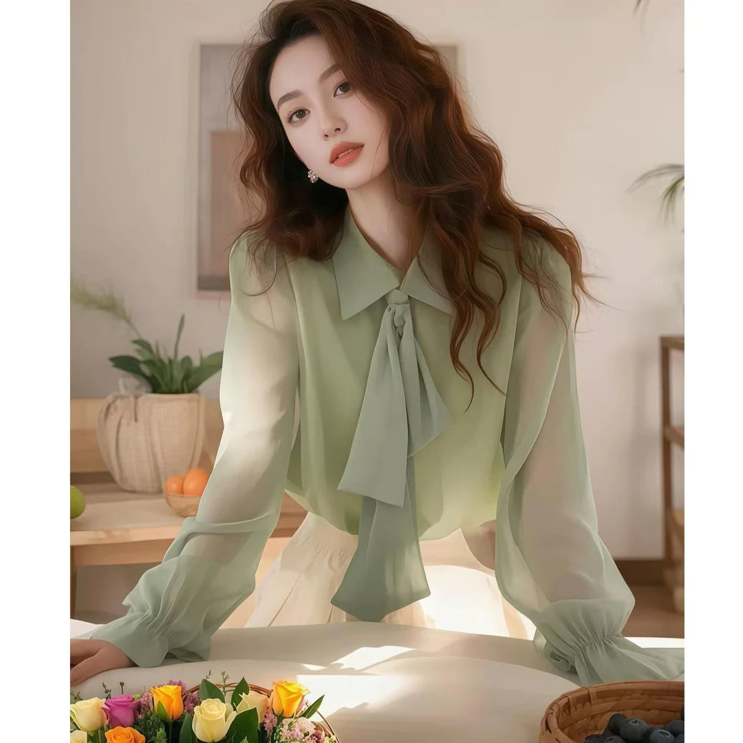 녹색 활 셔츠 여성 전문 봄 슈퍼 잘 생긴 독특한 아름다운 탑 2025 새로운 쉬폰 작은 셔츠스토어 가기