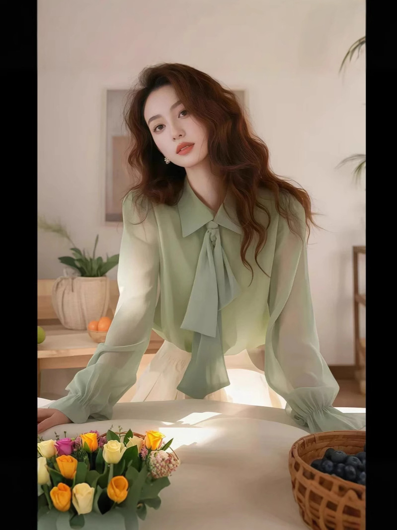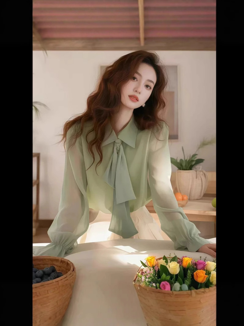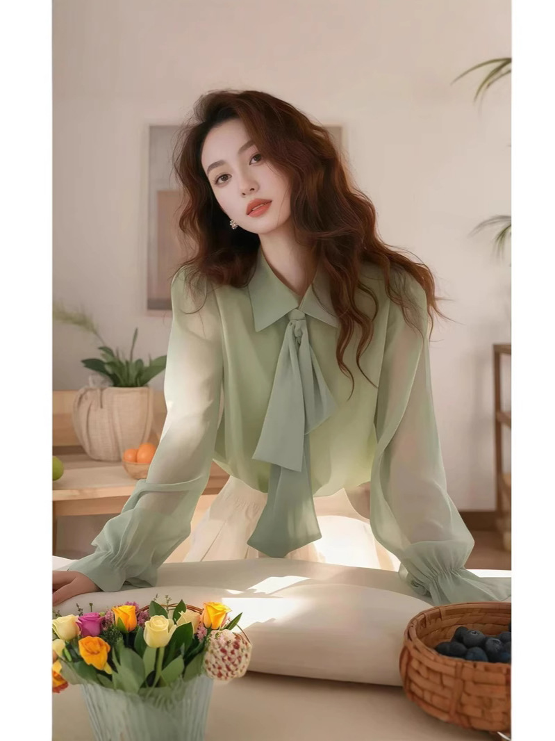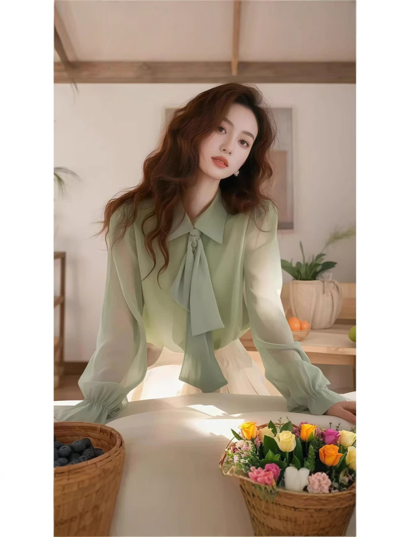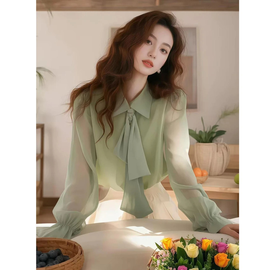 녹색 활 셔츠 여성 전문 봄 슈퍼 잘 생긴 독특한 아름다운 탑 2025 새로운 쉬폰 작은 셔츠스토어 가기