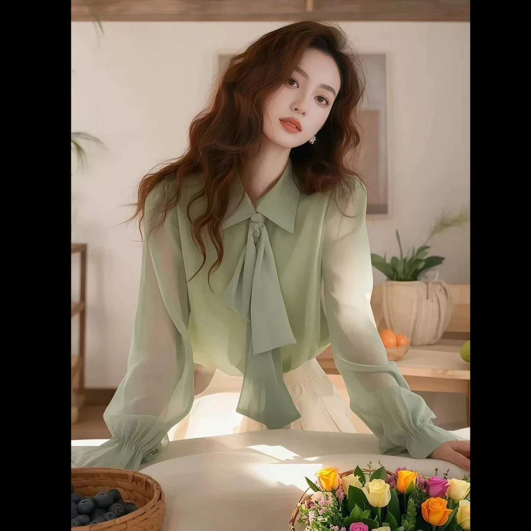 녹색 활 셔츠 여성 전문 봄 슈퍼 잘 생긴 독특한 아름다운 탑 2025 새로운 쉬폰 작은 셔츠