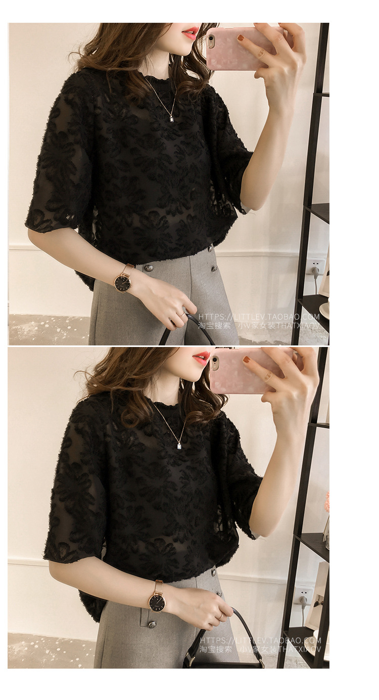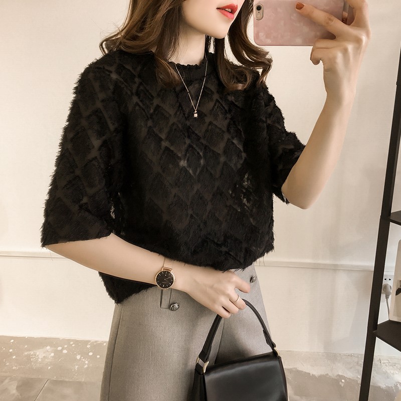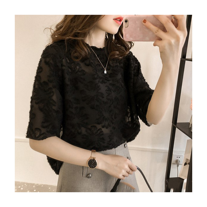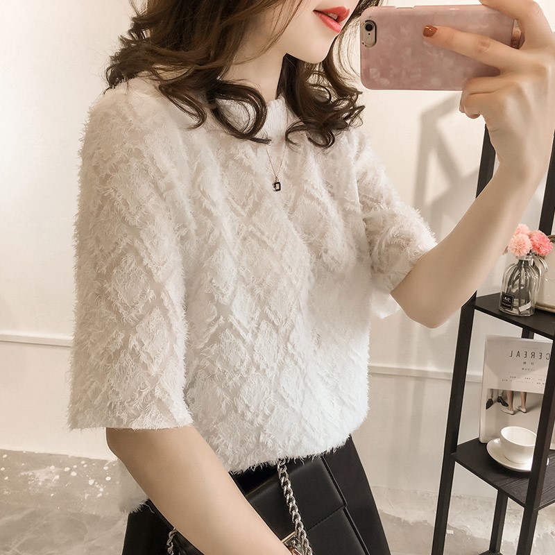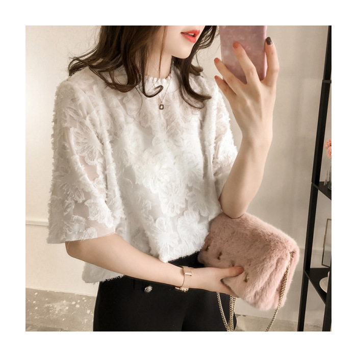 쉬폰 레이스 반소매 모피 가장자리 꽃 셔츠 여성의 짧은 소매 탑 여름 새로운 한국 스타일 느슨한 단색베이스 셔츠