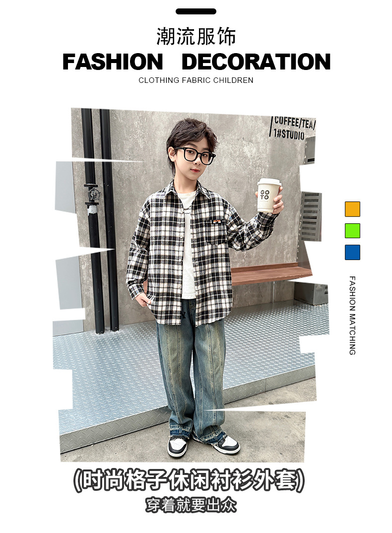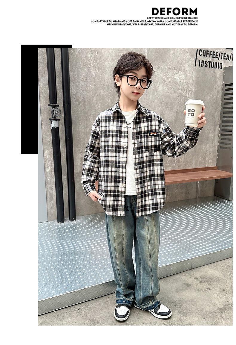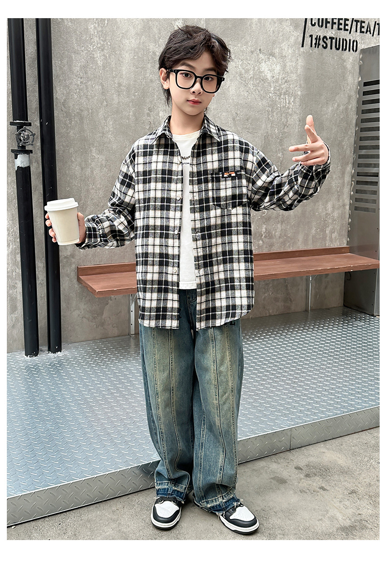 어린이 새로운 유행 어린이 남성 및 여성 격자 무늬 셔츠 2025 면 긴 소매 셔츠 대형 어린이 대형 격자 무늬 캐주얼 셔츠스토어 가기