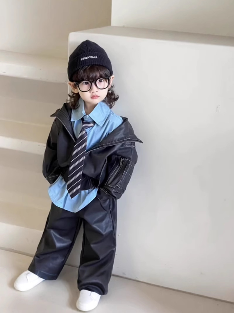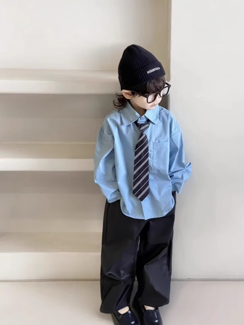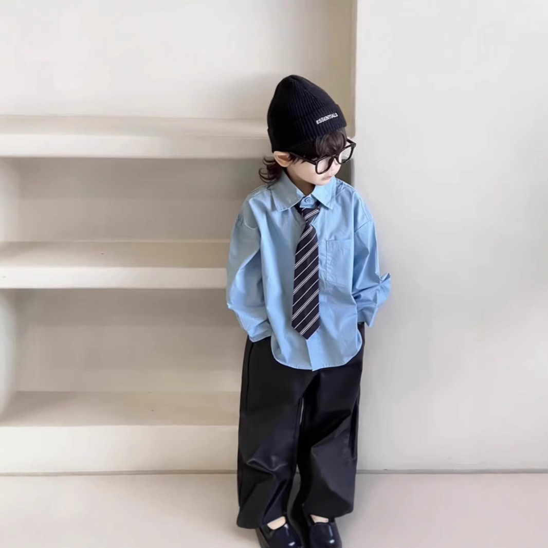 2025 새로운 한국식 봄 여름 아동복 어린이 블루 셔츠 소년의 스타일리시 한 넥타이 탑스토어 가기