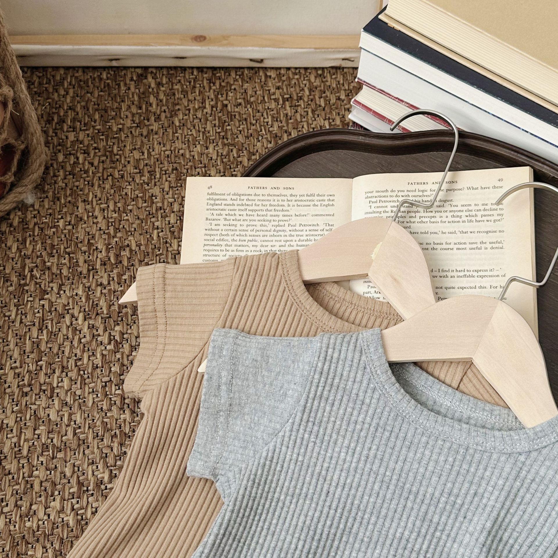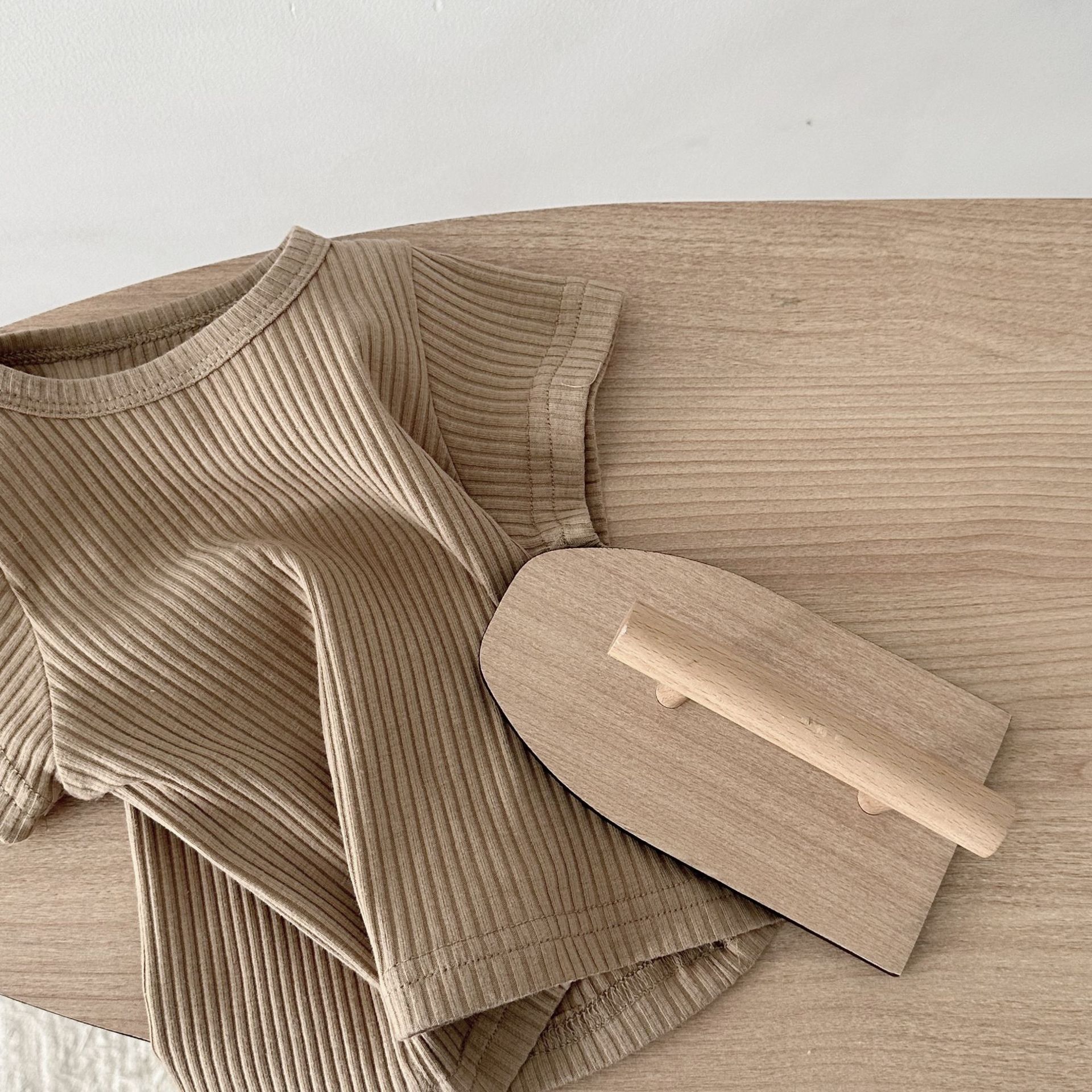 • 라이트 브라운 라운드넥 반팔 스트라이프 밑단 셔츠