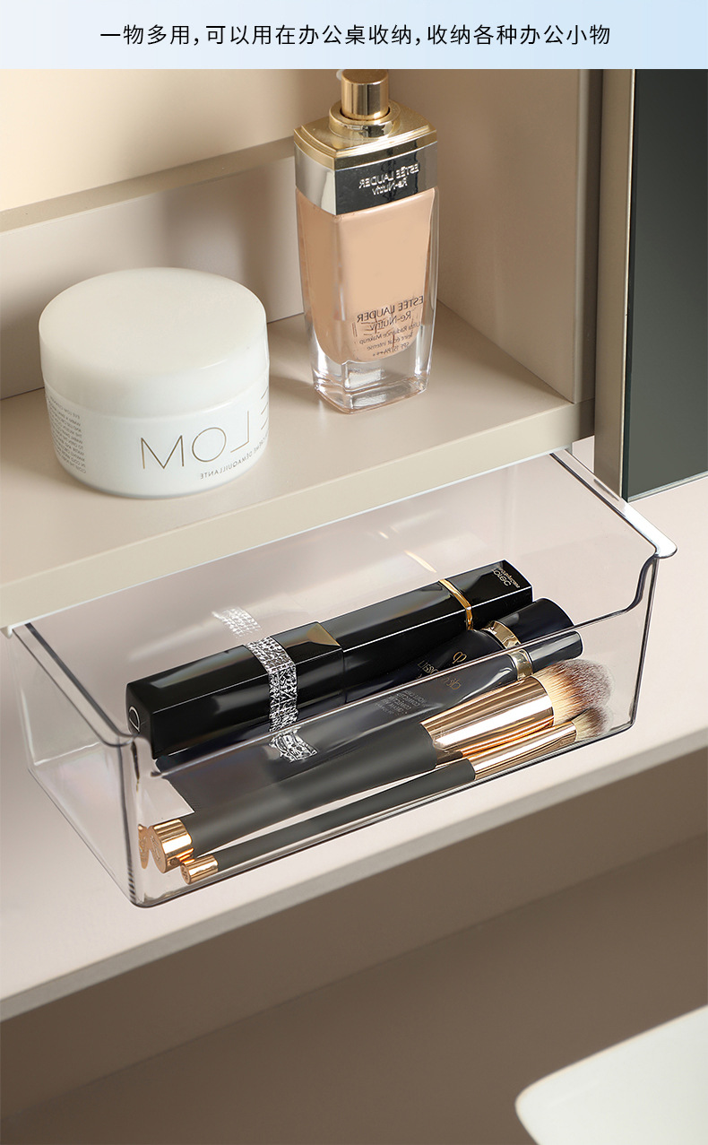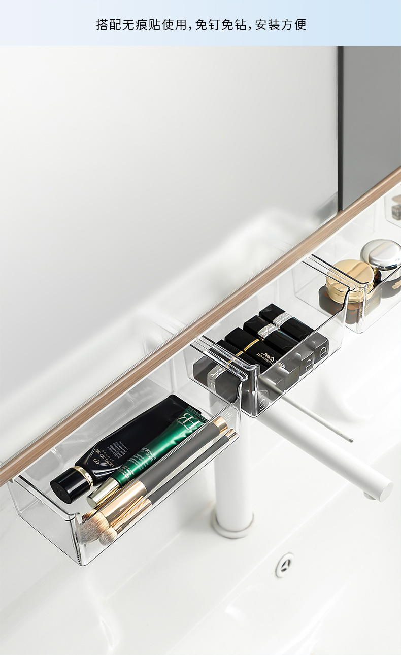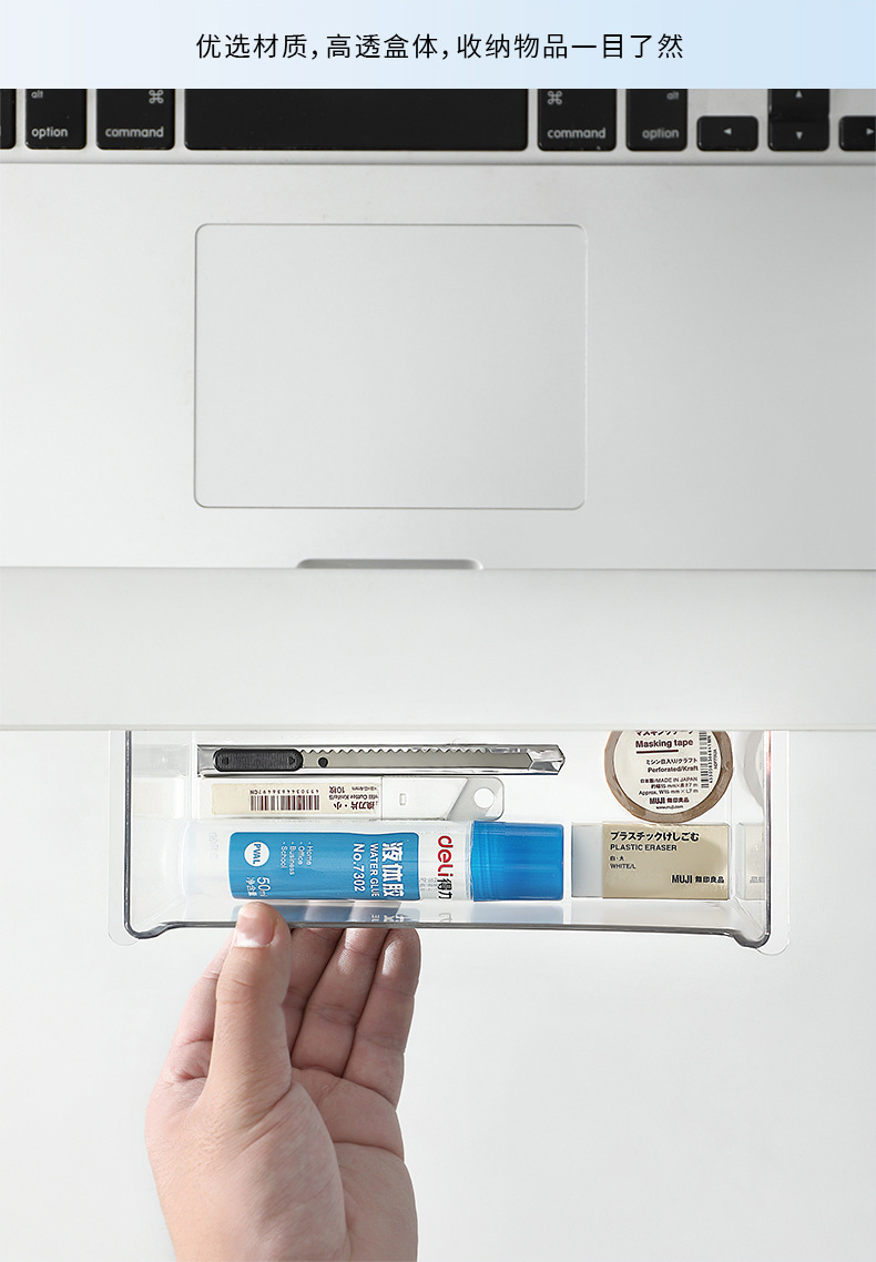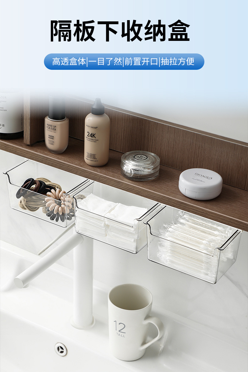 • 商品名称:日式无痕粘贴衣柜橱柜桌下隔板下抽拉收纳盒--透明 小号短款