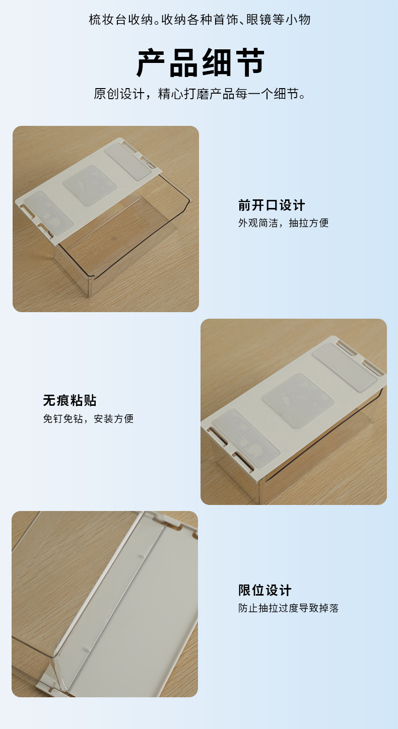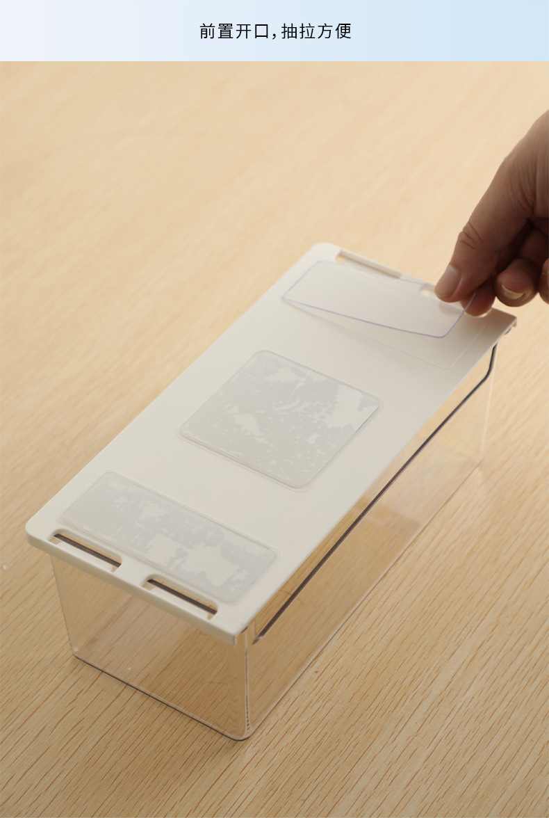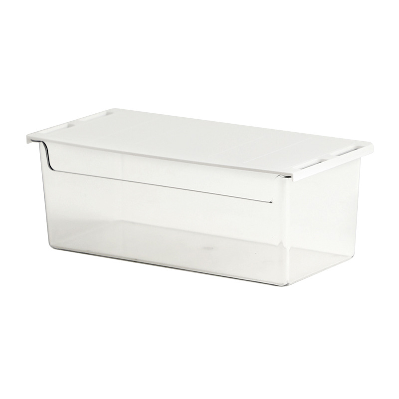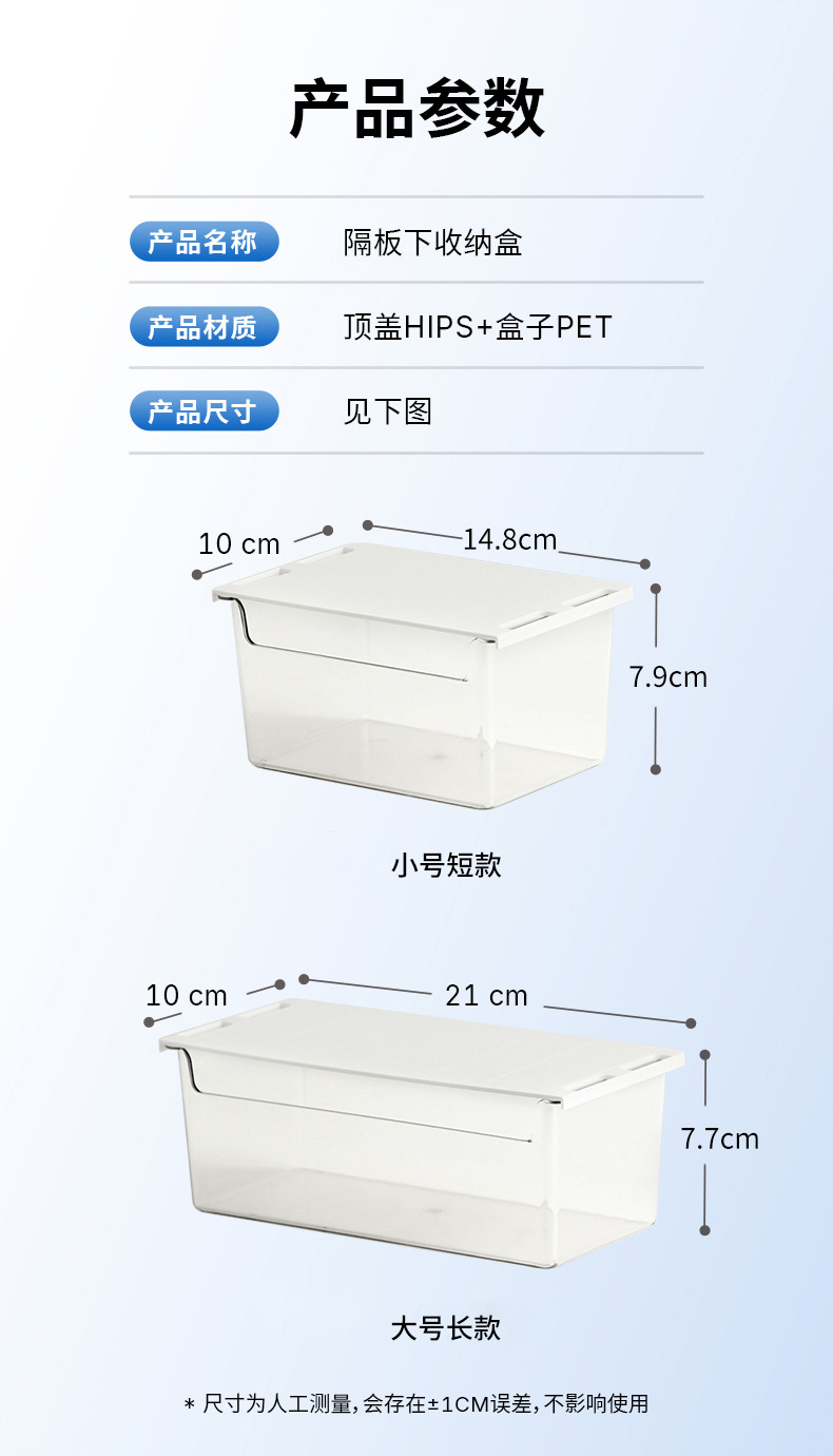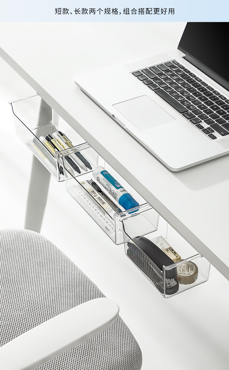 • 商品名称:日式无痕粘贴衣柜橱柜桌下隔板下抽拉收纳盒--透明 小号短款