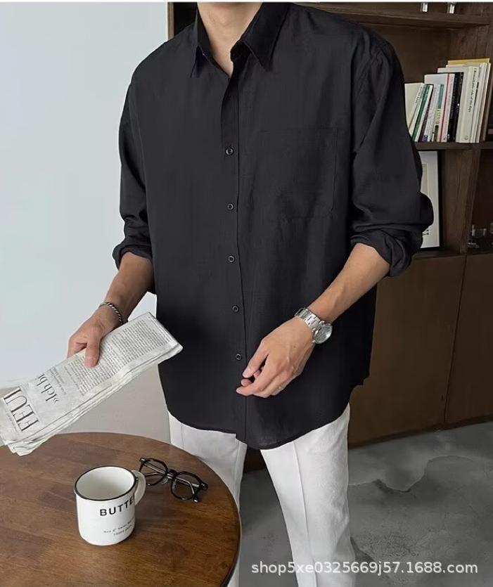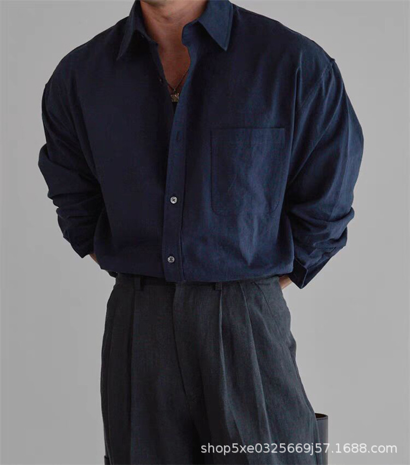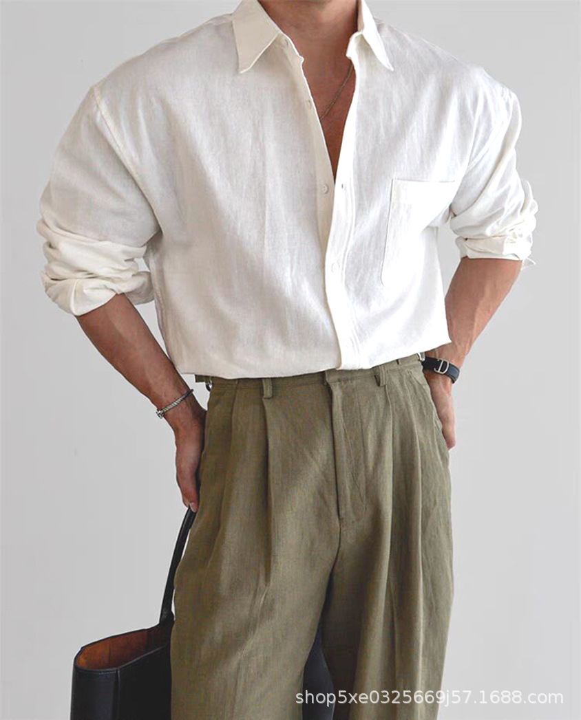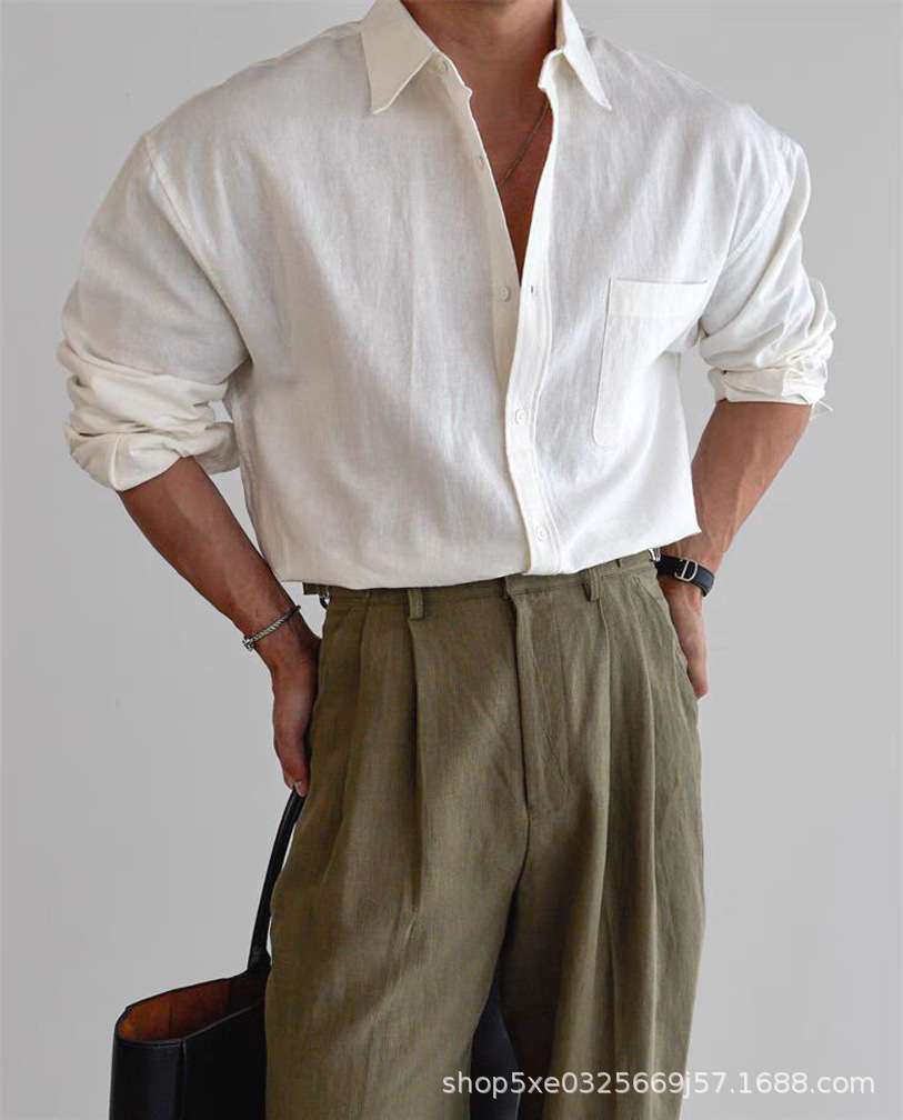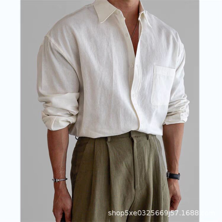 유럽면 리넨 화이트 셔츠 남성용 하이 엔드 루즈 긴팔 태양 보호 의류 린넨 통기성 셔츠 포켓 작업복 셔츠스토어 가기