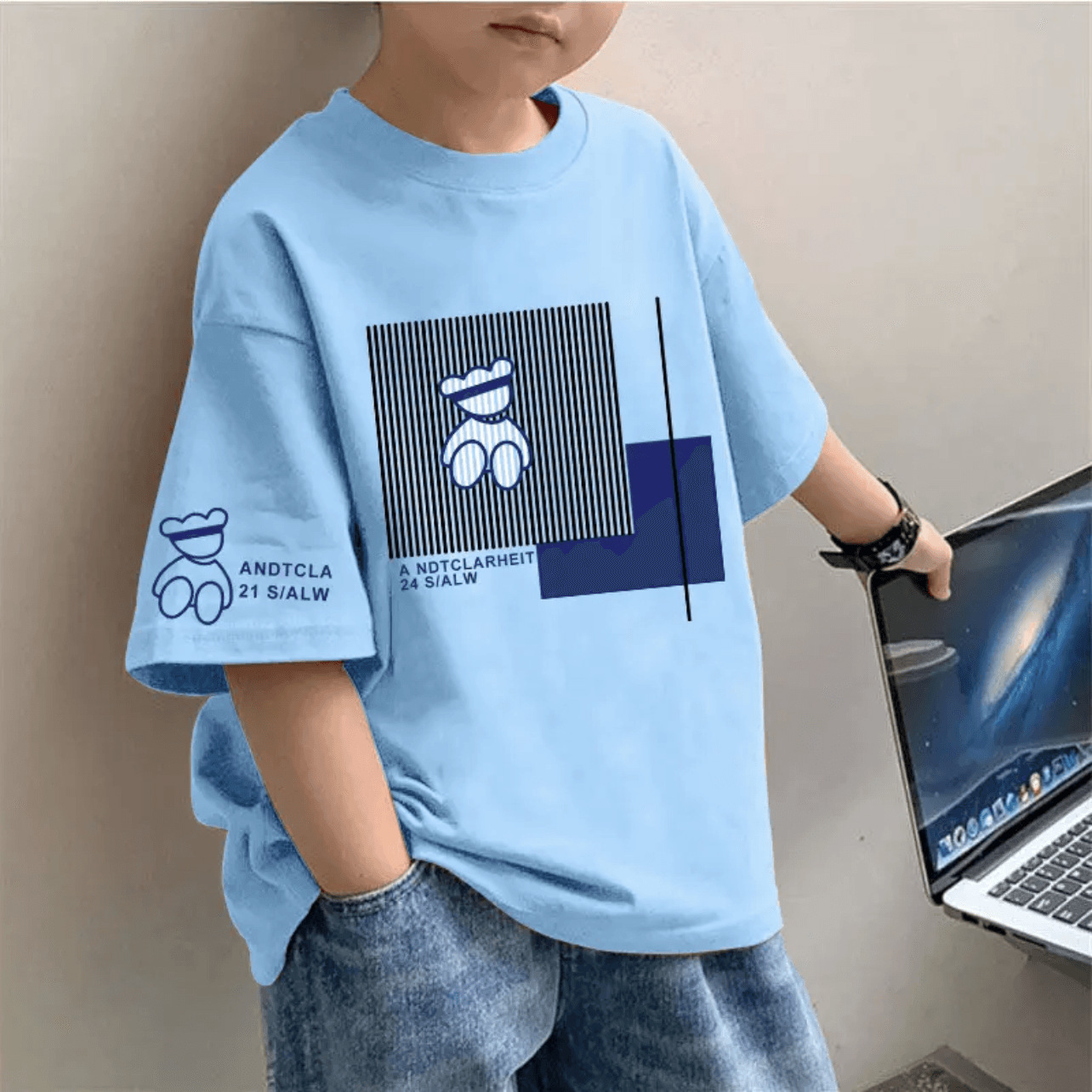 • 라이트 블루 라인 베어 [소맷단에 큰 그림 인쇄]