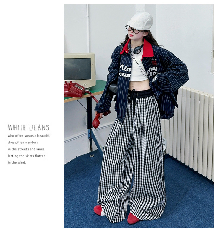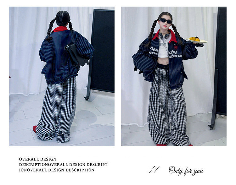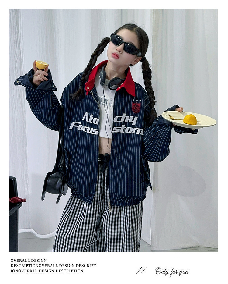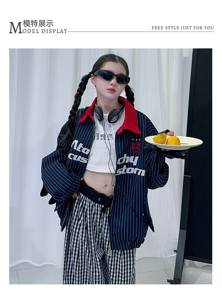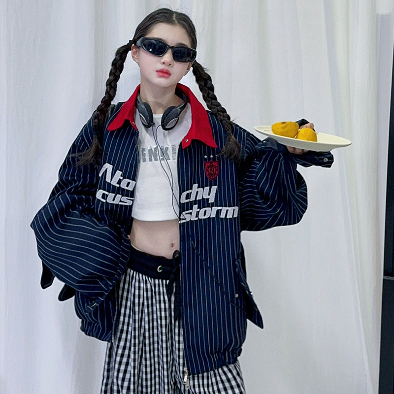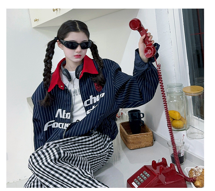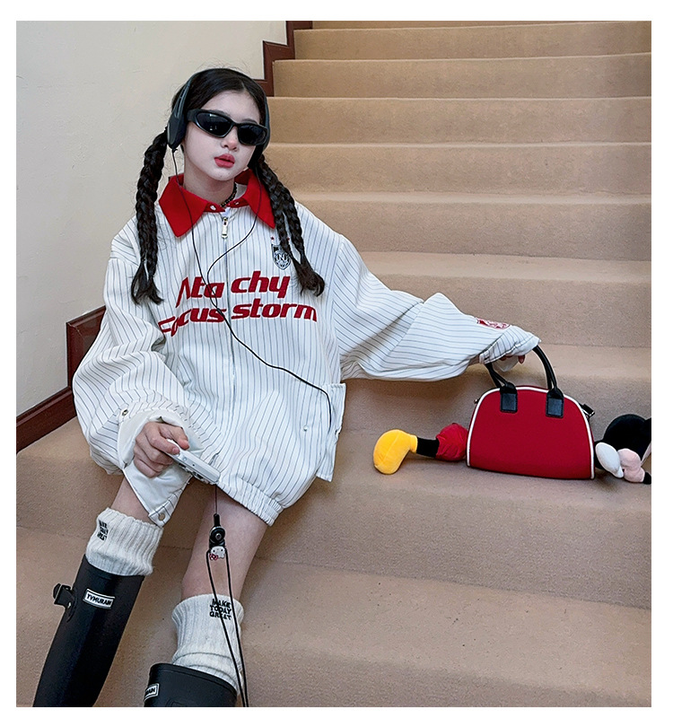 소녀 수직 패턴 야구 세트 2025 봄과 가을 새로운 미국 스타일 레트로 콘트라스트 코트 큰 어린이 느슨한 캐주얼 재킷