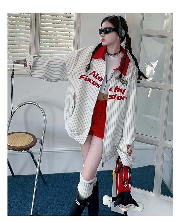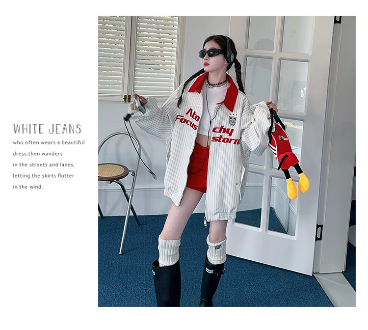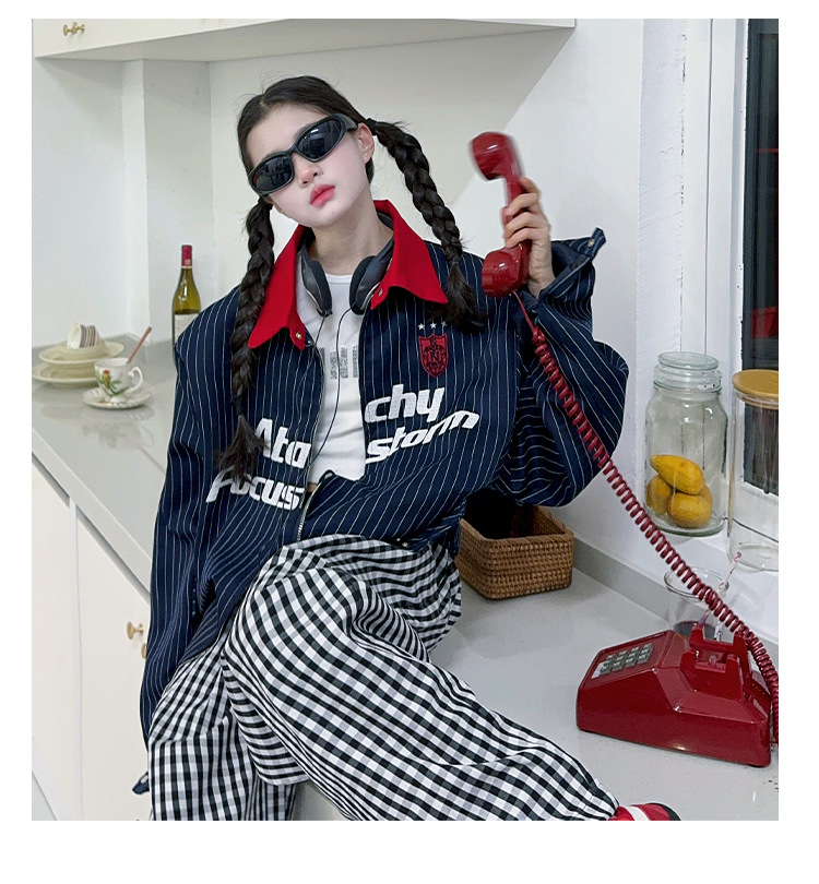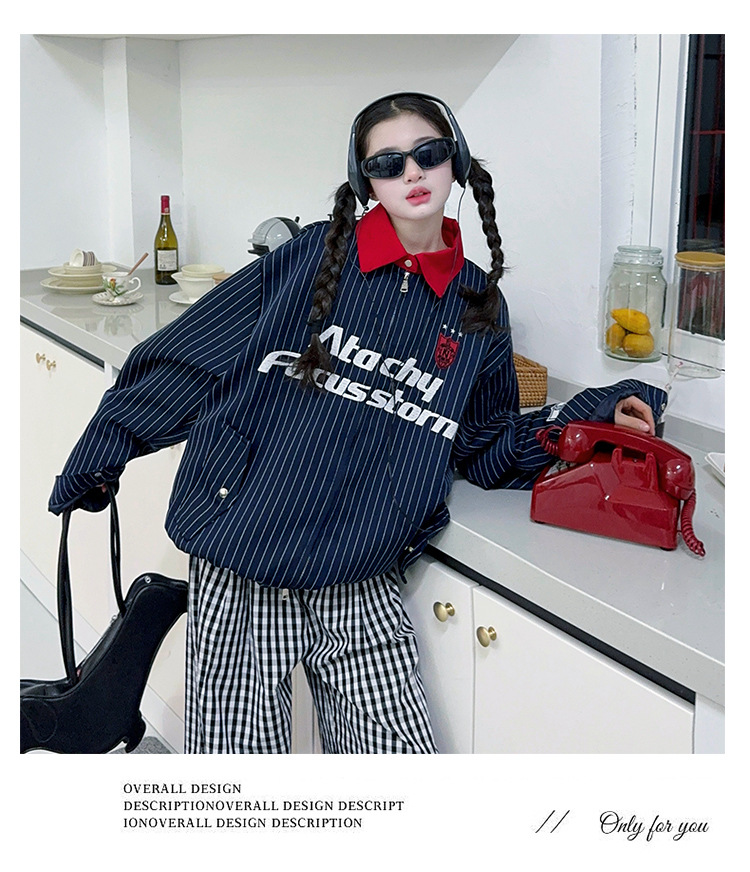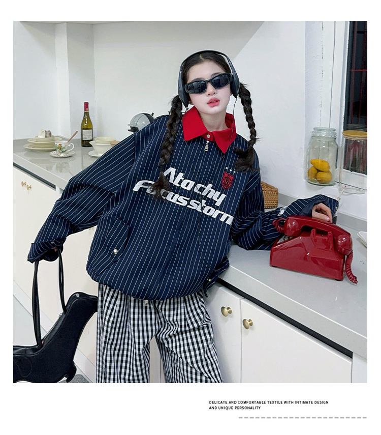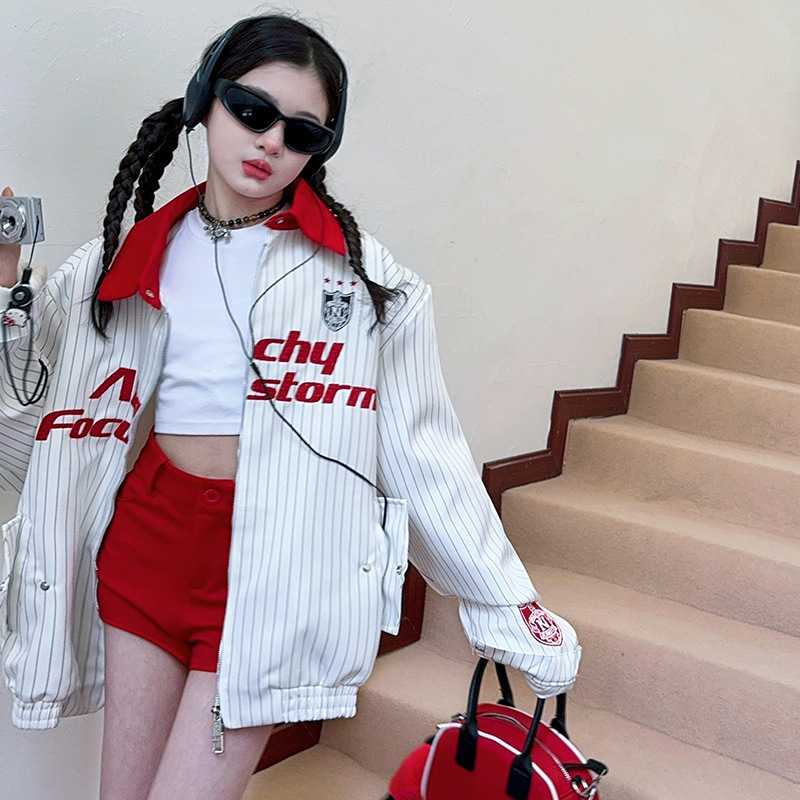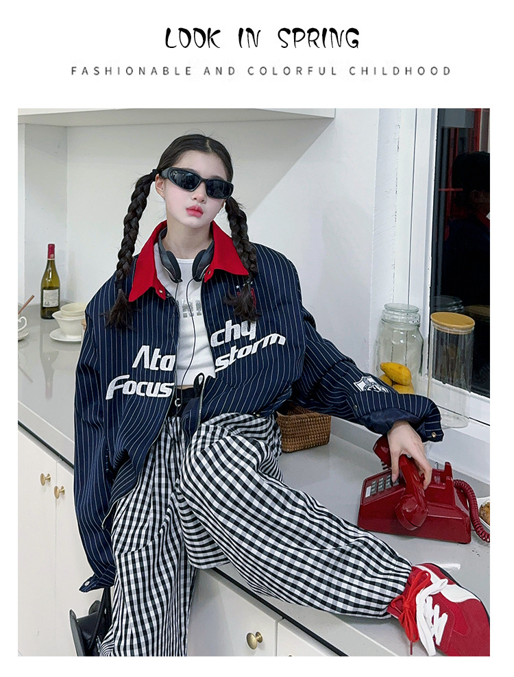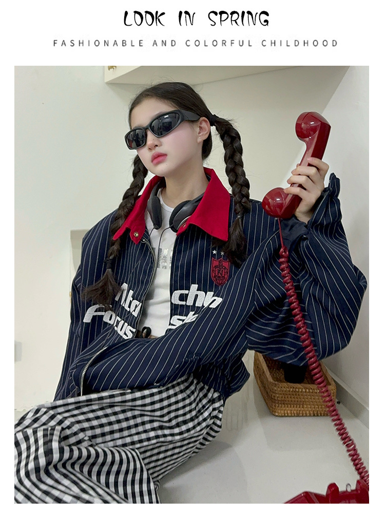 소녀 수직 패턴 야구 세트 2025 봄과 가을 새로운 미국 스타일 레트로 콘트라스트 코트 큰 어린이 느슨한 캐주얼 재킷스토어 가기