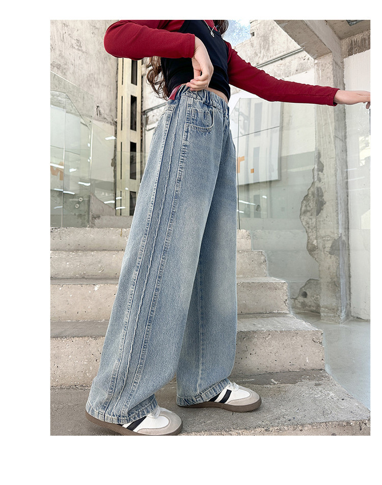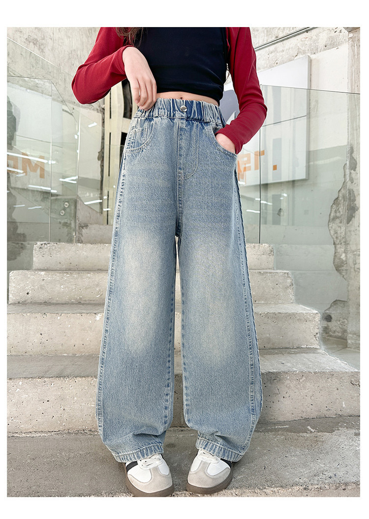 소녀의 바지 봄 2025 새로운 큰 소년 소녀의 봄과 가을 데님 스트레이트 다리 바지 느슨한 청바지 봄 착용
