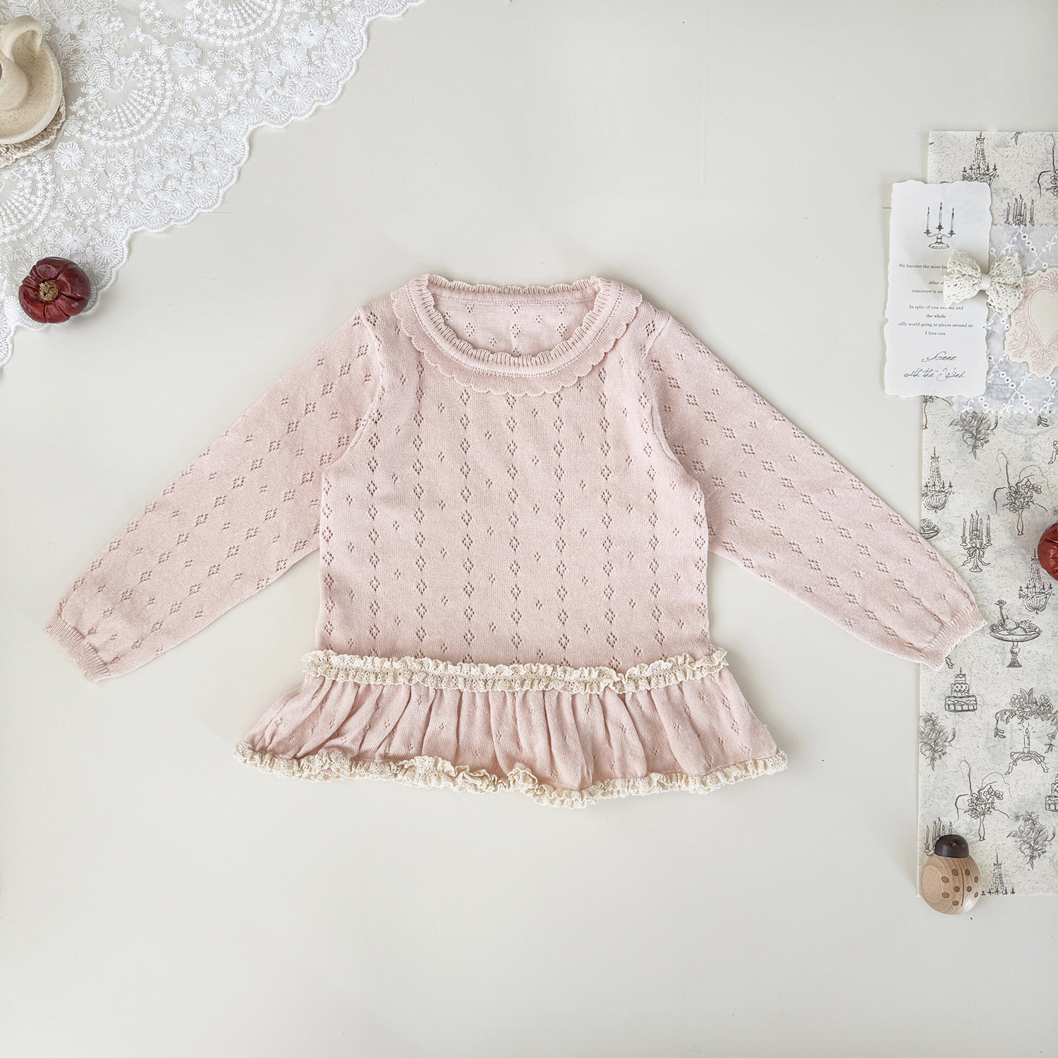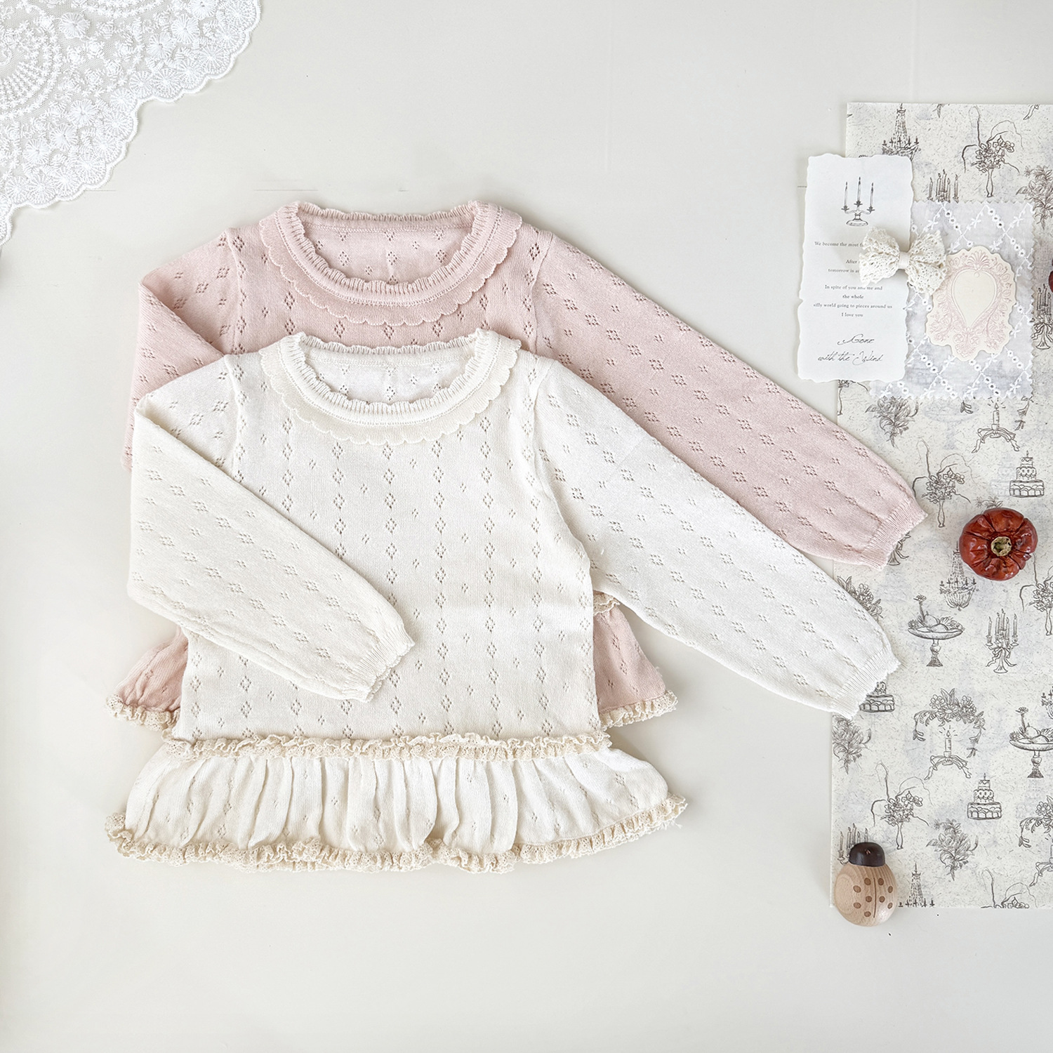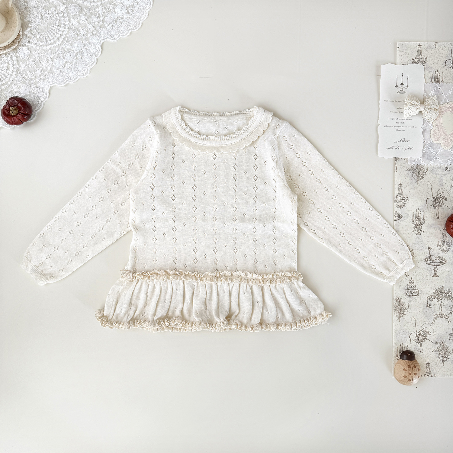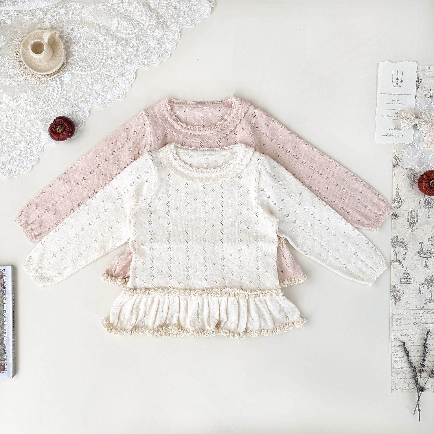 커틀리 스프링 인 베이비 소녀 풀오버 크루 넥 탑 여성용 보물 중공 레이스 스윙 긴 소매 얇은 스웨터스토어 가기