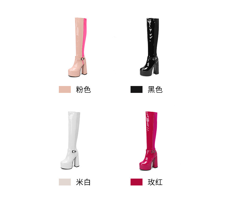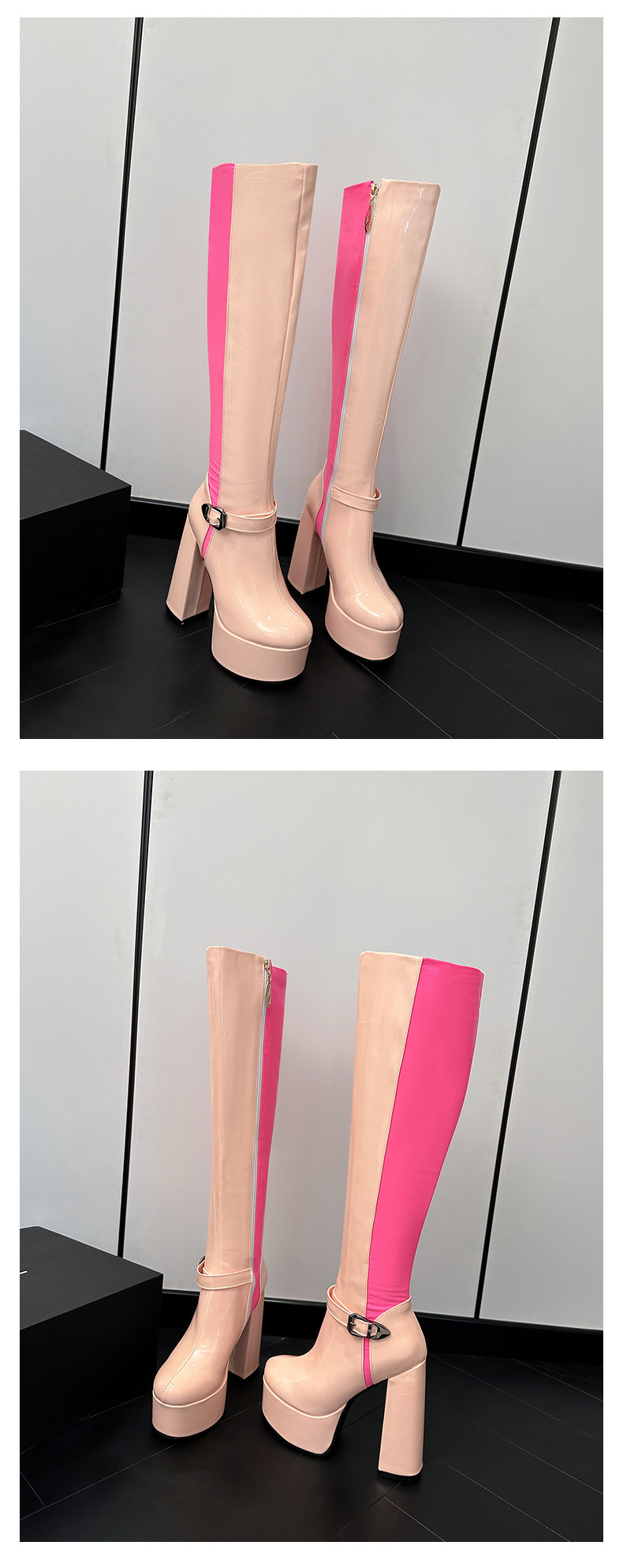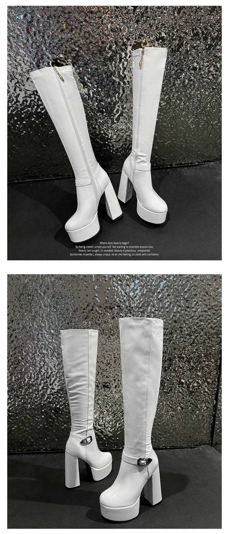 2024 가을과 겨울 새 부츠 여성이지만 두꺼운 무릎 하이힐 두꺼운 바닥 색상과 어울리는 달콤한 댄스 벨트 버클 나이트 부츠 여성