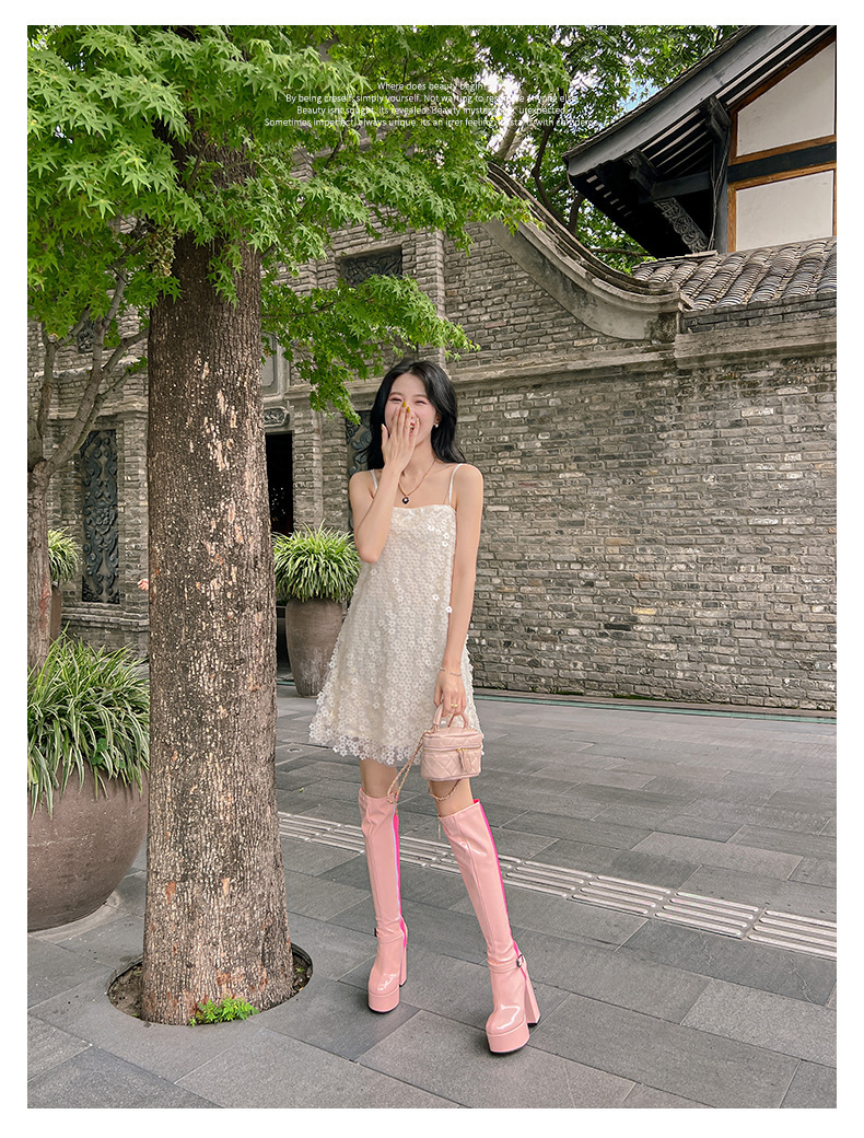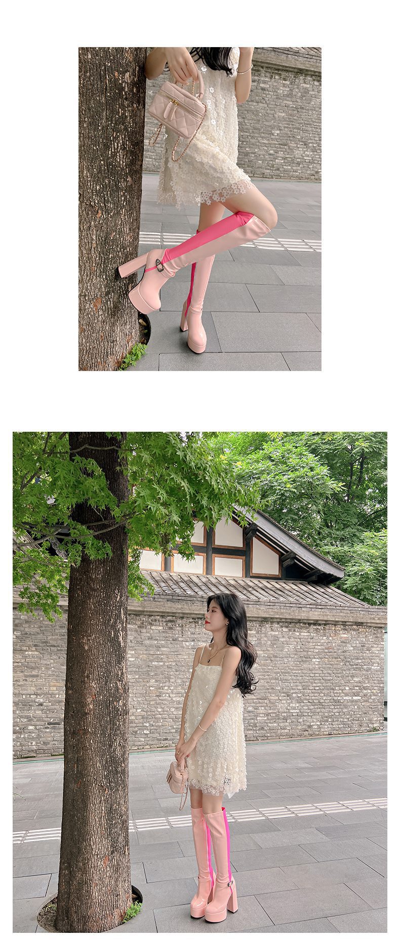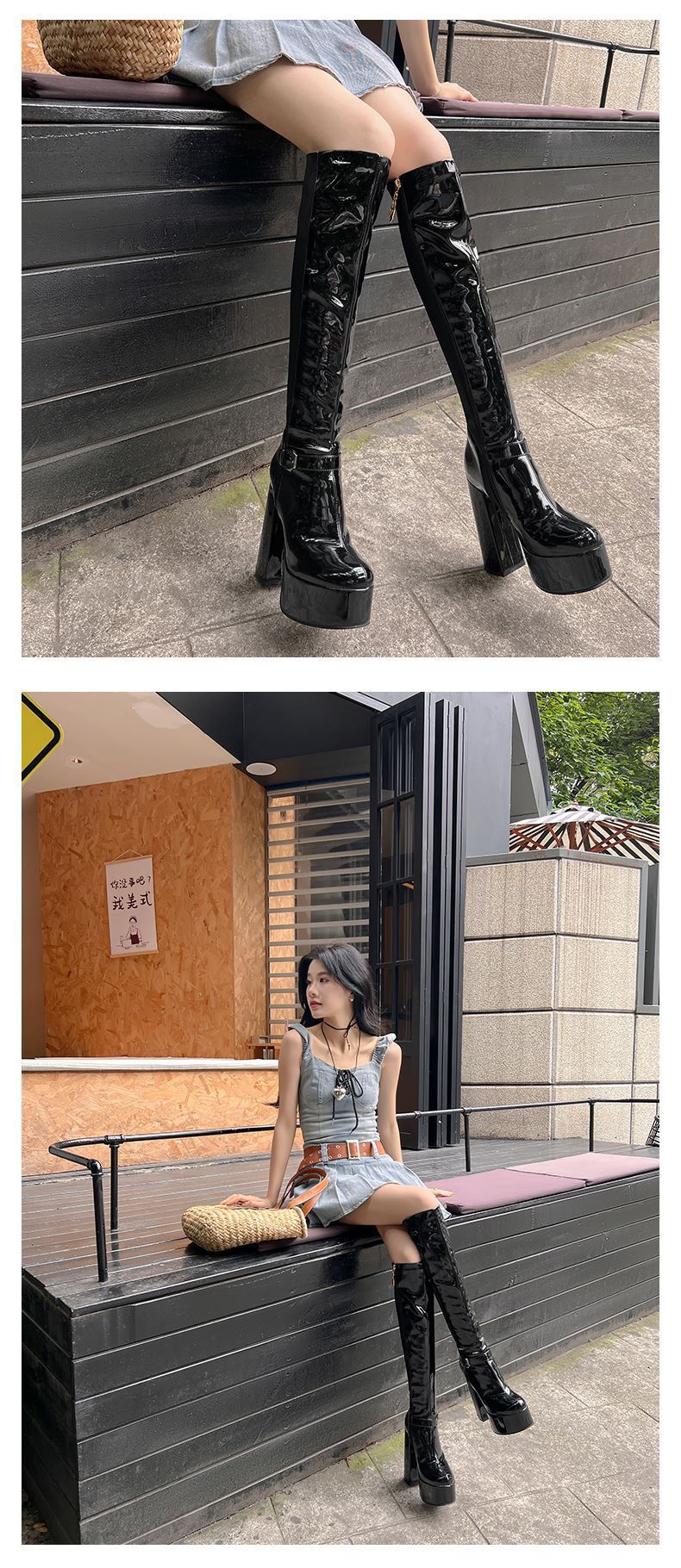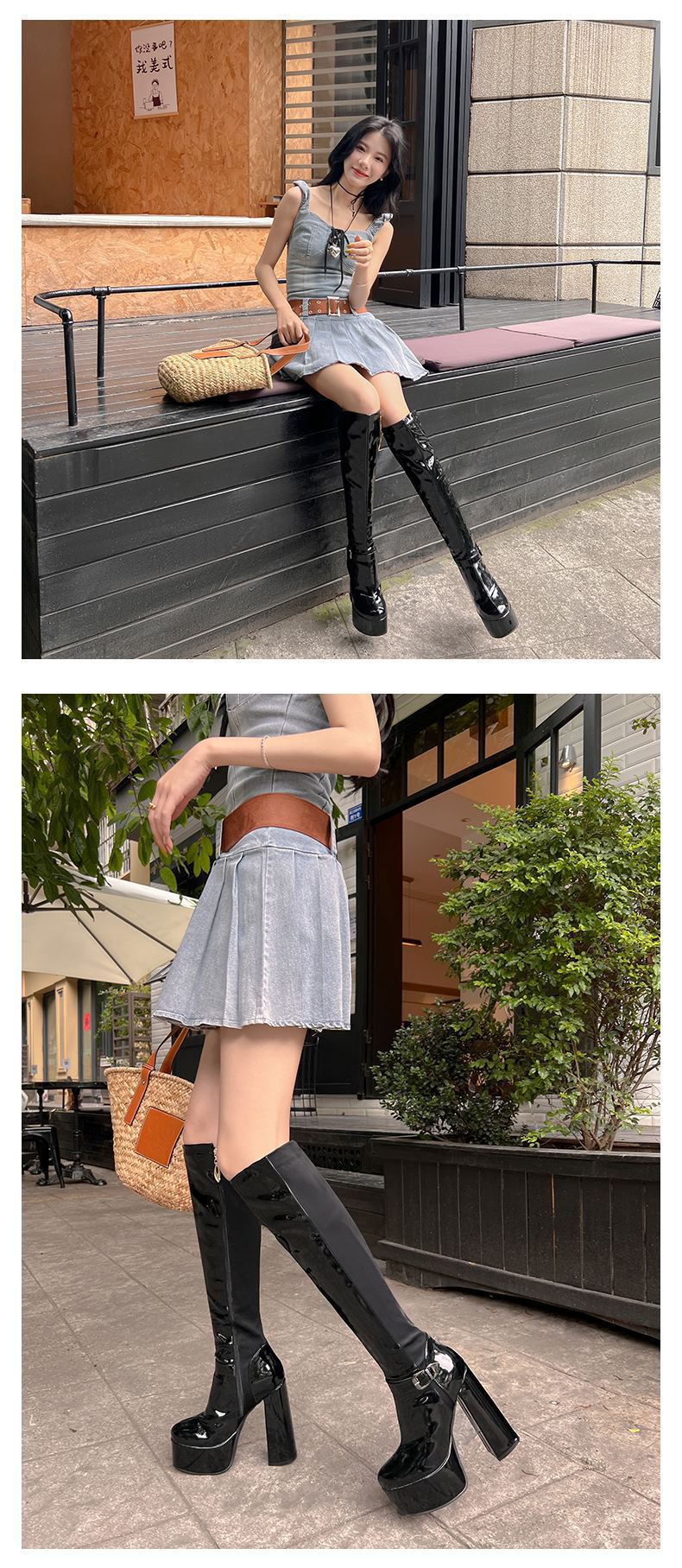 2024 가을과 겨울 새 부츠 여성이지만 두꺼운 무릎 하이힐 두꺼운 바닥 색상과 어울리는 달콤한 댄스 벨트 버클 나이트 부츠 여성스토어 가기