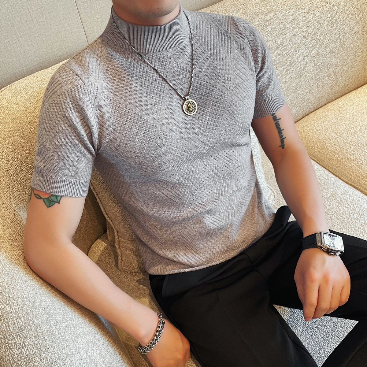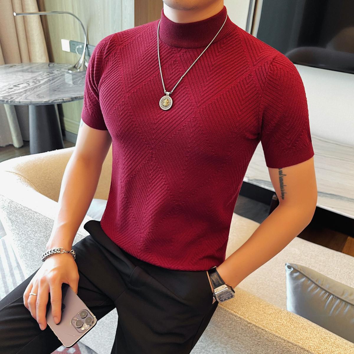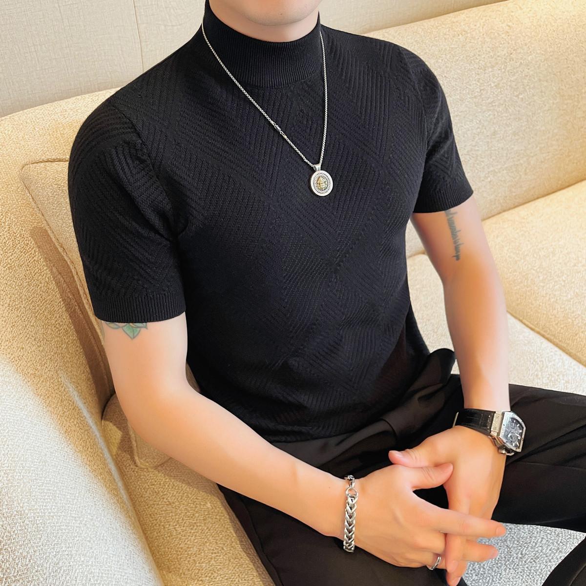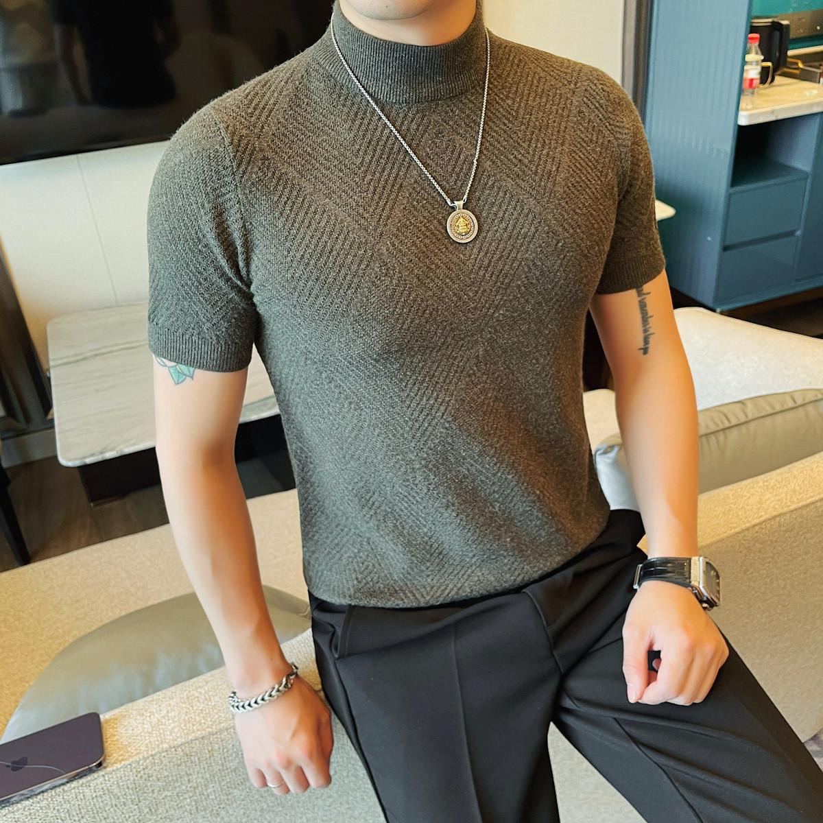 새로운 스타일의 남성용 반팔 니트 스웨터, 패셔너블한 니트 베이스 레이어, 봄 여름 남성용 중간 칼라 니트 반팔 스웨터스토어 가기