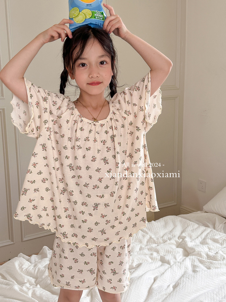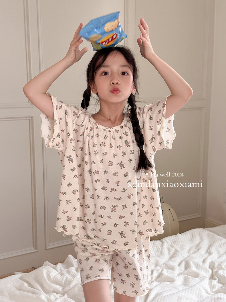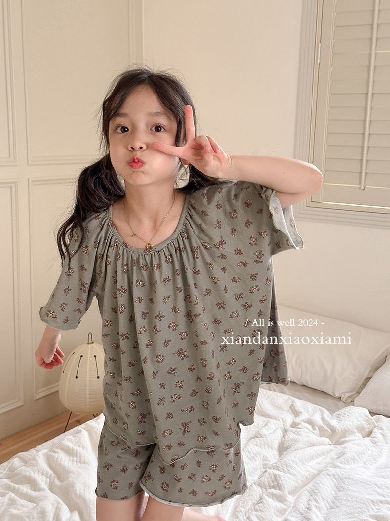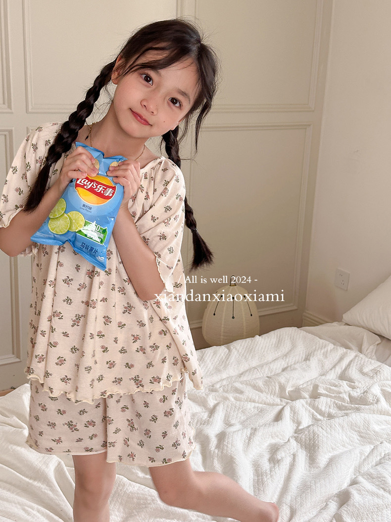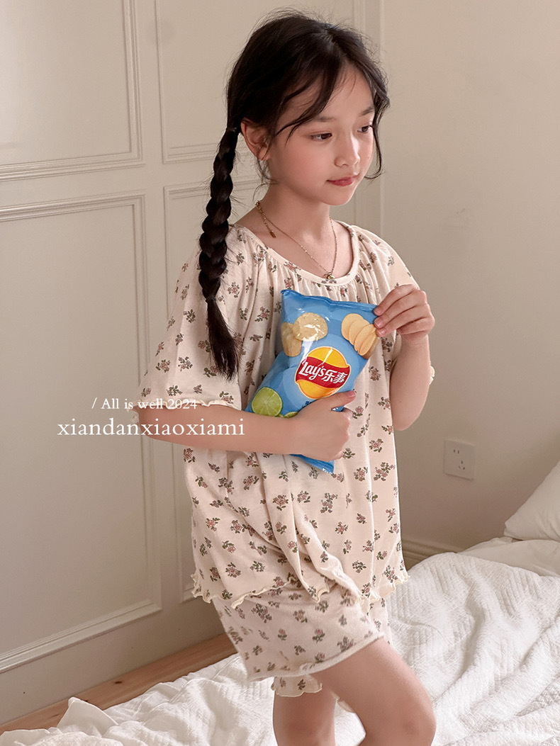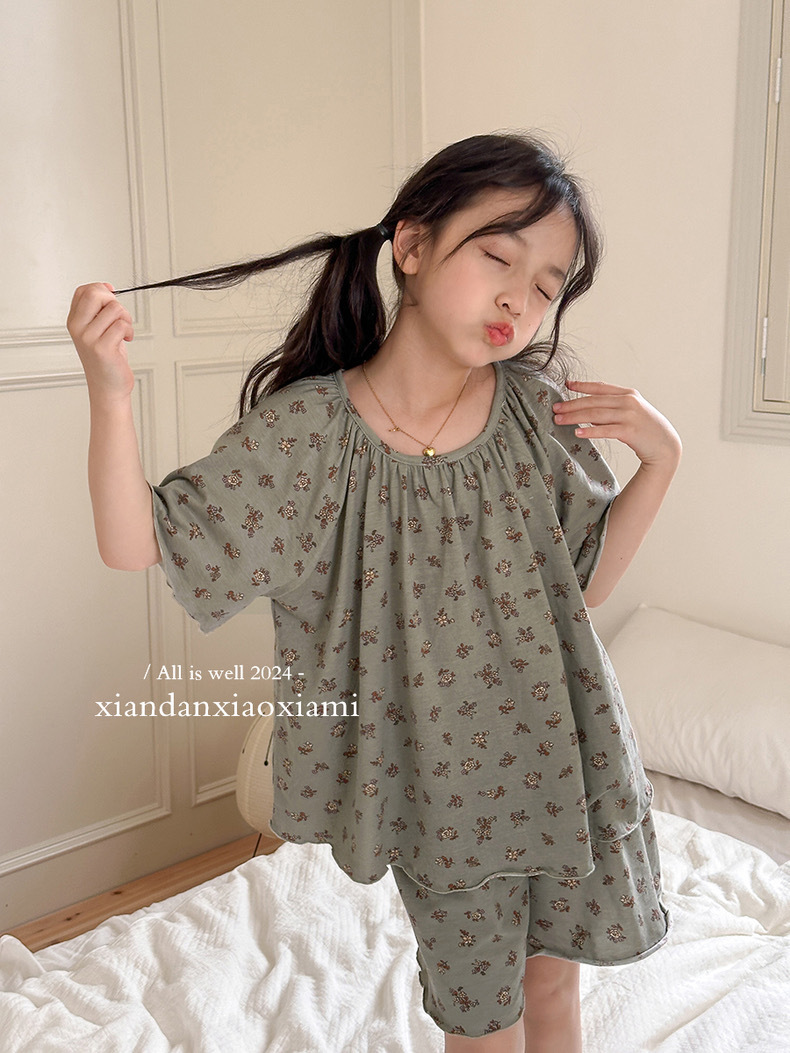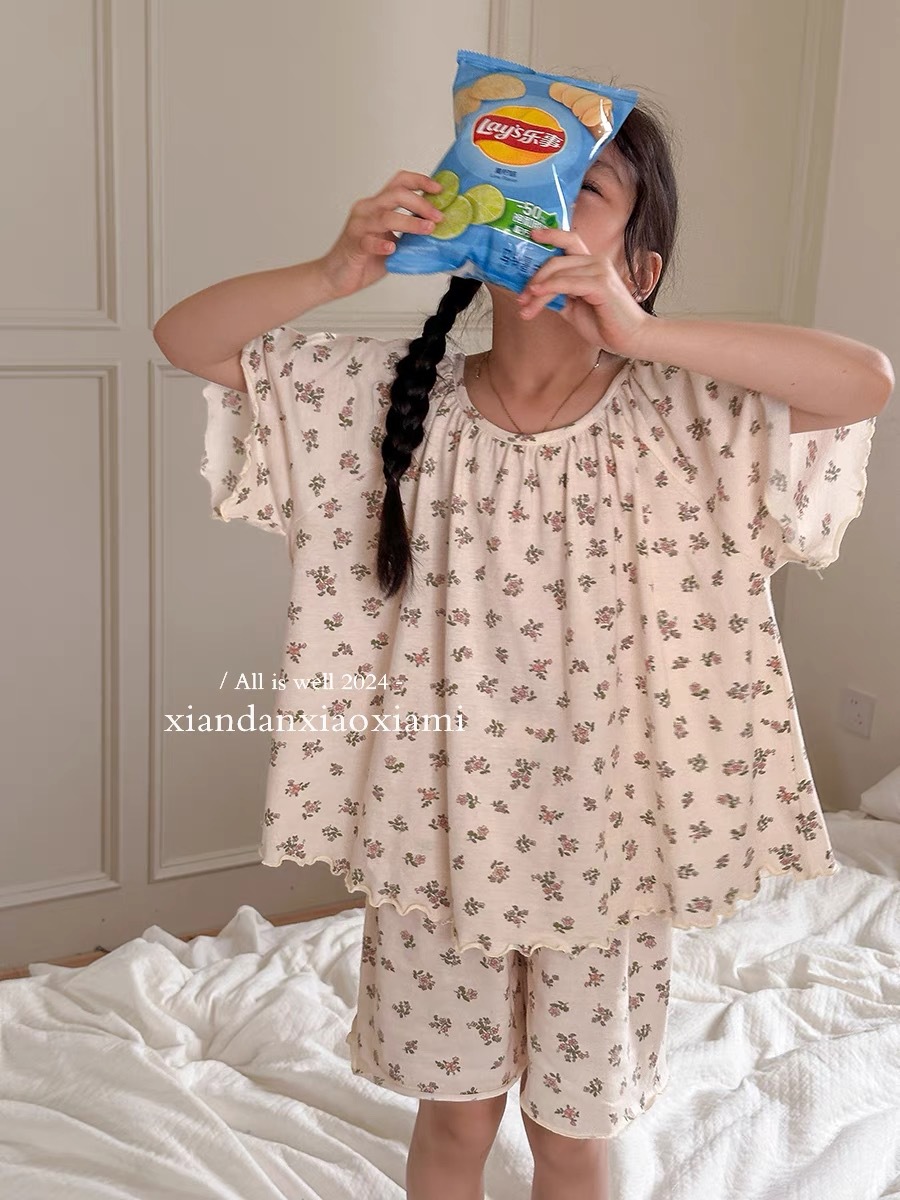 어린이 잠옷 여름 꽃무늬 반팔 얇은 스타일 아동 여아 중대형 어린이 에어컨 홈웨어 프린트 스타일