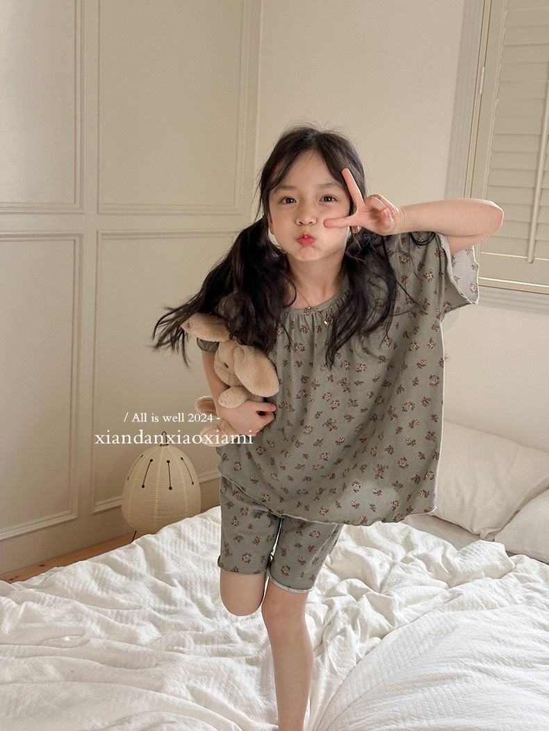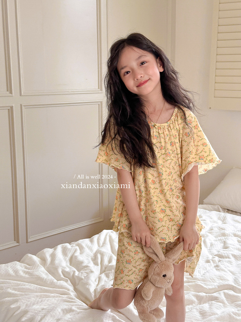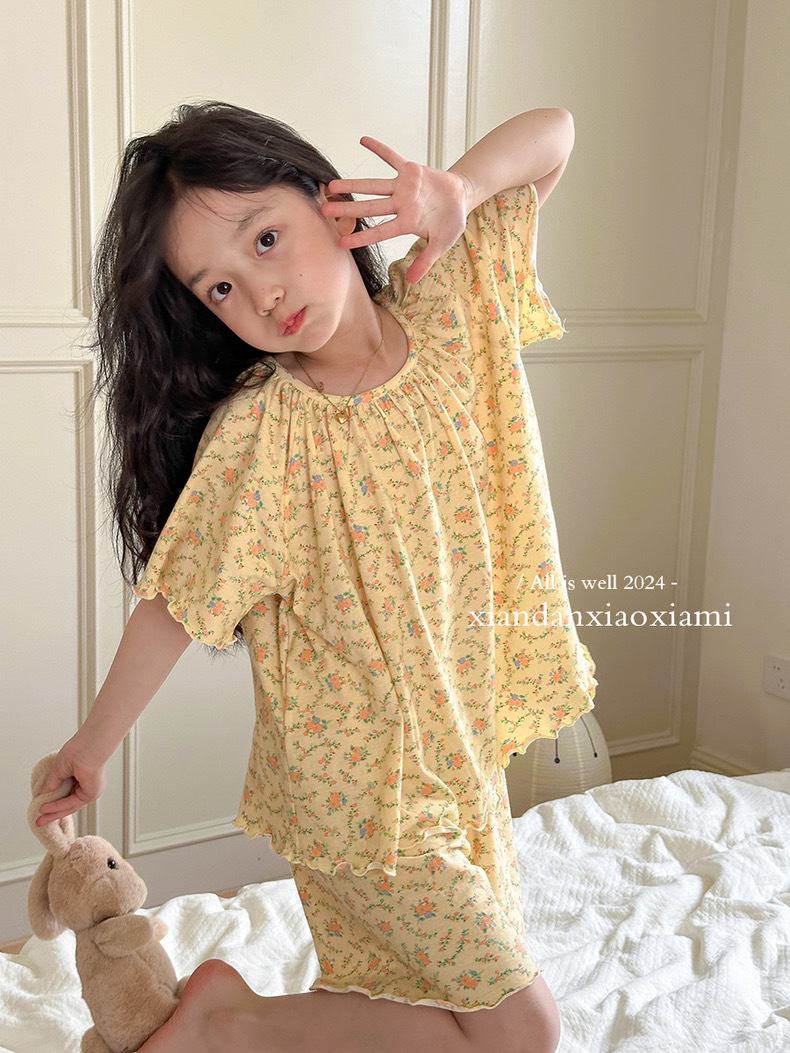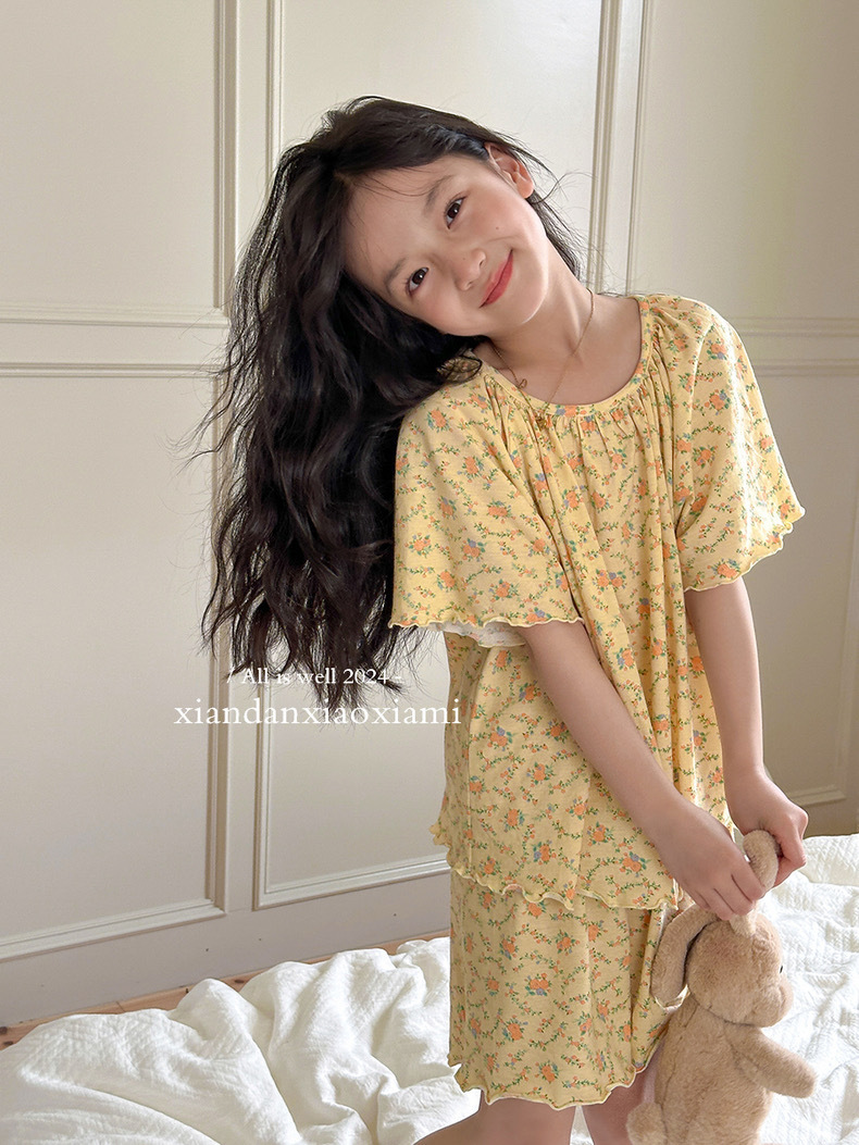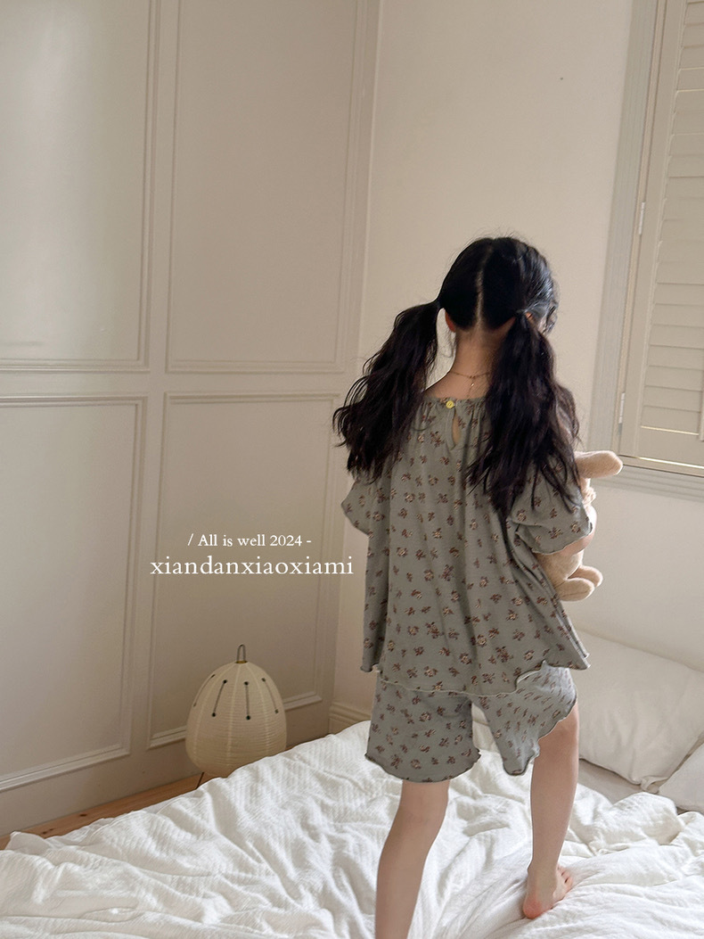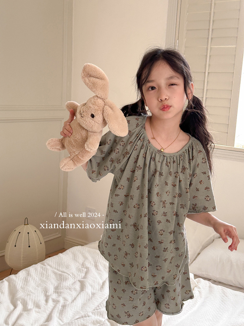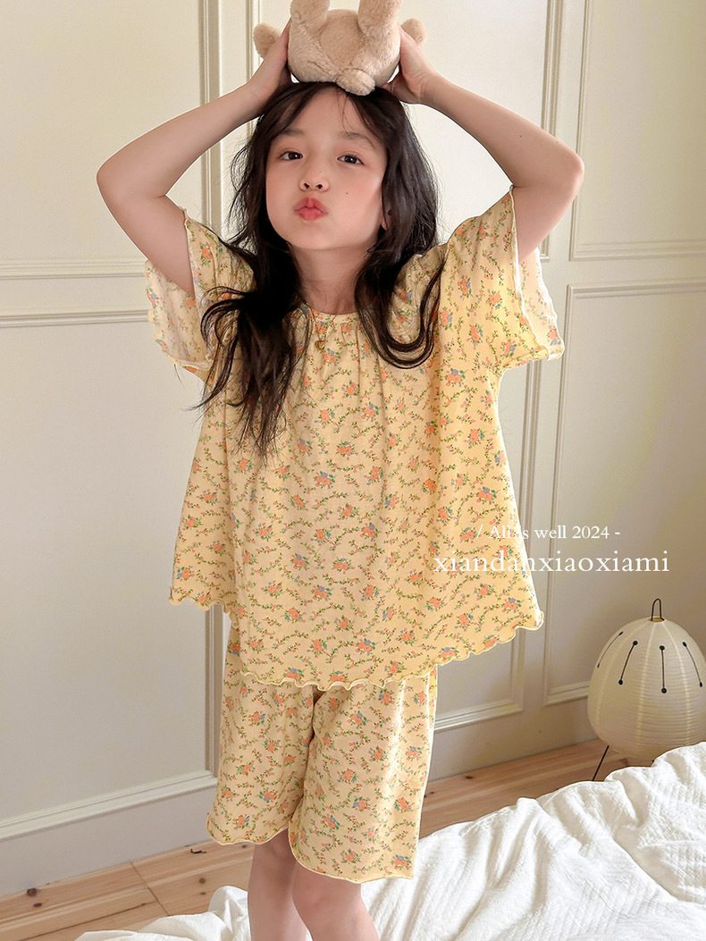 어린이 잠옷 여름 꽃무늬 반팔 얇은 스타일 아동 여아 중대형 어린이 에어컨 홈웨어 프린트 스타일