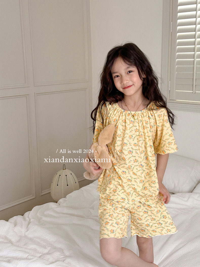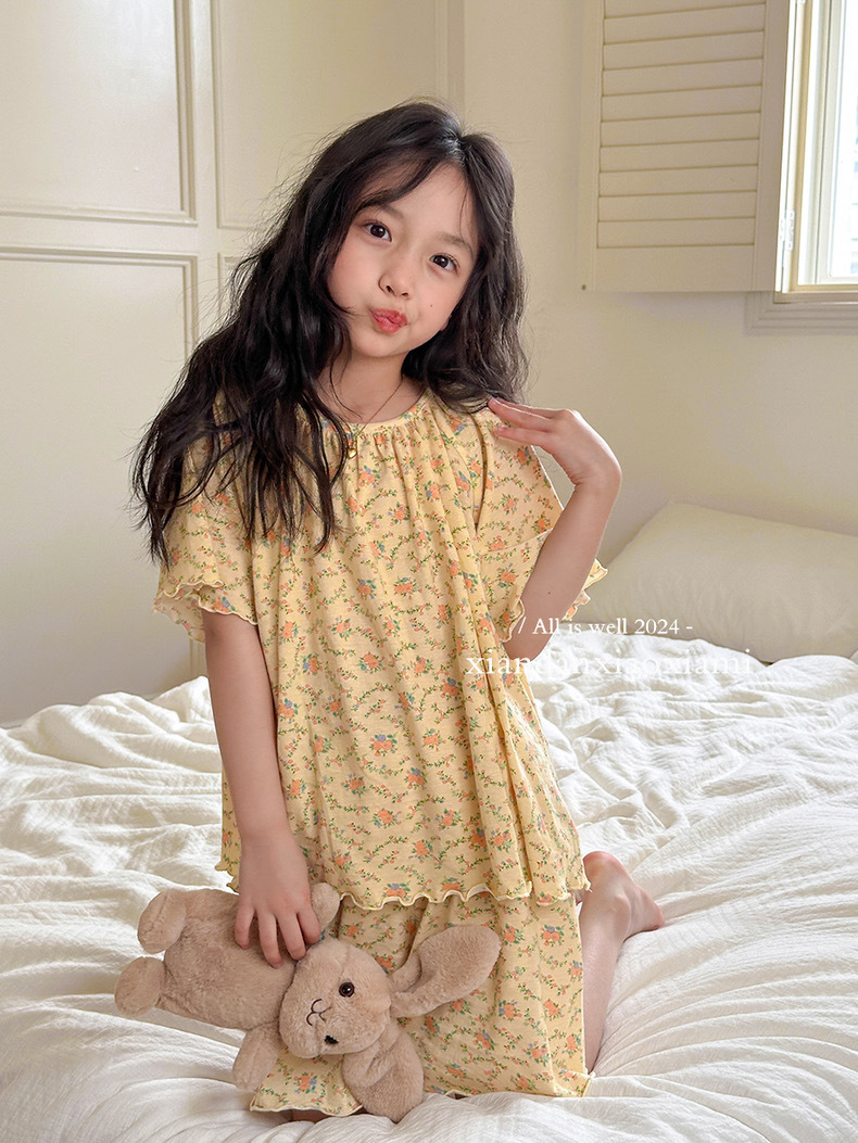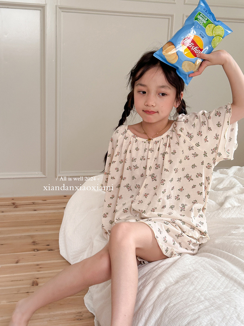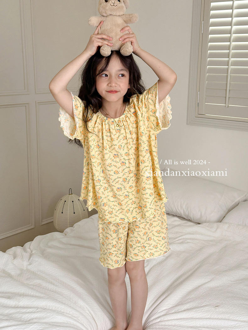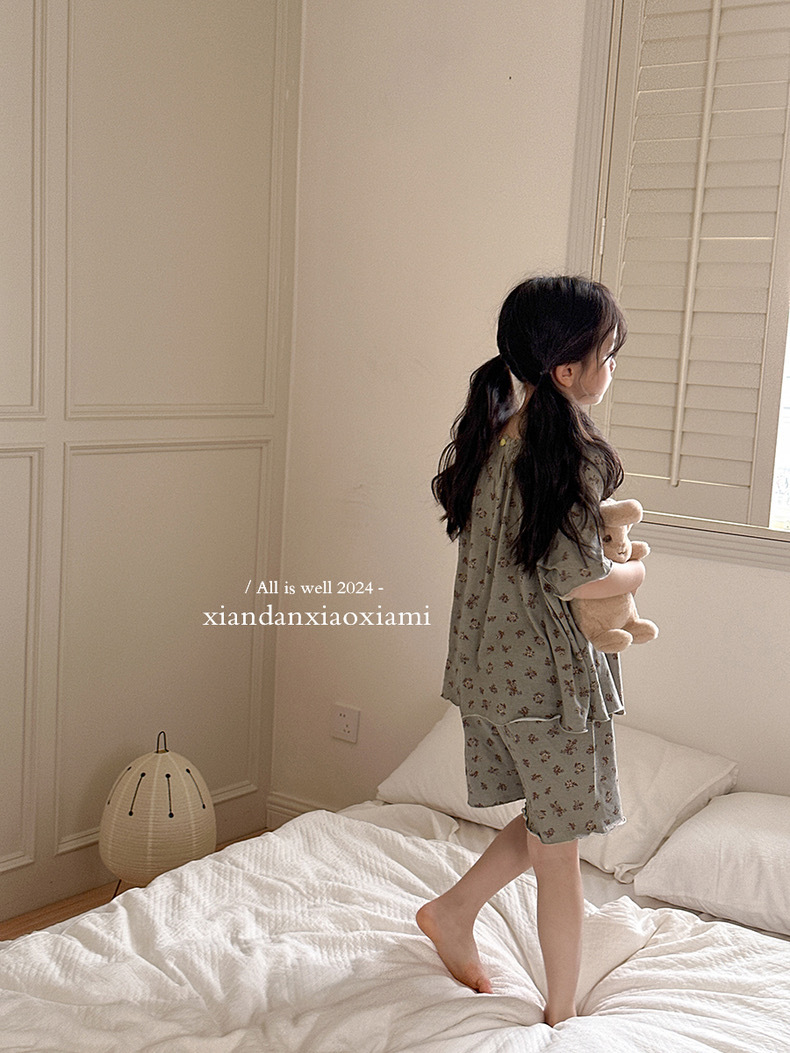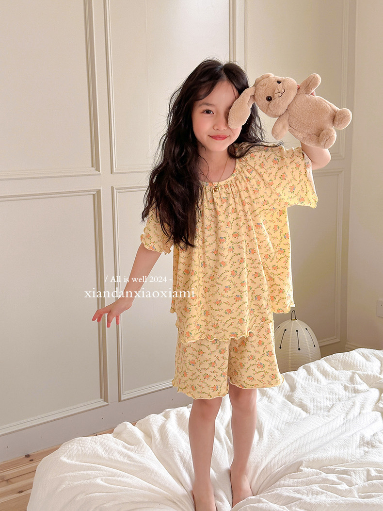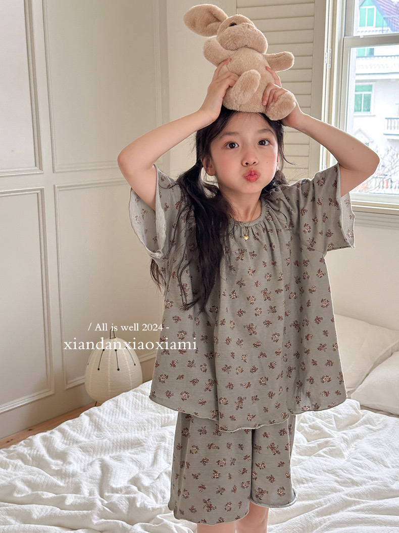 어린이 잠옷 여름 꽃무늬 반팔 얇은 스타일 아동 여아 중대형 어린이 에어컨 홈웨어 프린트 스타일