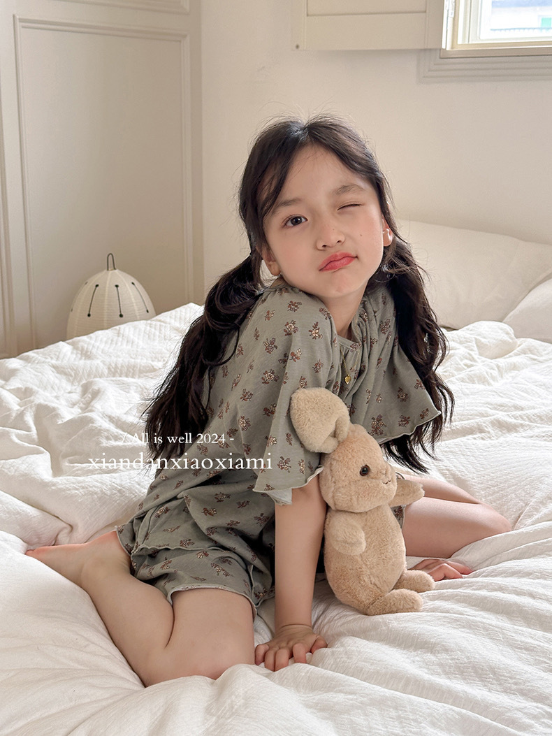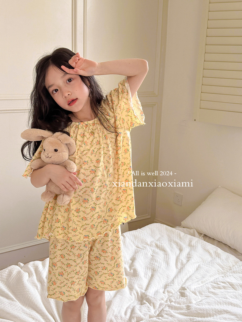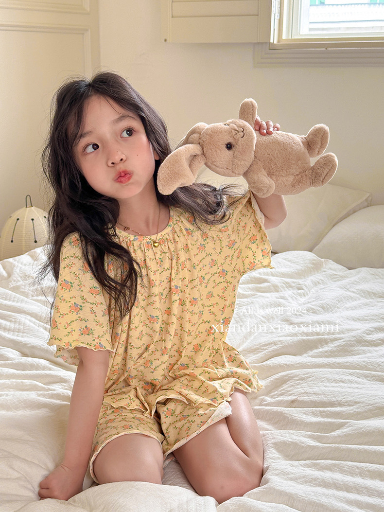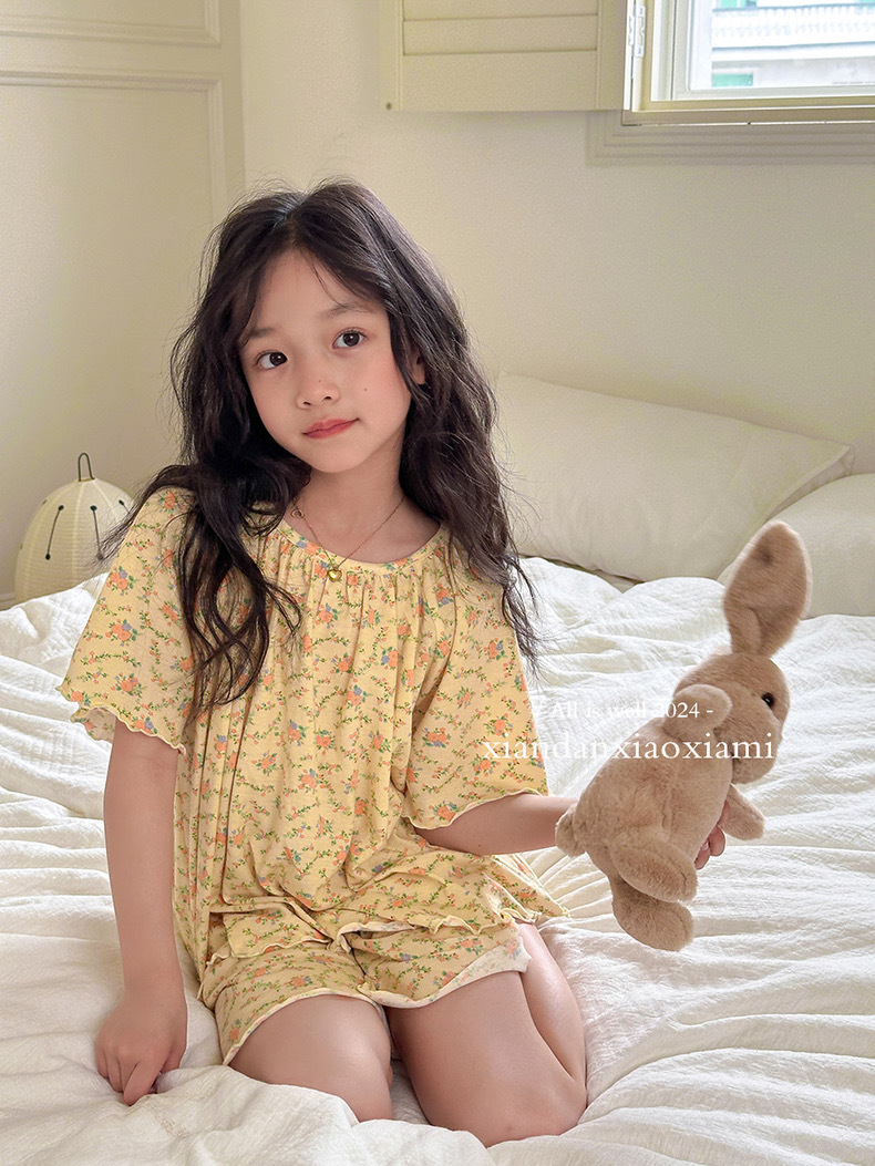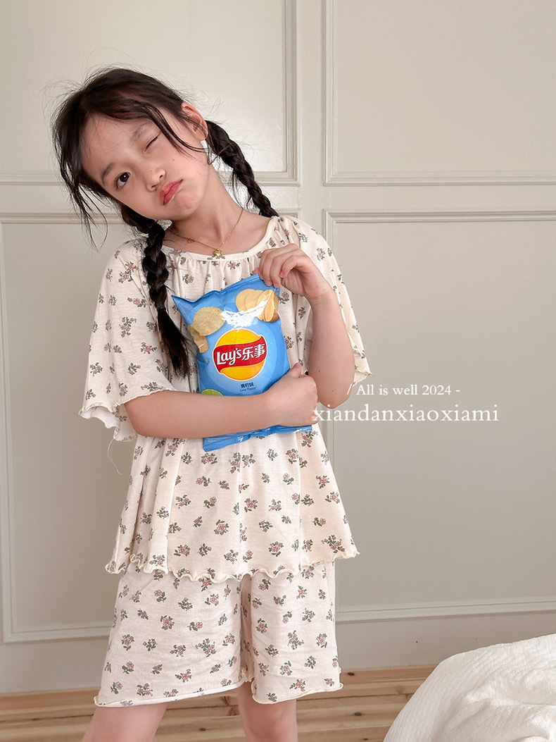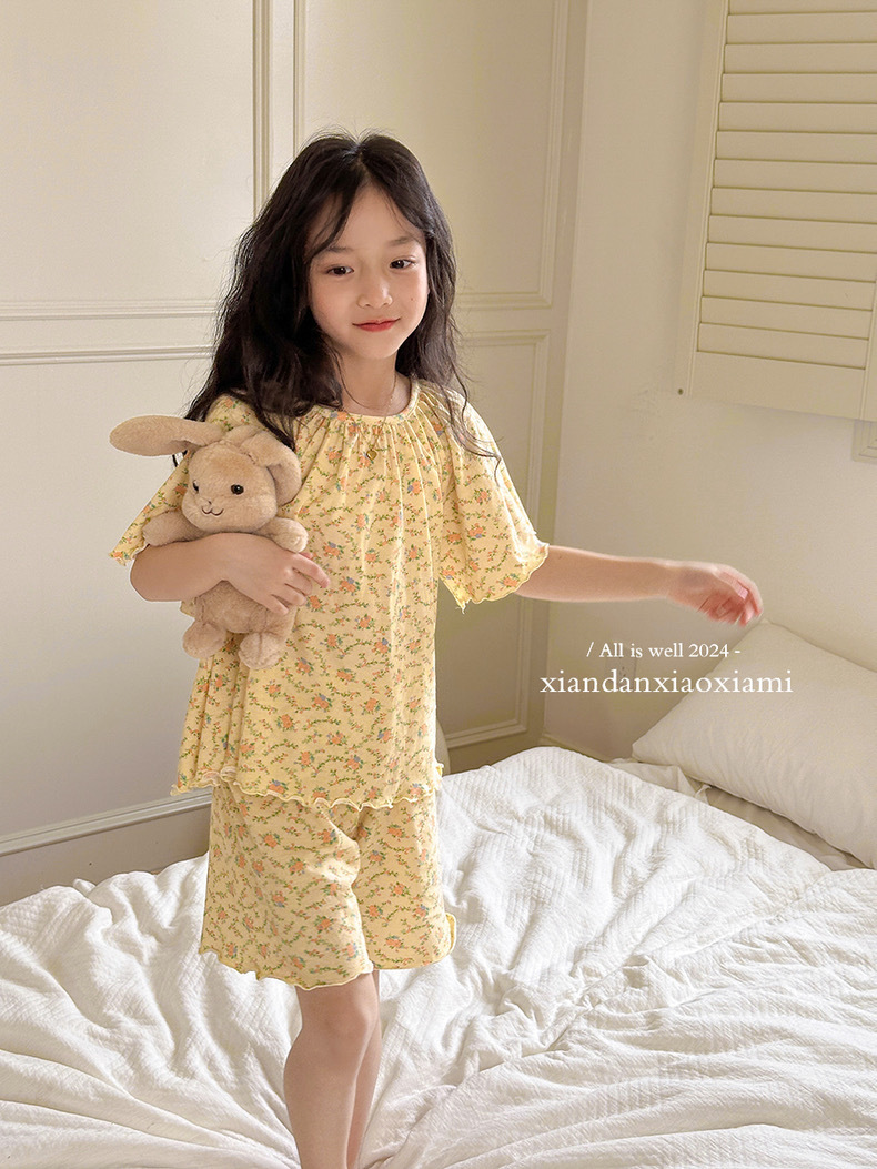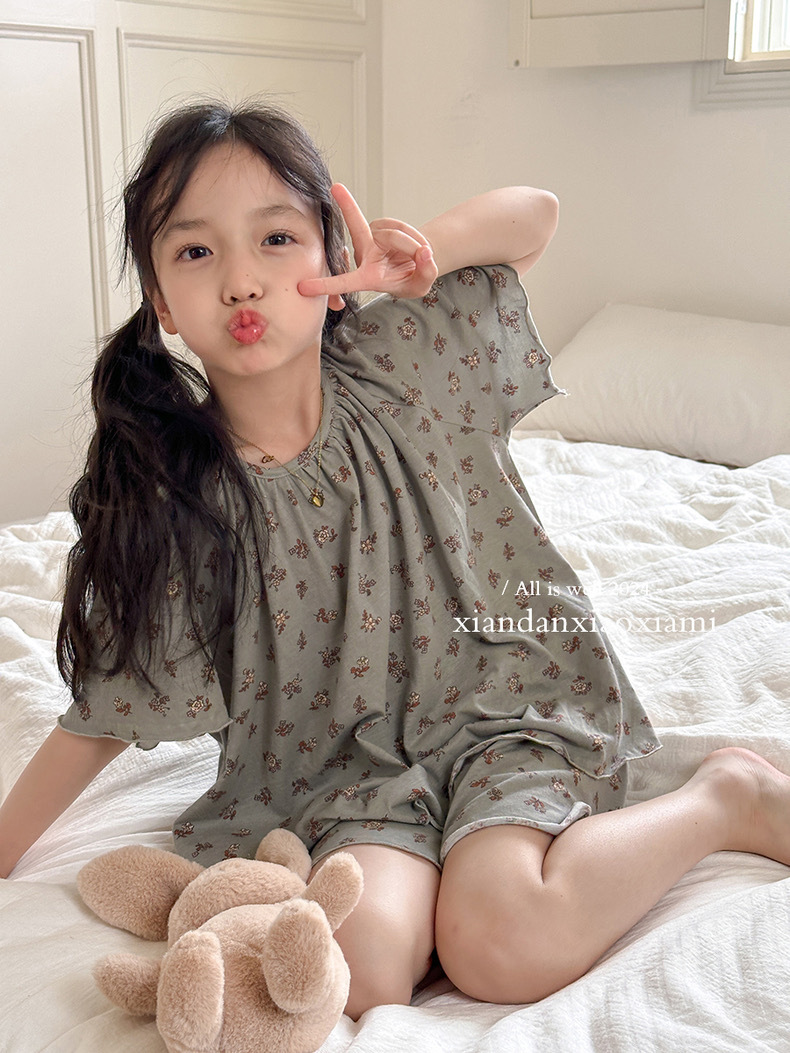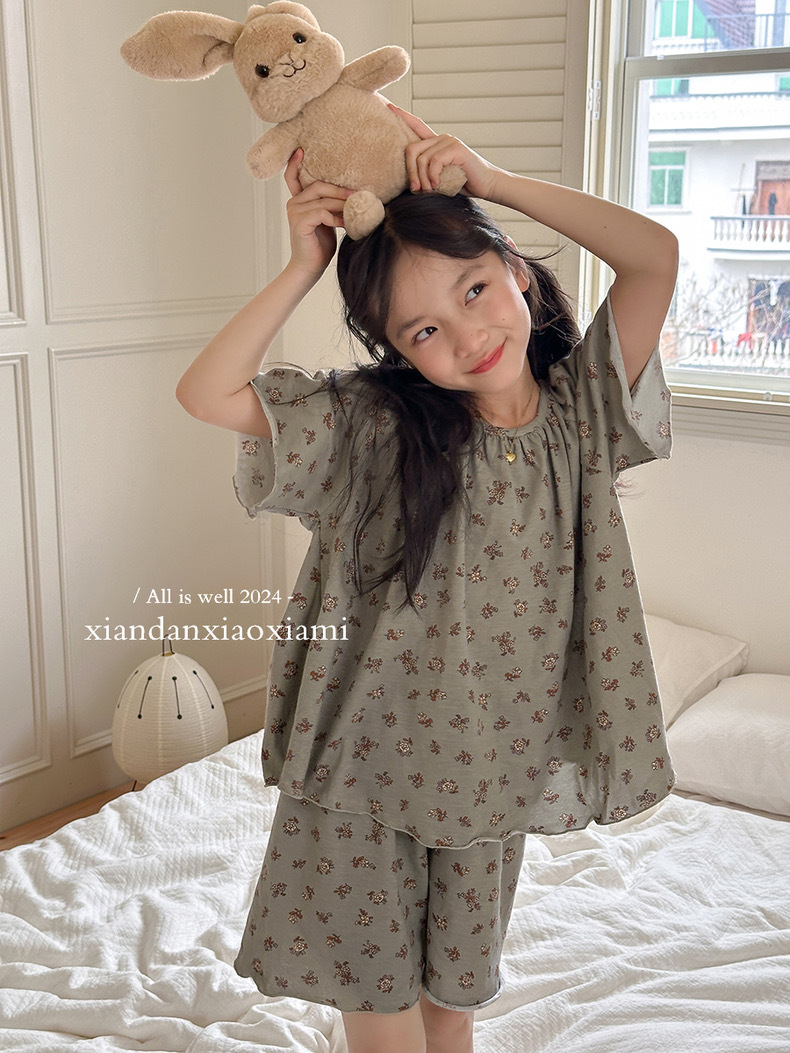 어린이 잠옷 여름 꽃무늬 반팔 얇은 스타일 아동 여아 중대형 어린이 에어컨 홈웨어 프린트 스타일