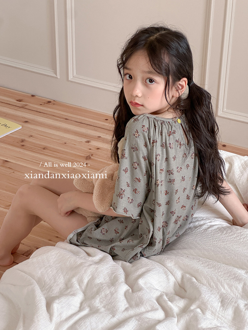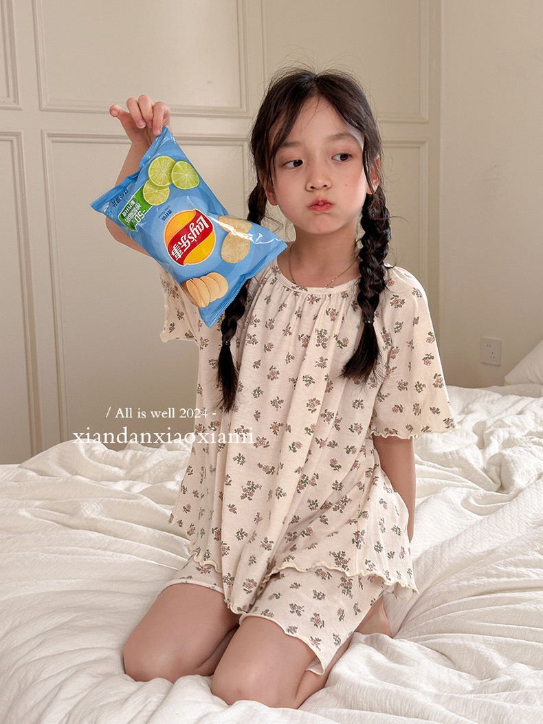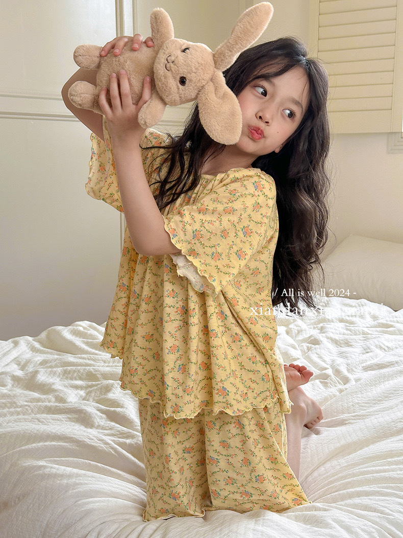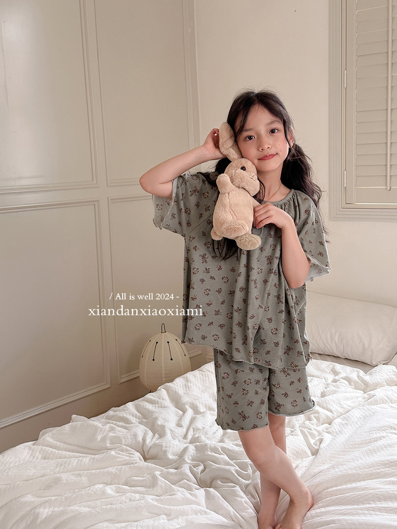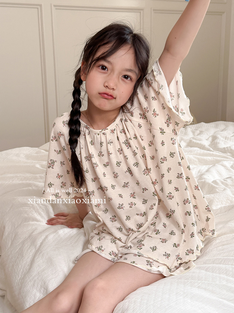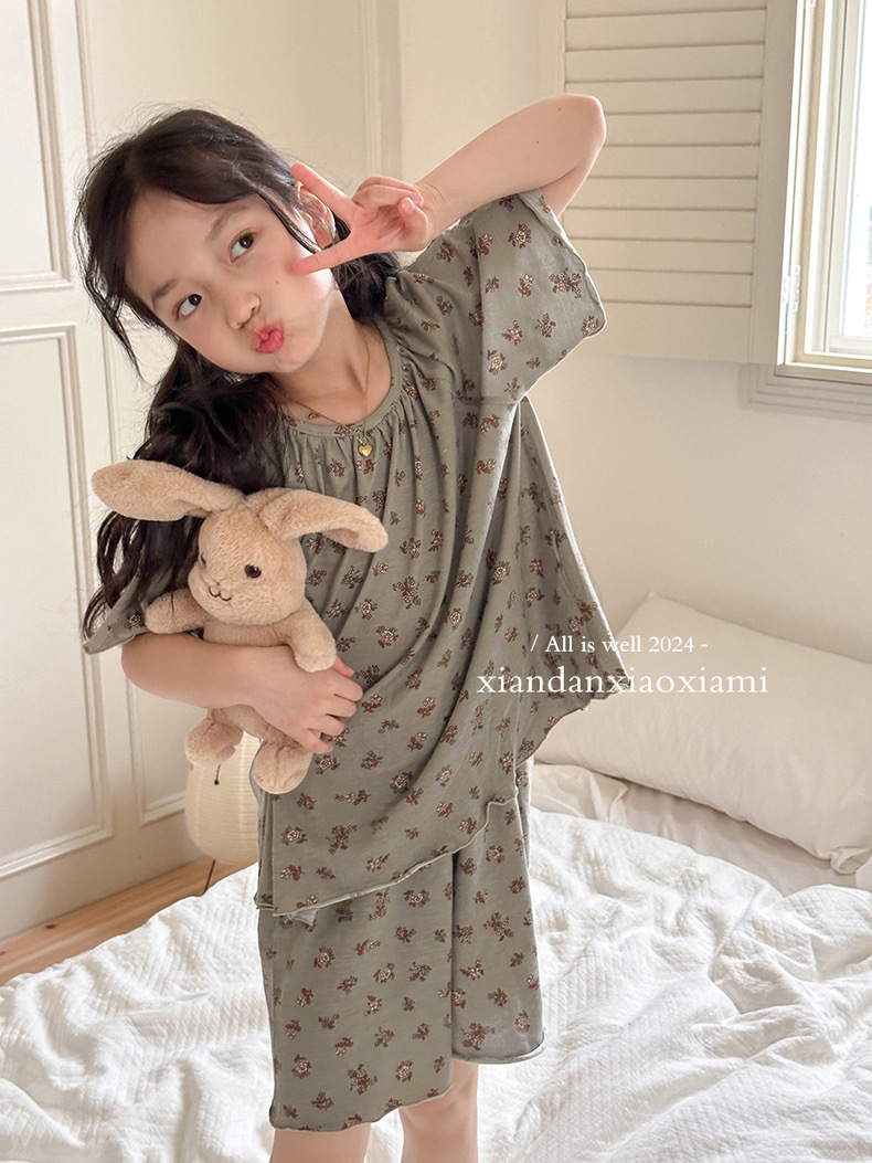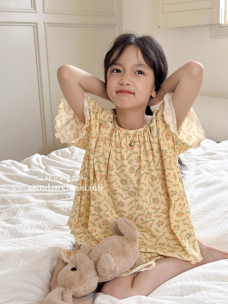 어린이 잠옷 여름 꽃무늬 반팔 얇은 스타일 아동 여아 중대형 어린이 에어컨 홈웨어 프린트 스타일