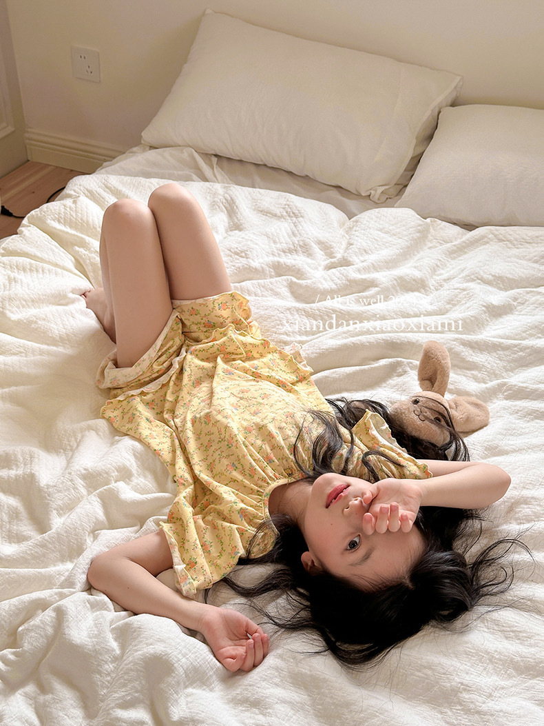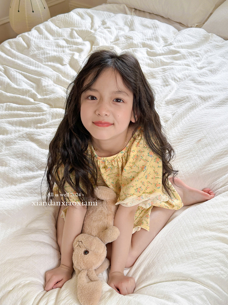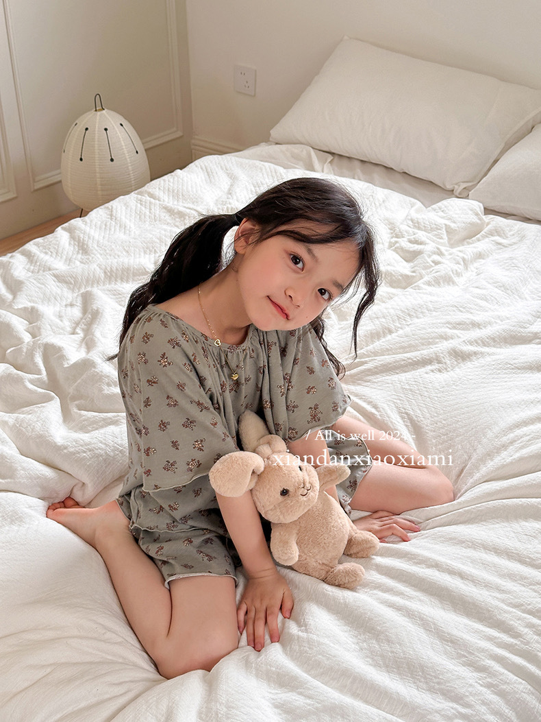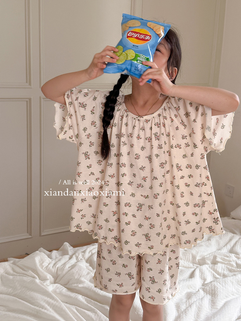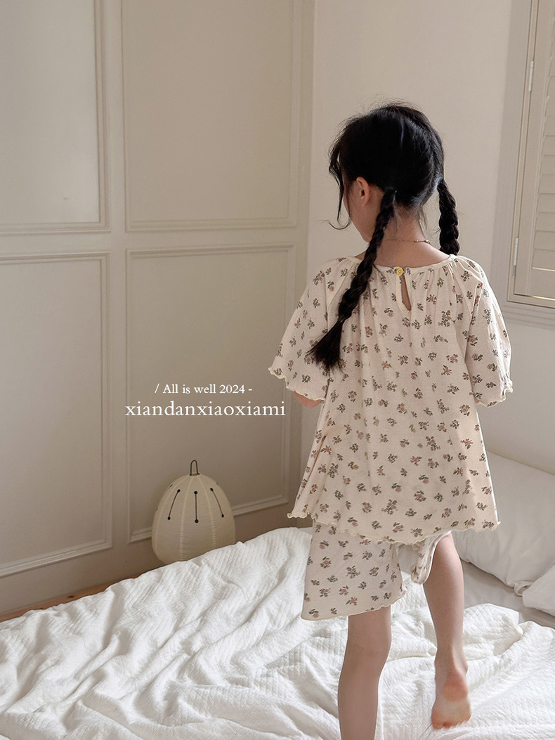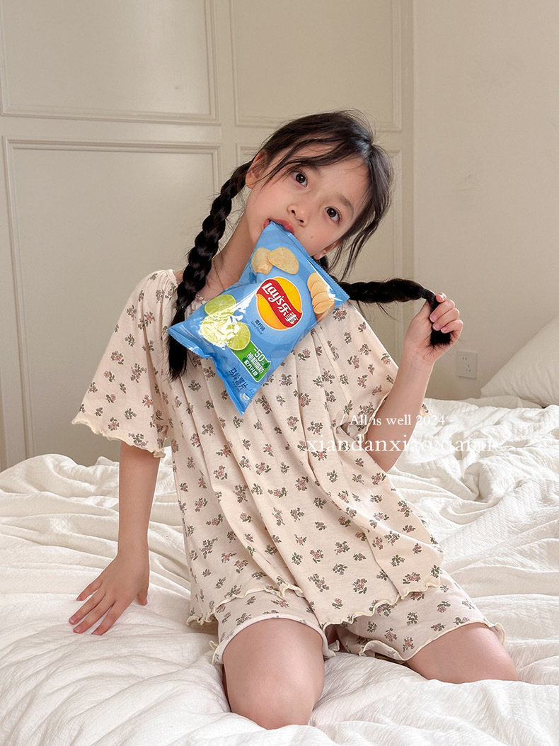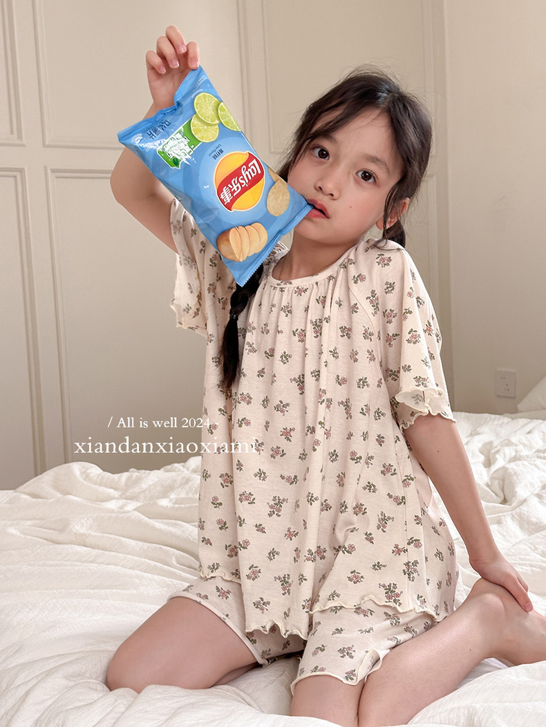 어린이 잠옷 여름 꽃무늬 반팔 얇은 스타일 아동 여아 중대형 어린이 에어컨 홈웨어 프린트 스타일