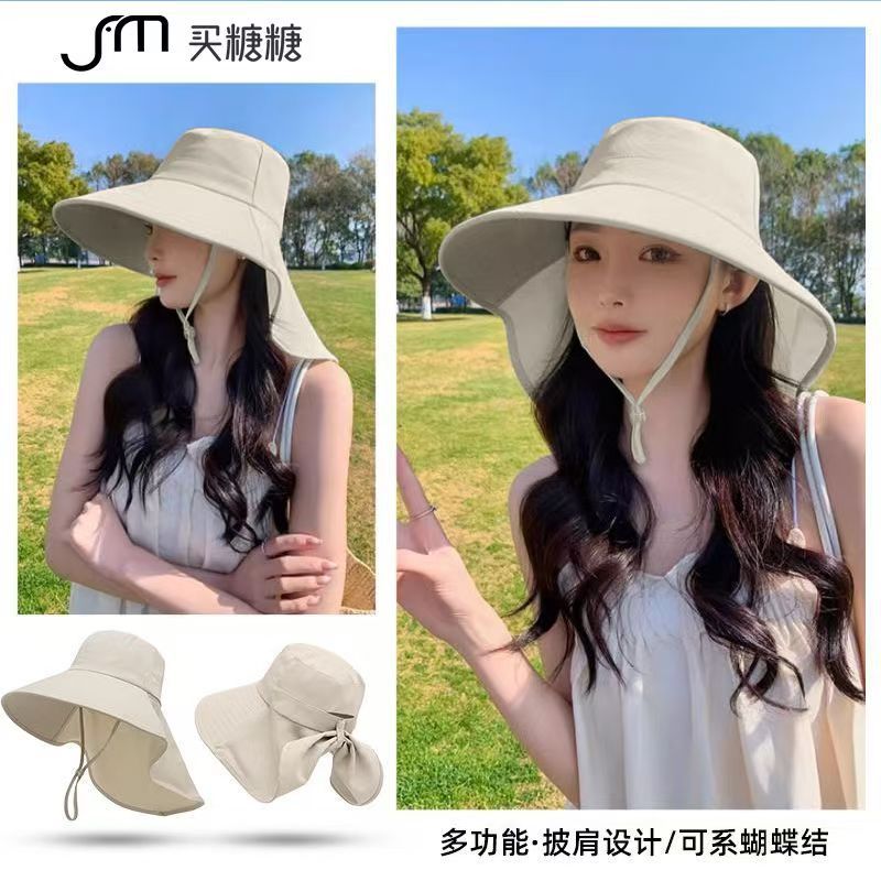 2025 년 새로운 여름은 포니 테일 큰 테두리 태양 모자 여성의 안티 자외선 목 어부 모자 선 스크린 모자를 묶을 수 있습니다.스토어 가기
