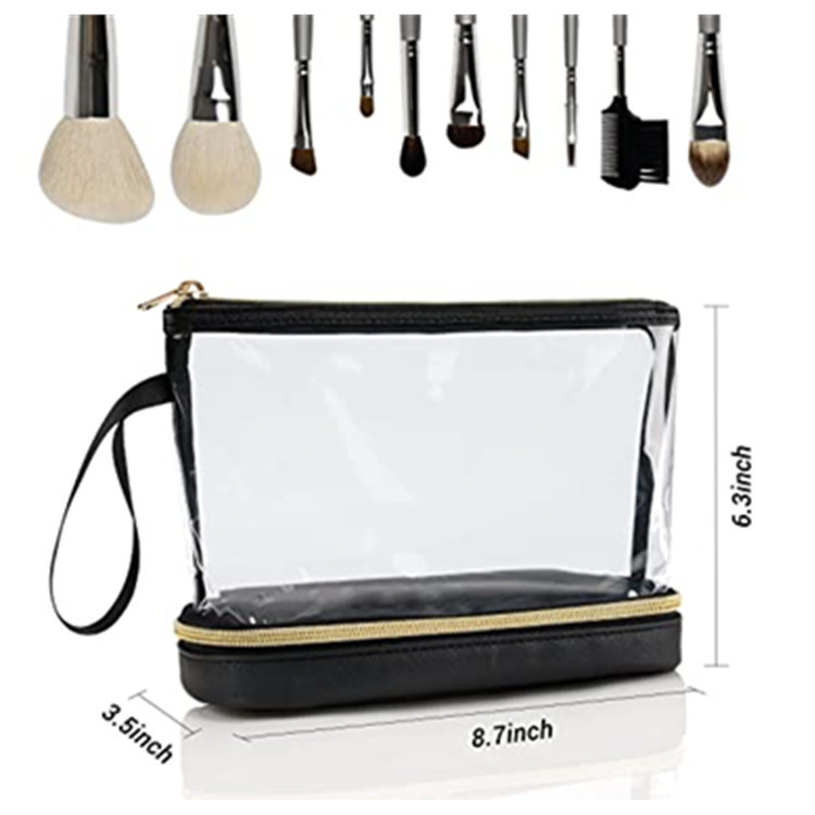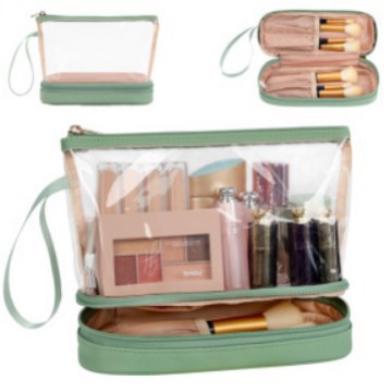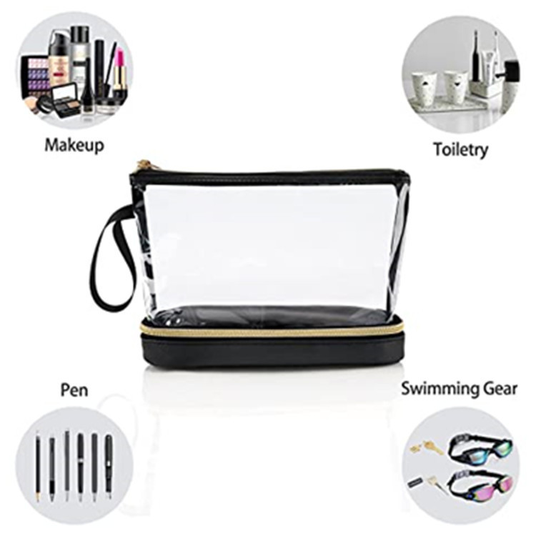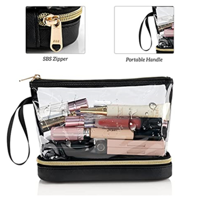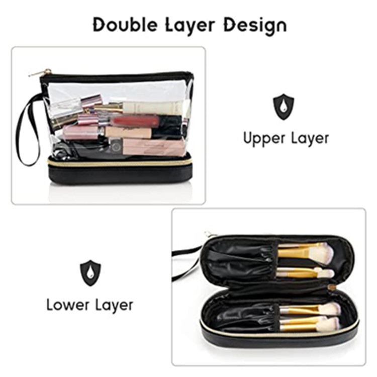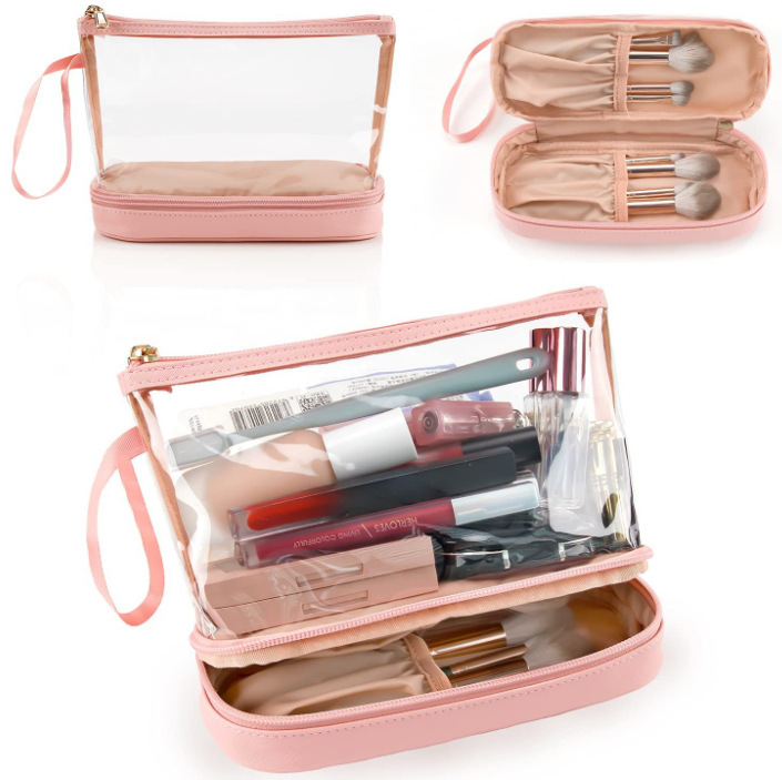재고 아마존 투명 PVC 화장품 가방 더블 레이어 디자인 방수 여행 화장품 가방 방수 파티션 화장실 가방