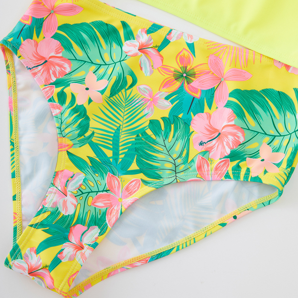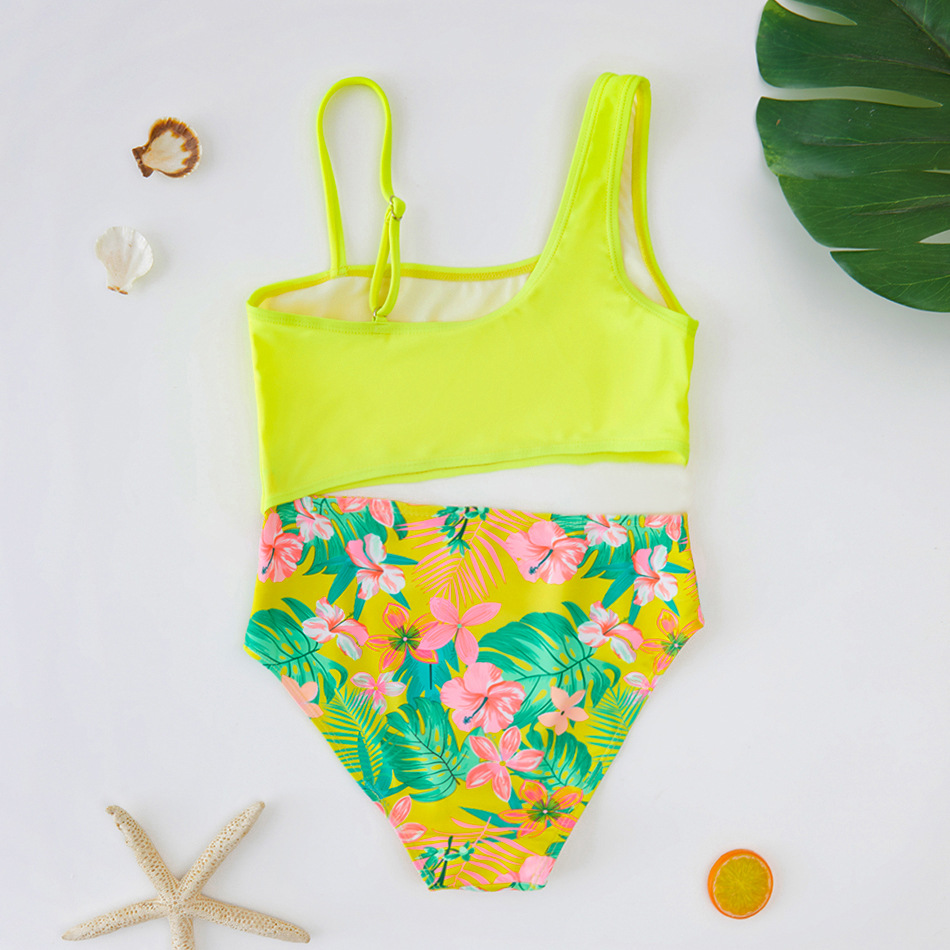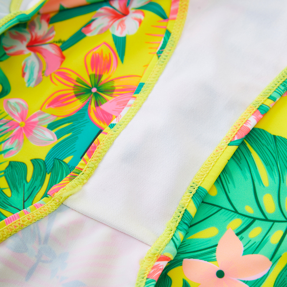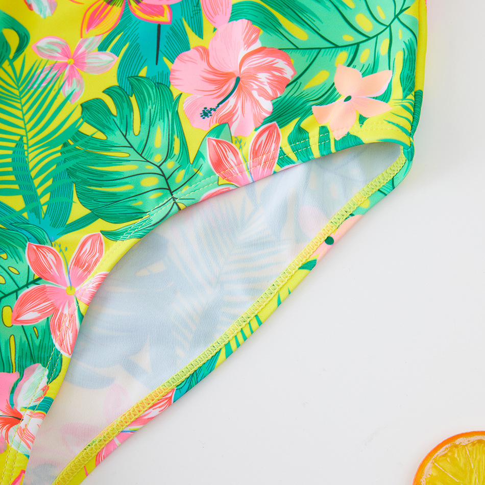2025 새로운 여자 원피스 수영복 노란색 꽃 누출 허리 큰 어린이 원피스 수영복스토어 가기
