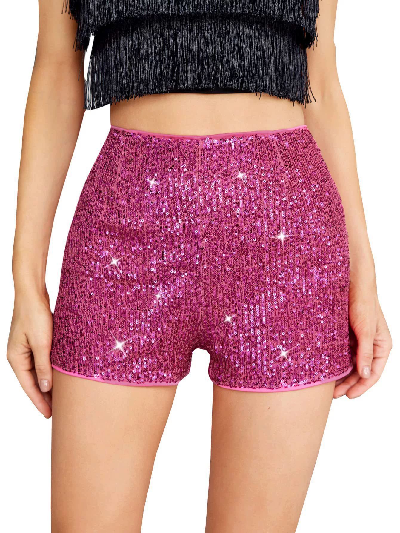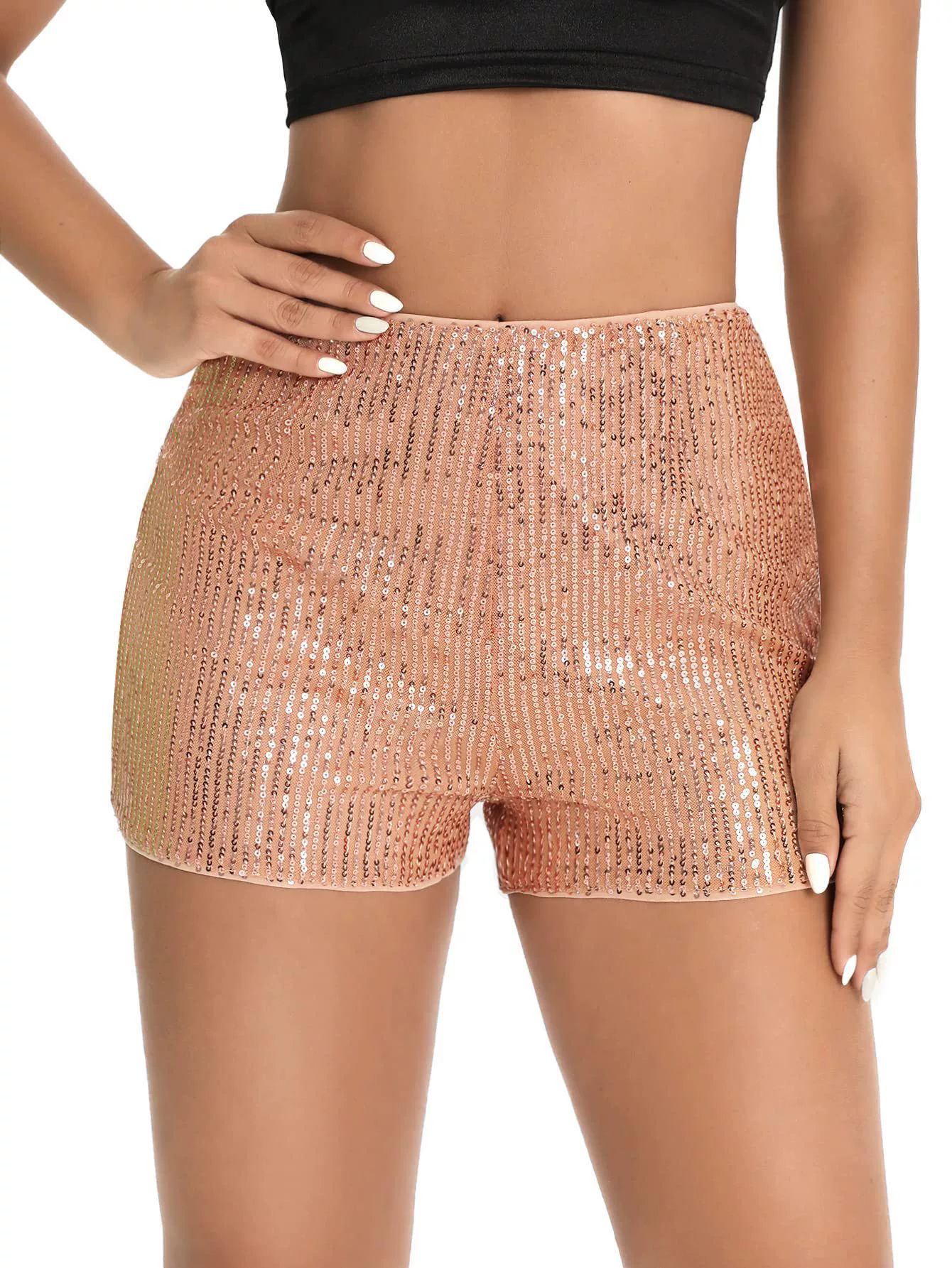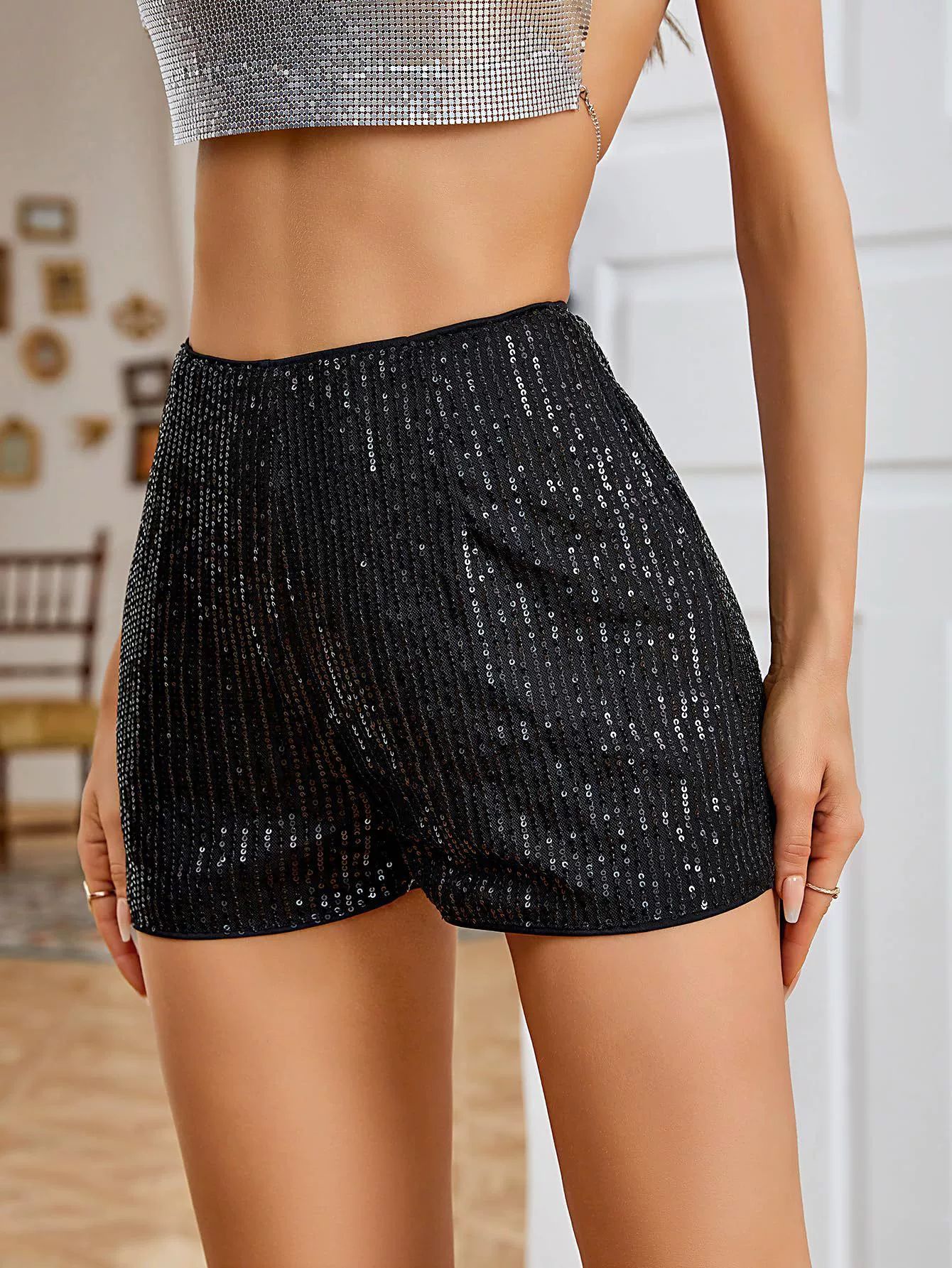 2025 아마존 멀티 컬러 패션 비드 슬림 핏 핫 팬츠 스퀸 솔리드 컬러 블랙 미드 웨이스트 섹시한 스트레이트 여성 반바지스토어 가기