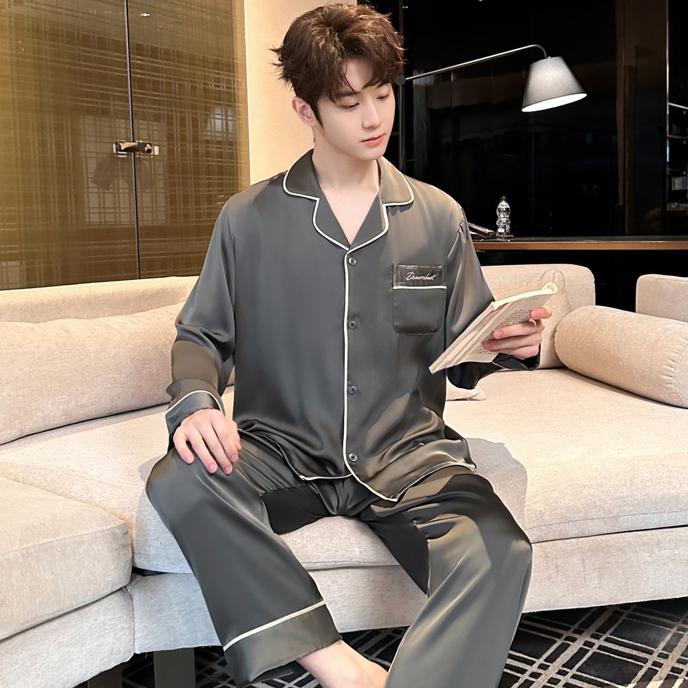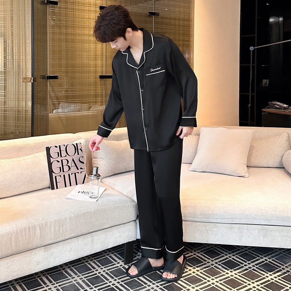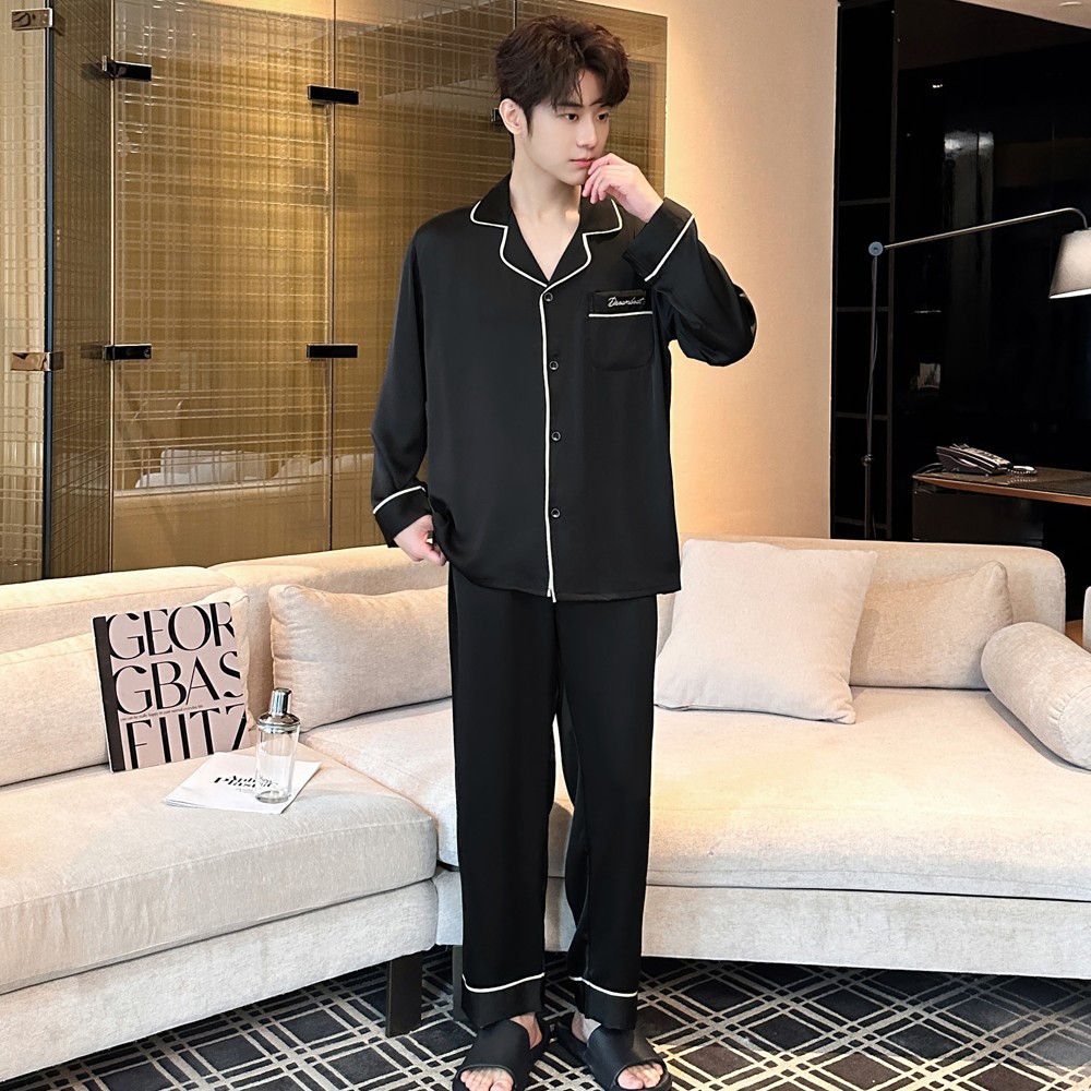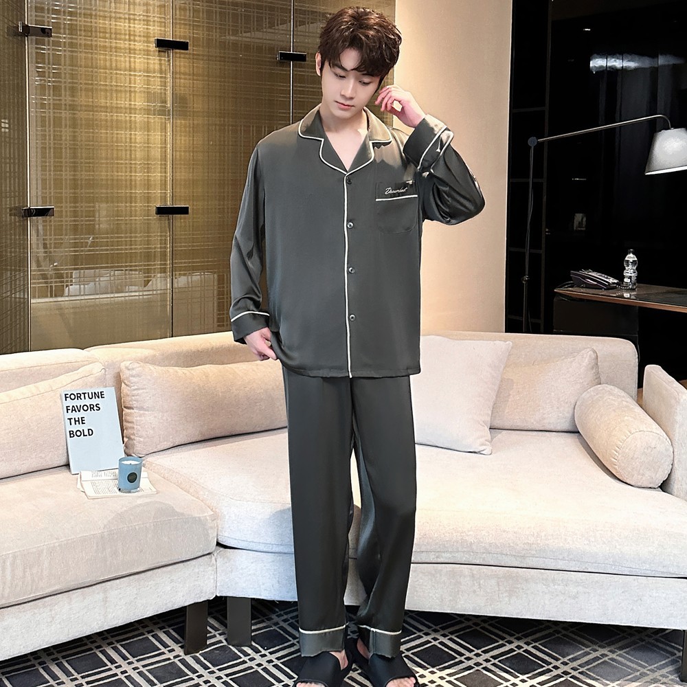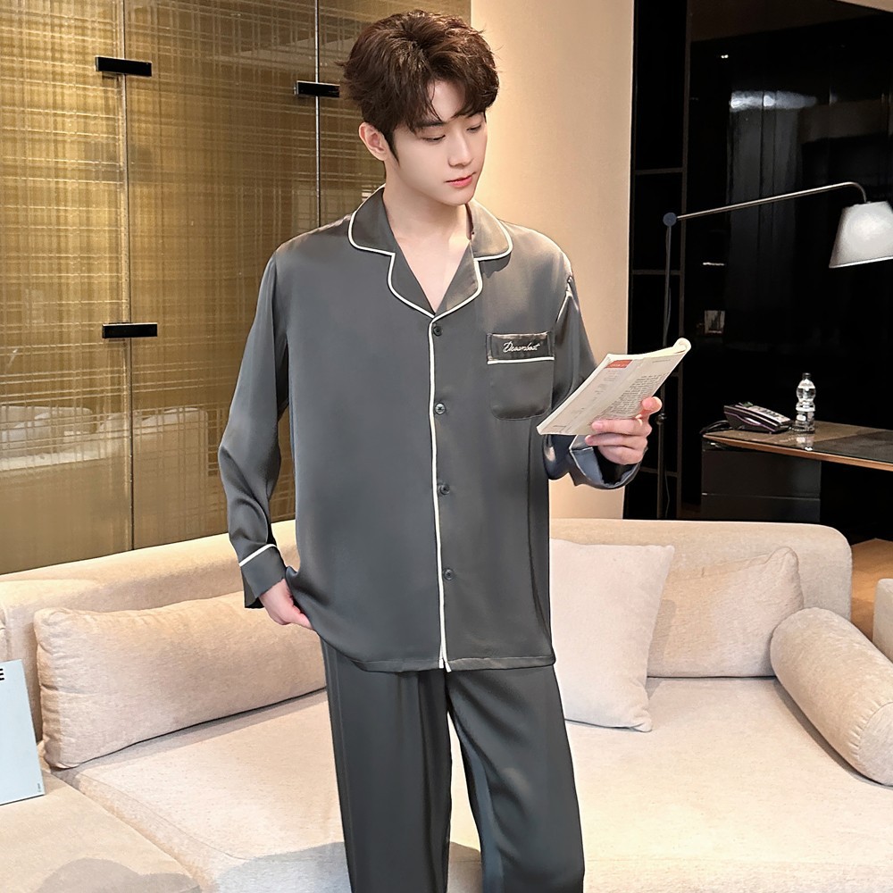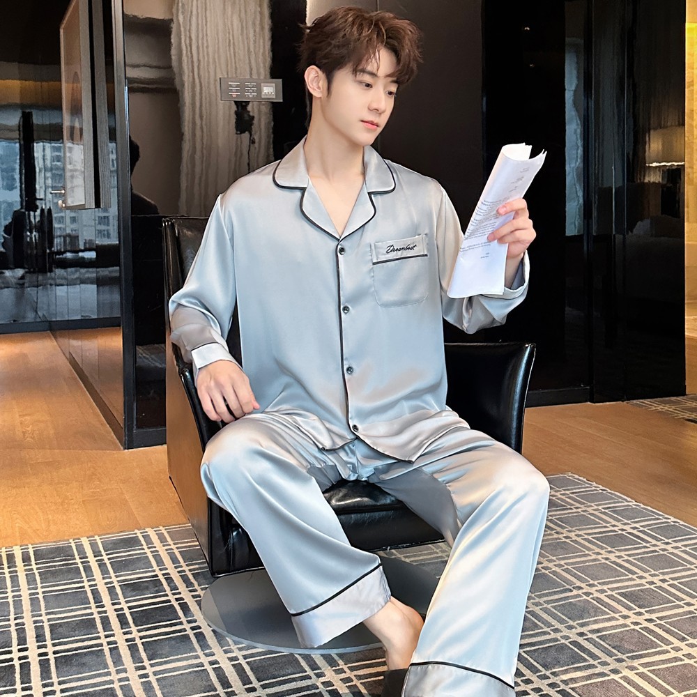 2025 새로운 고급 아세트산 원단 남성 잠옷 간단한 얇은 긴팔 바지 세트